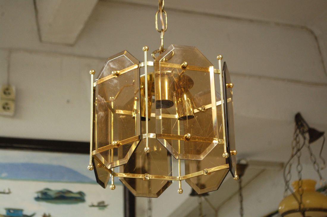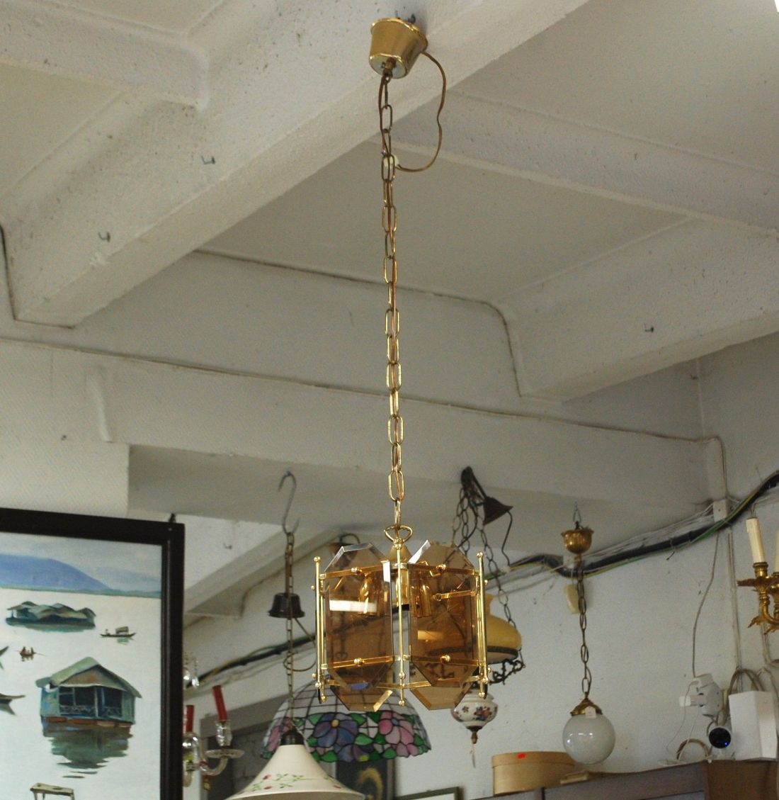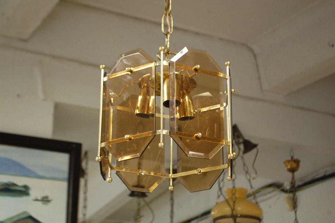 Mõõdud: 260 x 280mm, klaasidega kupli osa kõrgus 205mm, kogukõrgus ca 1120mm. Kullatooni metalldetailid, pruunikas-beeži tooniga lõigatud servade- ja klaaslõikega klaasdetailid. Taani disain. 3 x E 14 pirnipesa (elektripirnid ei kuulu komplekti). Viisakas korras. Elektri osa soovitav lasta enne kasutusele võttu elektrikul üle vaadata. Tarne pakiautoomaati