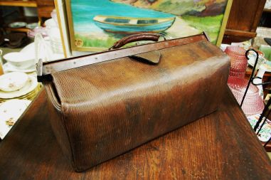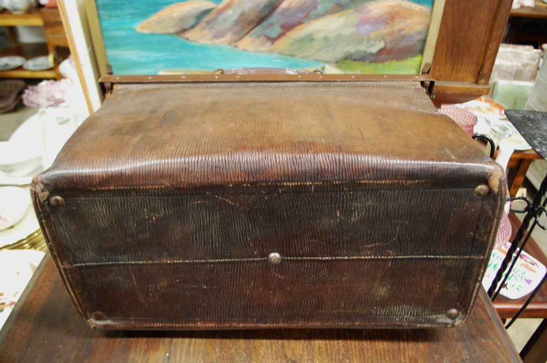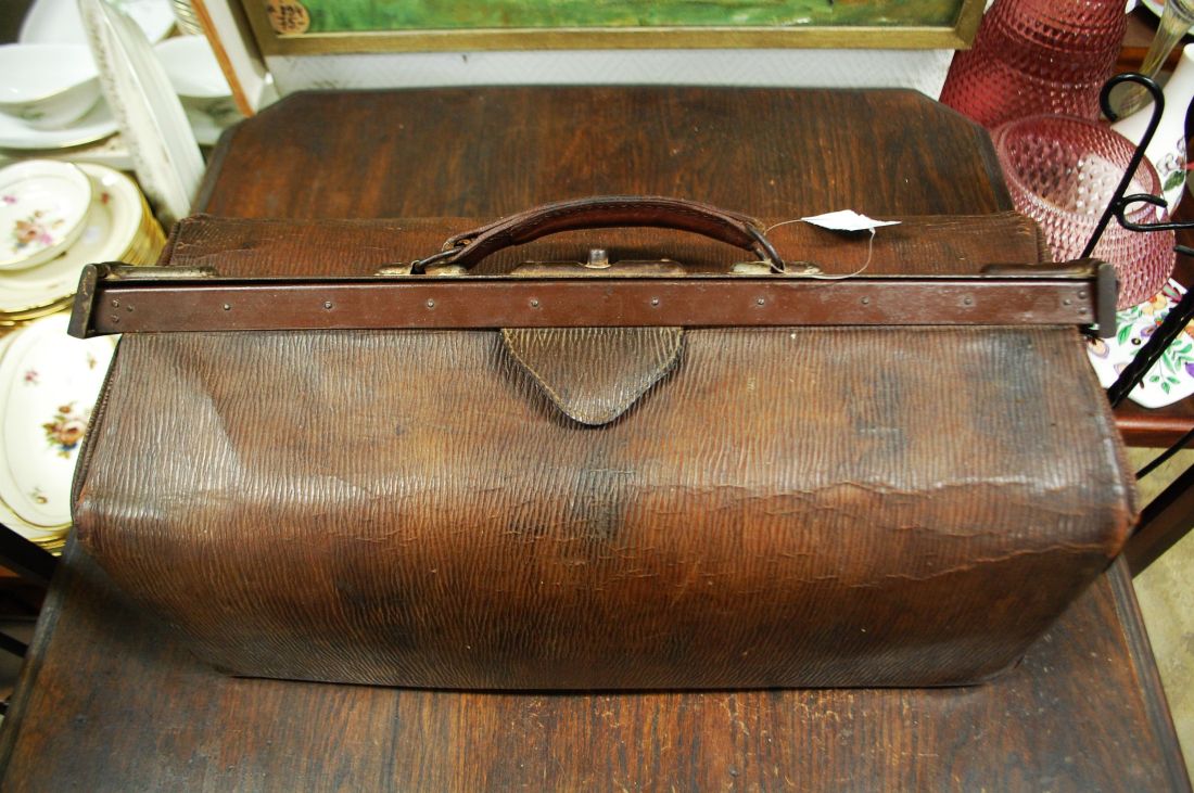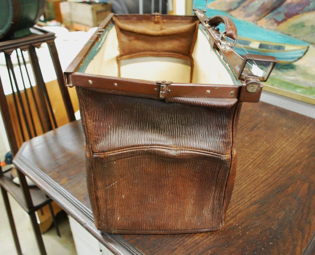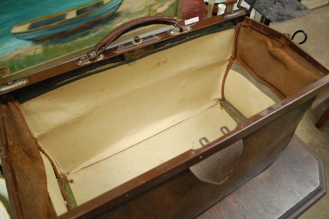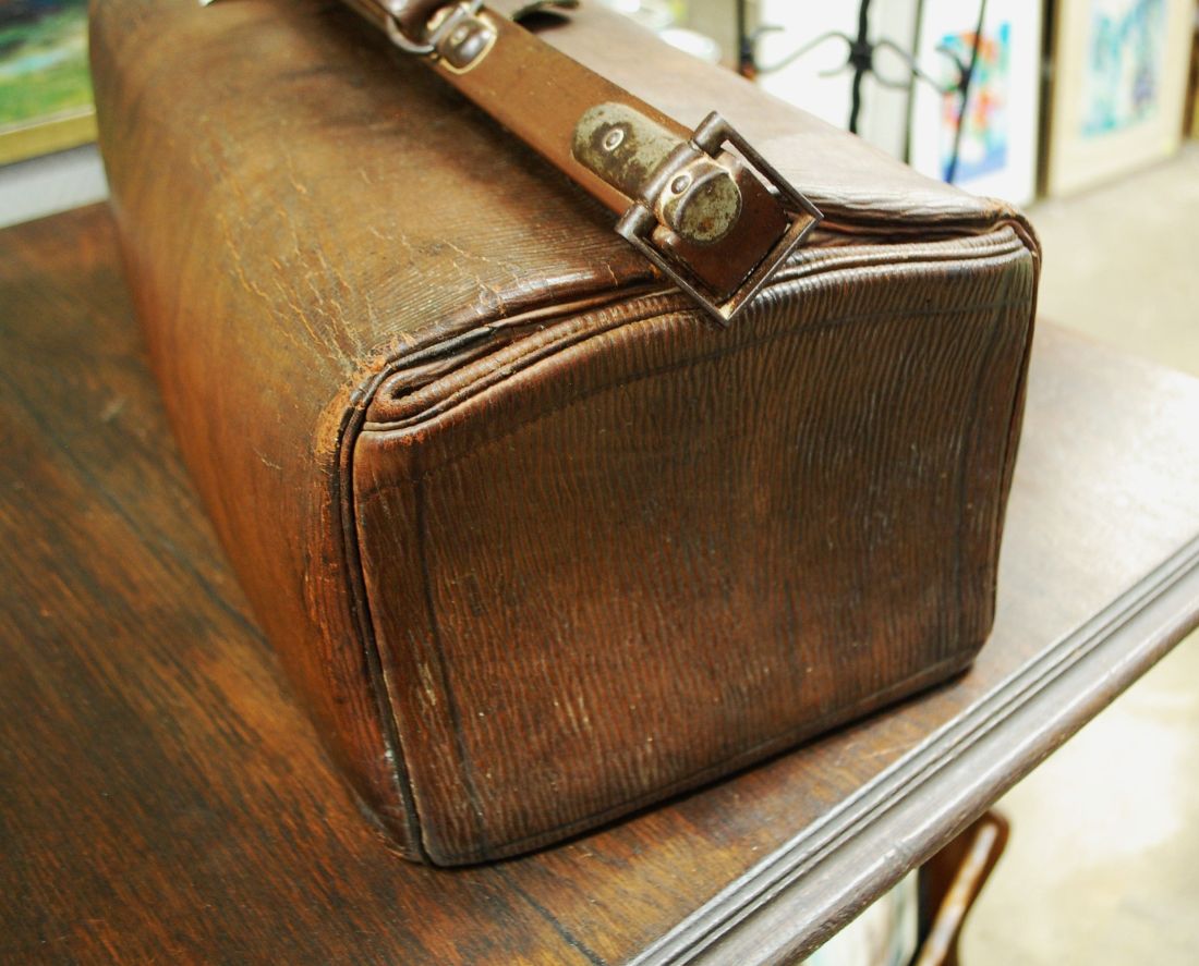 Mõõdud: 520 x 250mm, kõrgus 240mm, avatuna 320mm. Tumedam pruun stiilne nahast vana arstikott, seest osaliselt vormitud papiga. Tume metallraam, mis avatav otstest ja keskelt nupule vajutades. Esineb kriime, kulumist, erinevaid kasutustunnuseid. Tarne pakiautomaati