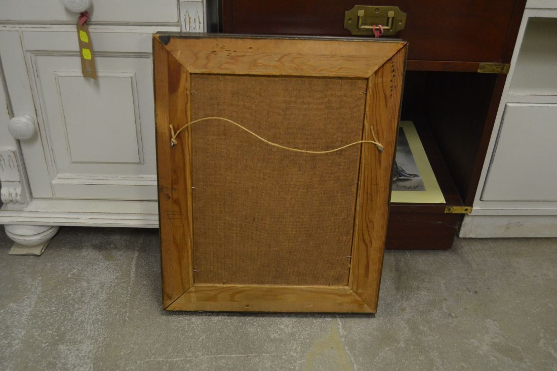 Mõõdud 360 x 455 mm. Raamitud , signeeritud soome papil maal. Mõned kriimud, täkked, kasutustunnused, raamil kuivamispraod. Tarne pakiautomaati
