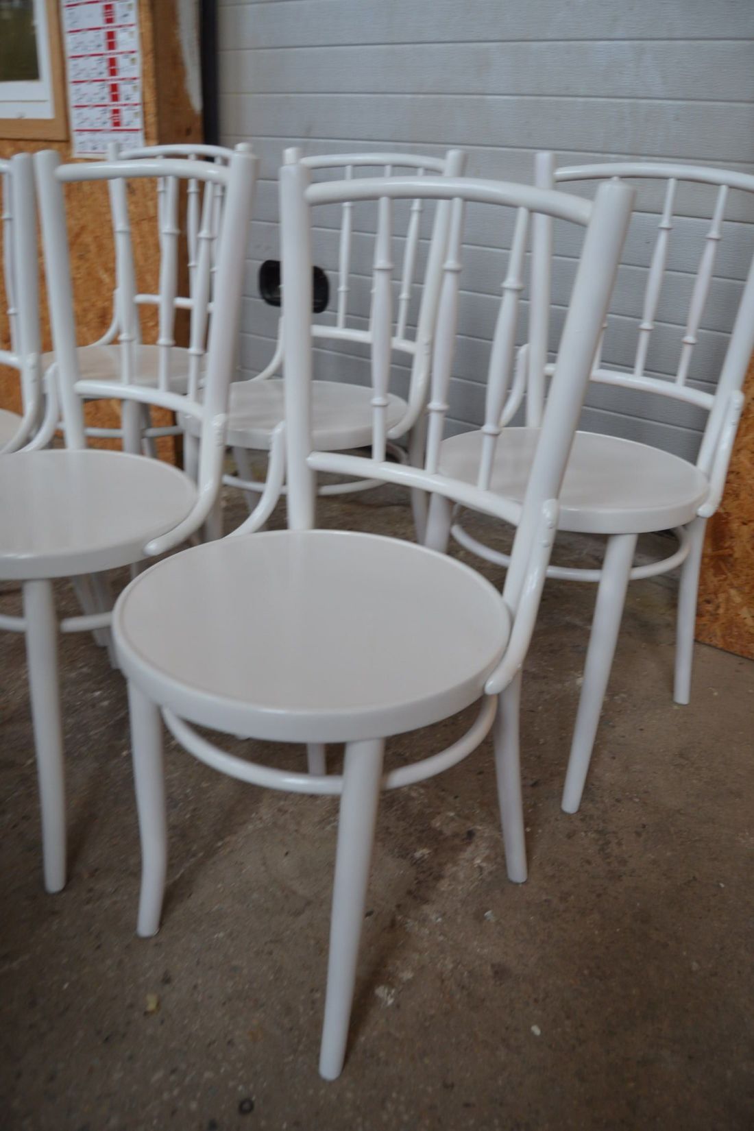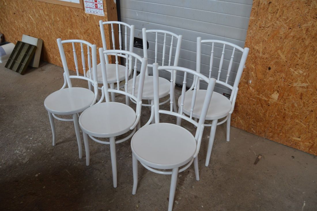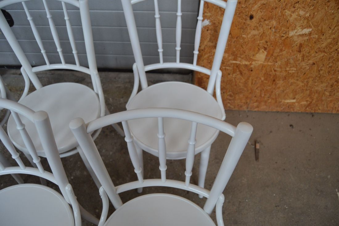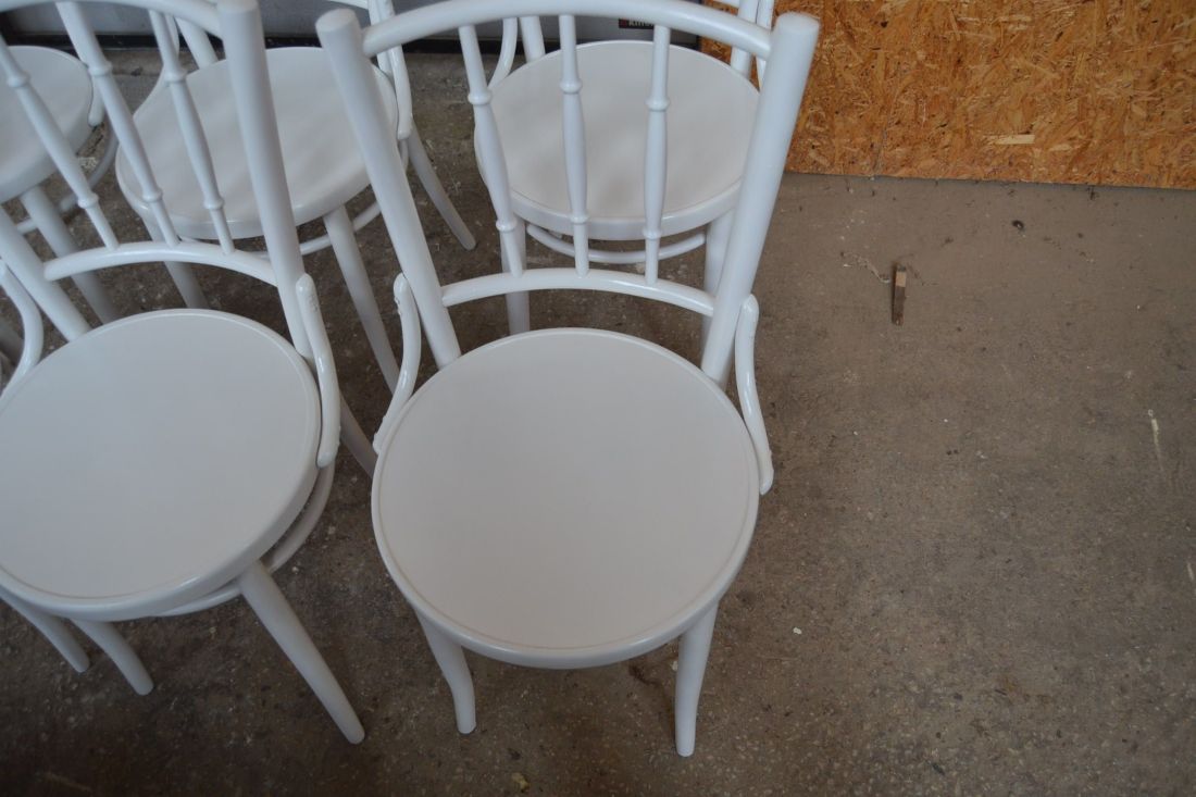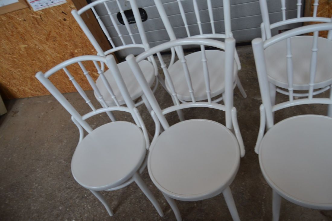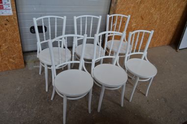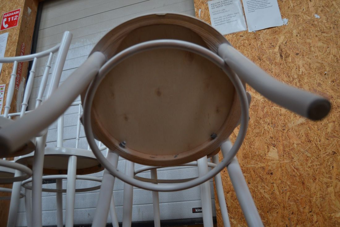 Laius 440, kõrgus 870, istumisosa maast 460 mm. Puitraamil vineerpõhjaga toolid. Tagajalgadel poltühendus. Valget värvi, esineb kriime, täkkeid, toonierinevusi, kasutustunnuseid. Hind kokku 6 toolile