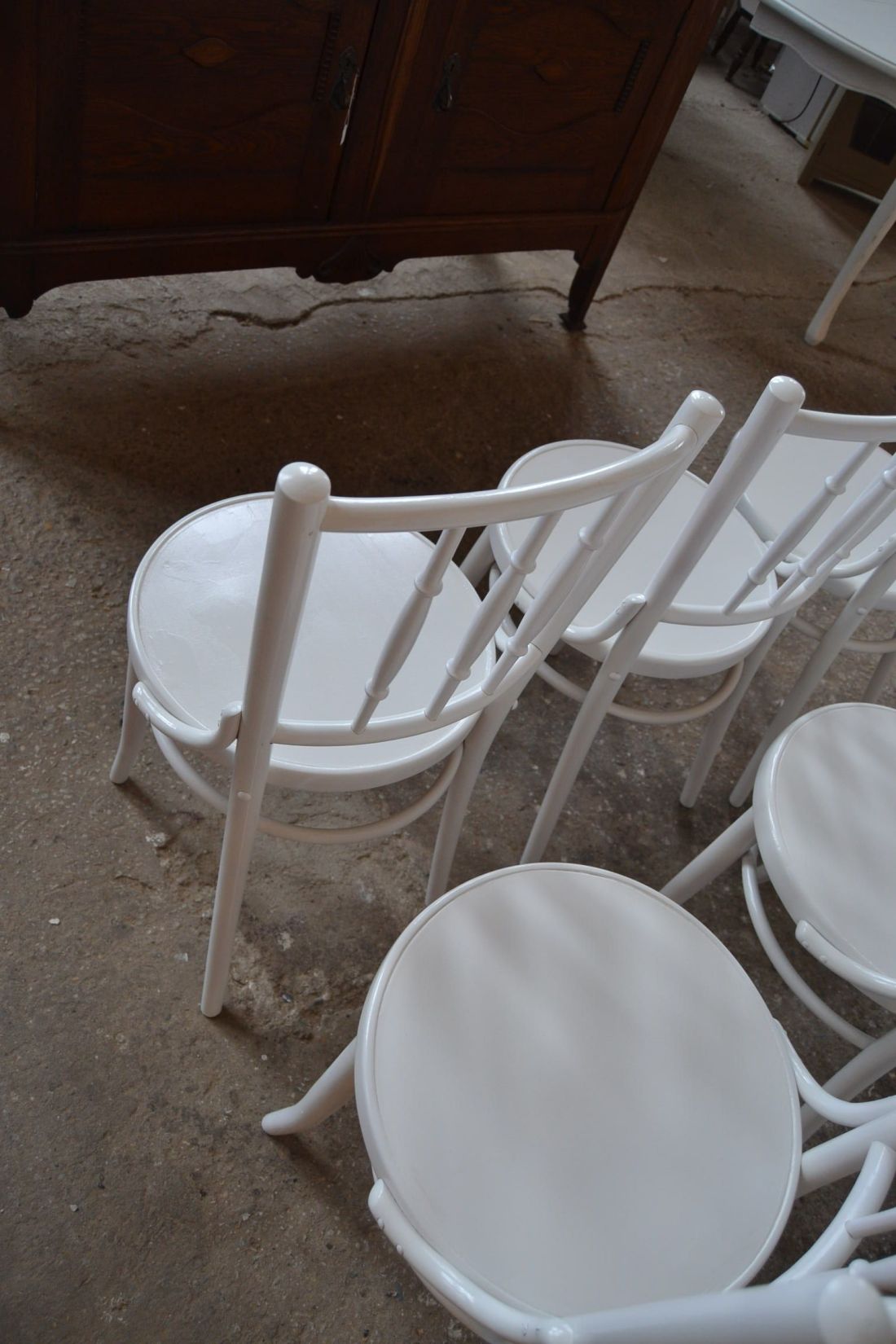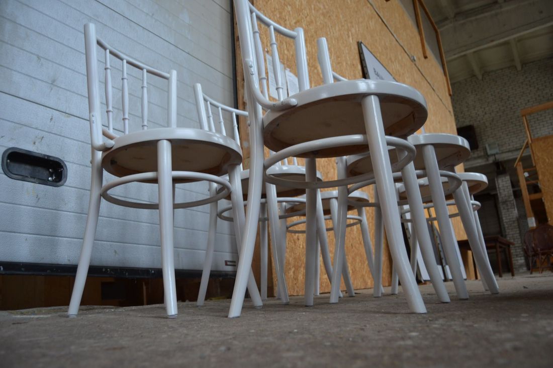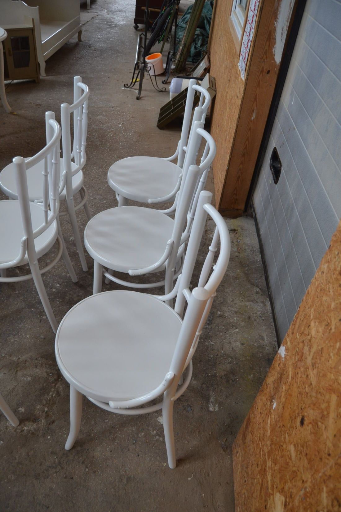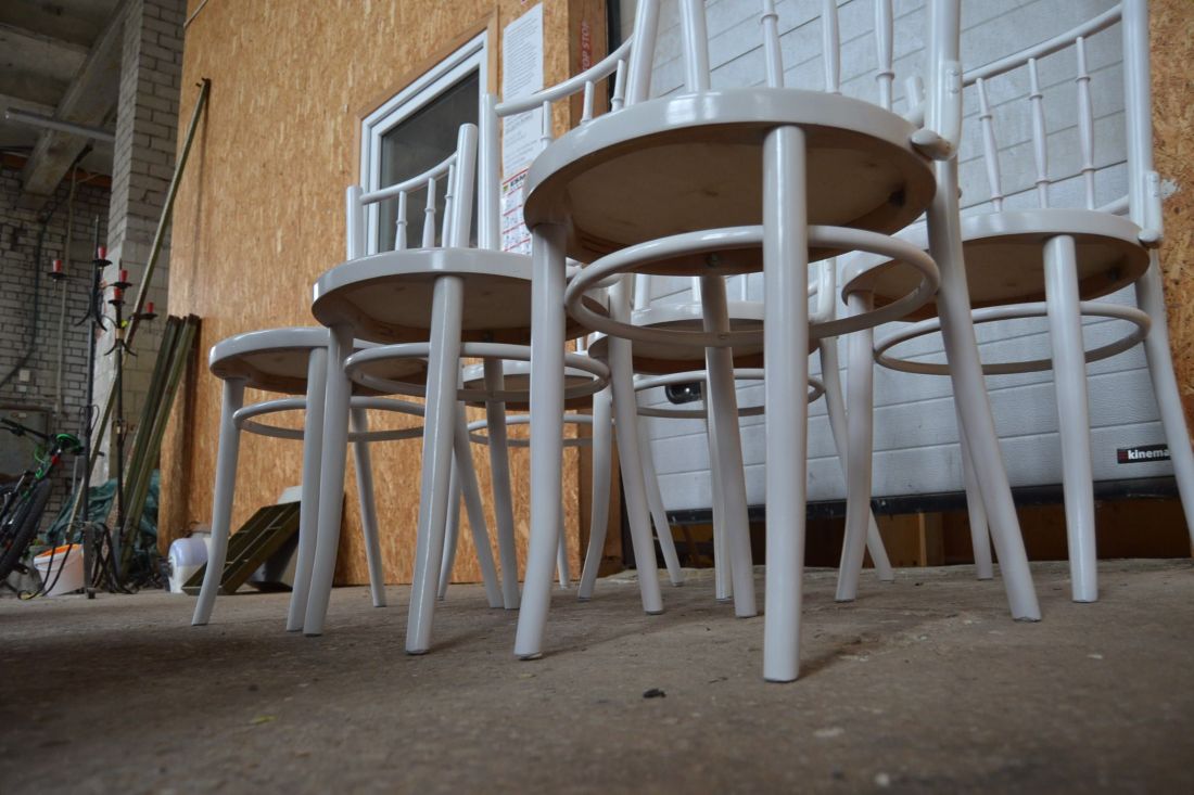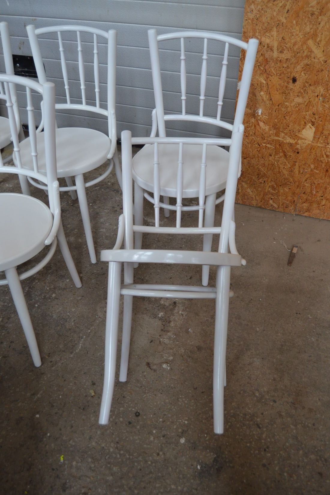 Laius 440, kõrgus 870, istumisosa maast 460 mm. Puitraamil vineerpõhjaga toolid. Tagajalgadel poltühendus. Valget värvi, esineb kriime, täkkeid, toonierinevusi, kasutustunnuseid. Hind kokku 6 toolile
