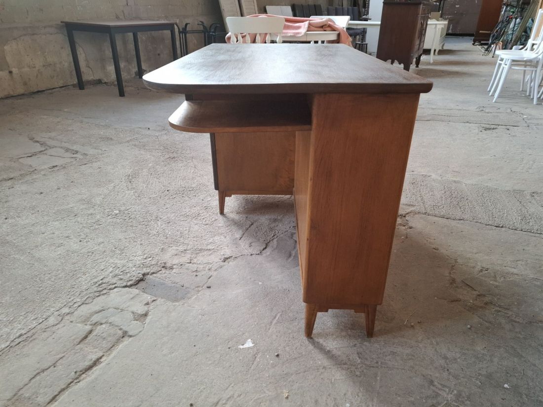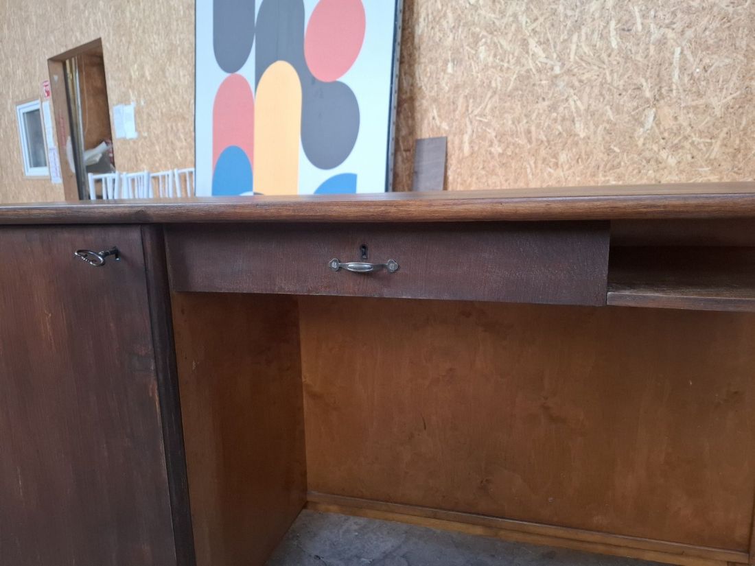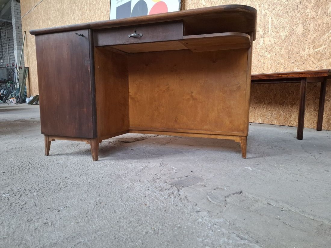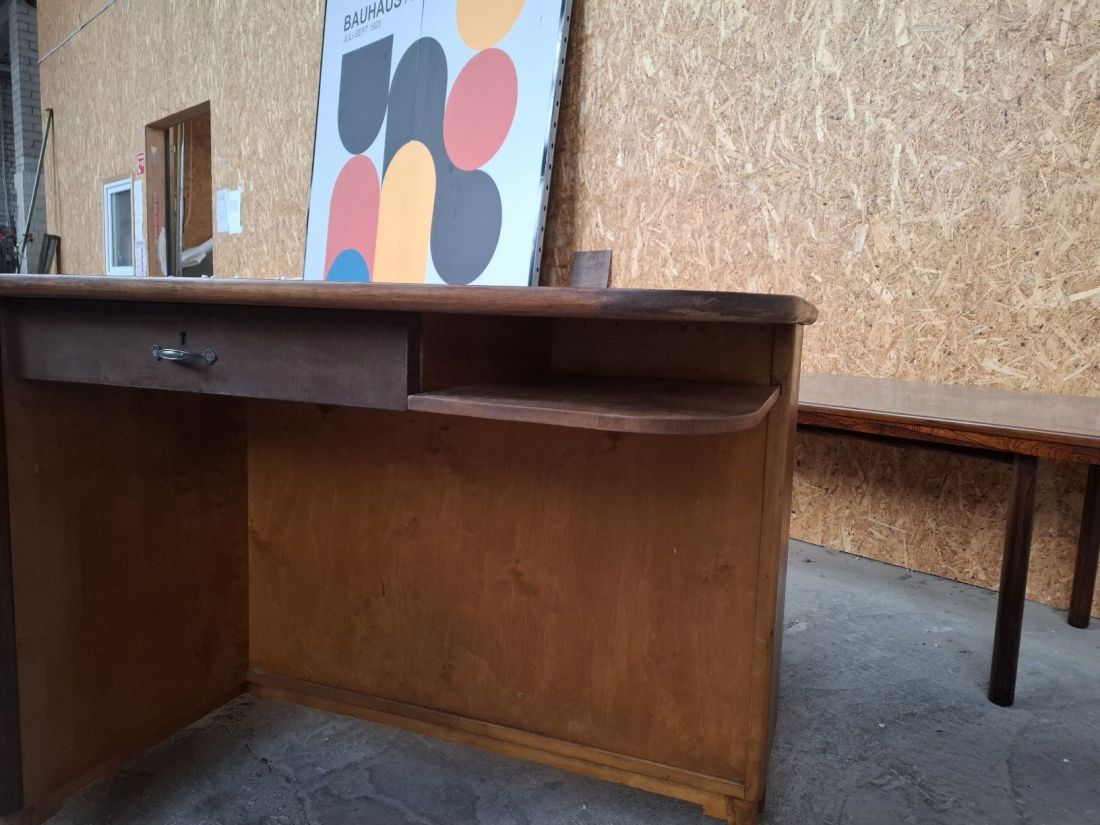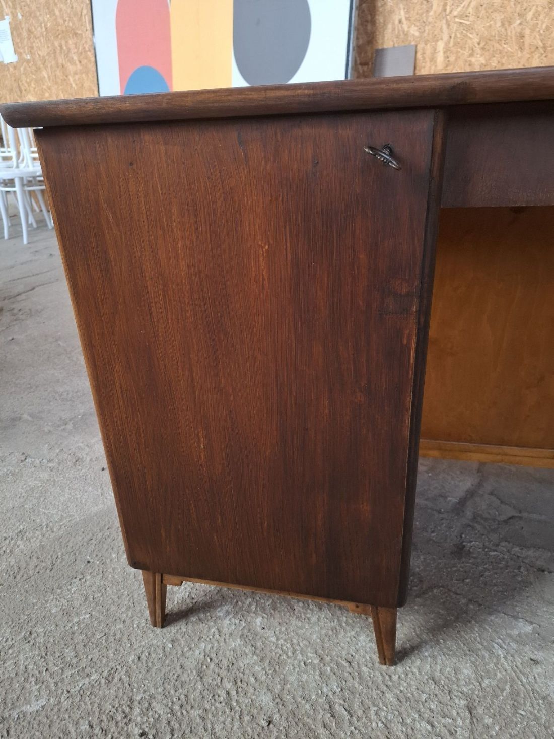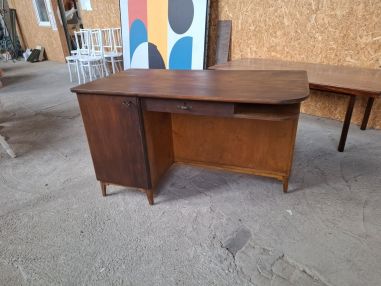 Mõõdud 1250 x 655, kõrgus 755 mm. Kahepoolne kirjutuslaud. Eesküljel uksega kapi osa ( ukse lukk töökorras, käib veidi raskelt), kapis avatud riiul ja 3 sahtlit. Keskel sahtel ( käepide, lukk ei tööta), ja paremal avatud kumera nurgaga riiul. Tagaküljel riiul raamatutele. Esineb kriime, täkkeid, toonierinevusi, parandusjälgi. Konstruktiivselt kõik toimib. Üsna eriline ja praktiline disain