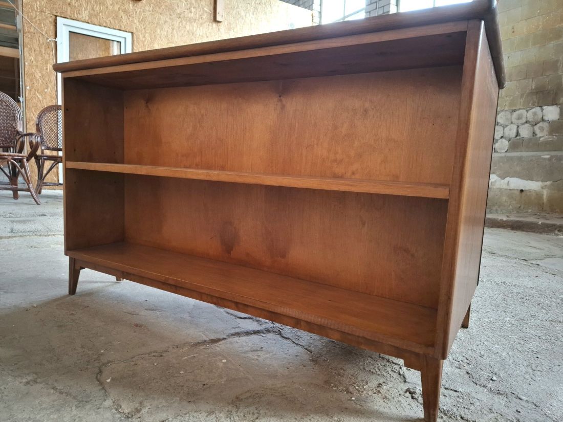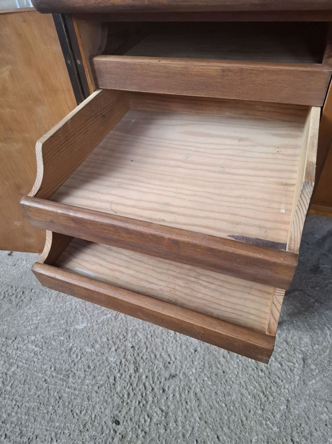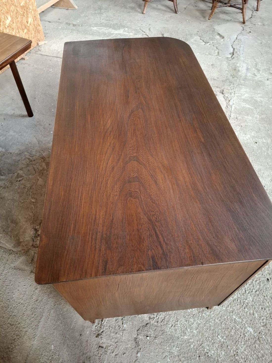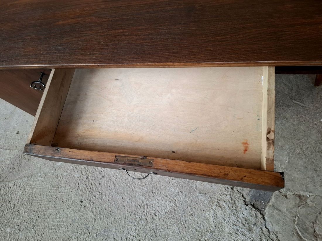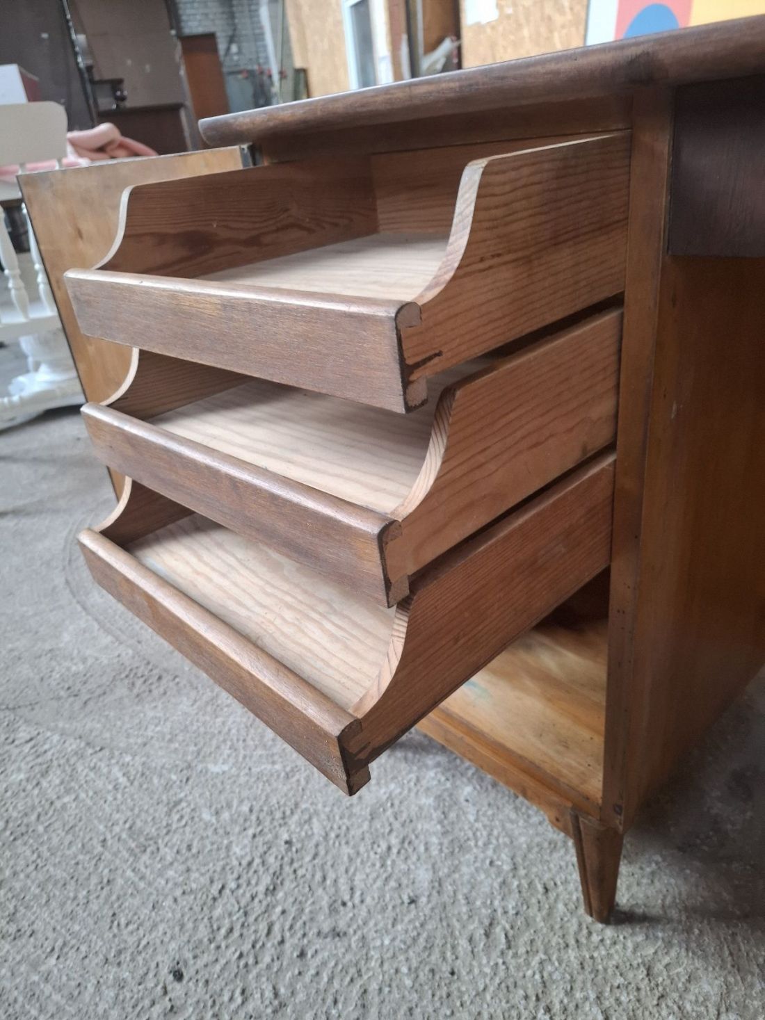 Mõõdud 1250 x 655, kõrgus 755 mm. Kahepoolne kirjutuslaud. Eesküljel uksega kapi osa ( ukse lukk töökorras, käib veidi raskelt), kapis avatud riiul ja 3 sahtlit. Keskel sahtel ( käepide, lukk ei tööta), ja paremal avatud kumera nurgaga riiul. Tagaküljel riiul raamatutele. Esineb kriime, täkkeid, toonierinevusi, parandusjälgi. Konstruktiivselt kõik toimib. Üsna eriline ja praktiline disain