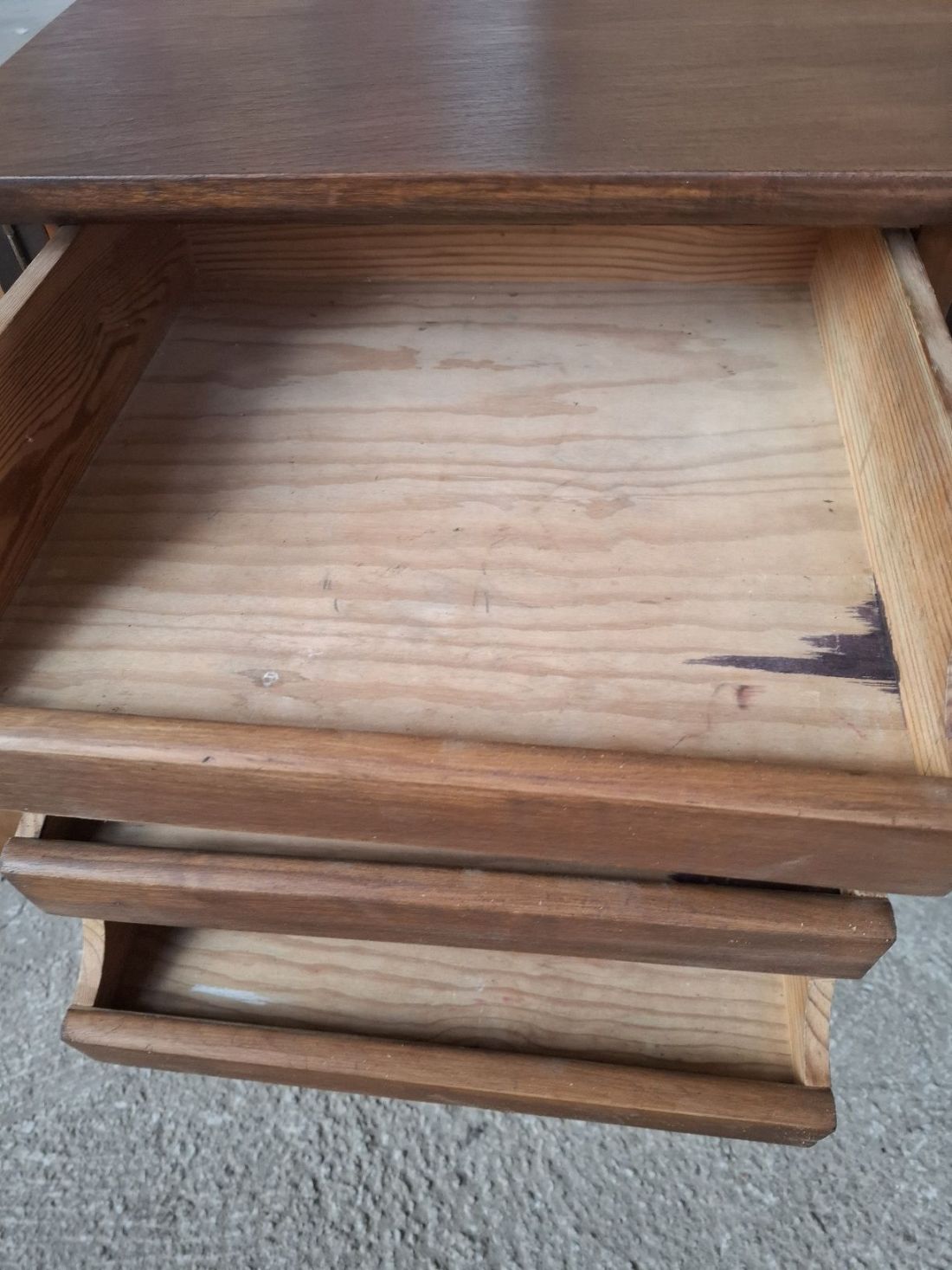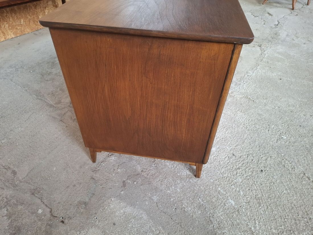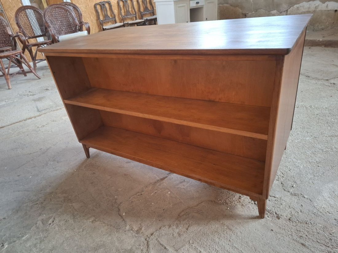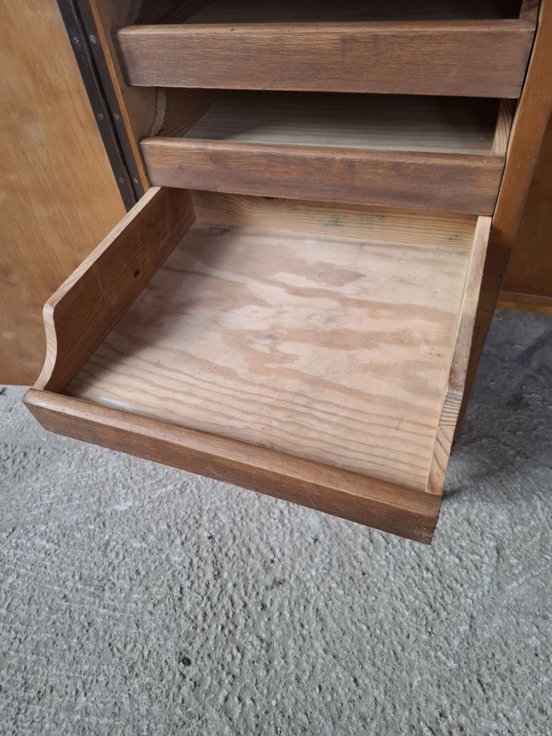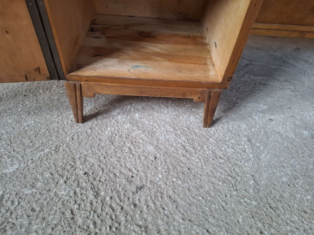 Mõõdud 1250 x 655, kõrgus 755 mm. Kahepoolne kirjutuslaud. Eesküljel uksega kapi osa ( ukse lukk töökorras, käib veidi raskelt), kapis avatud riiul ja 3 sahtlit. Keskel sahtel ( käepide, lukk ei tööta), ja paremal avatud kumera nurgaga riiul. Tagaküljel riiul raamatutele. Esineb kriime, täkkeid, toonierinevusi, parandusjälgi. Konstruktiivselt kõik toimib. Üsna eriline ja praktiline disain