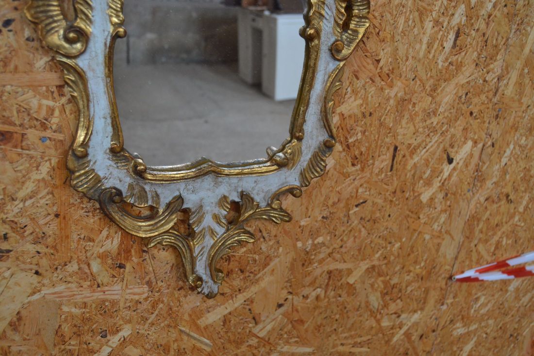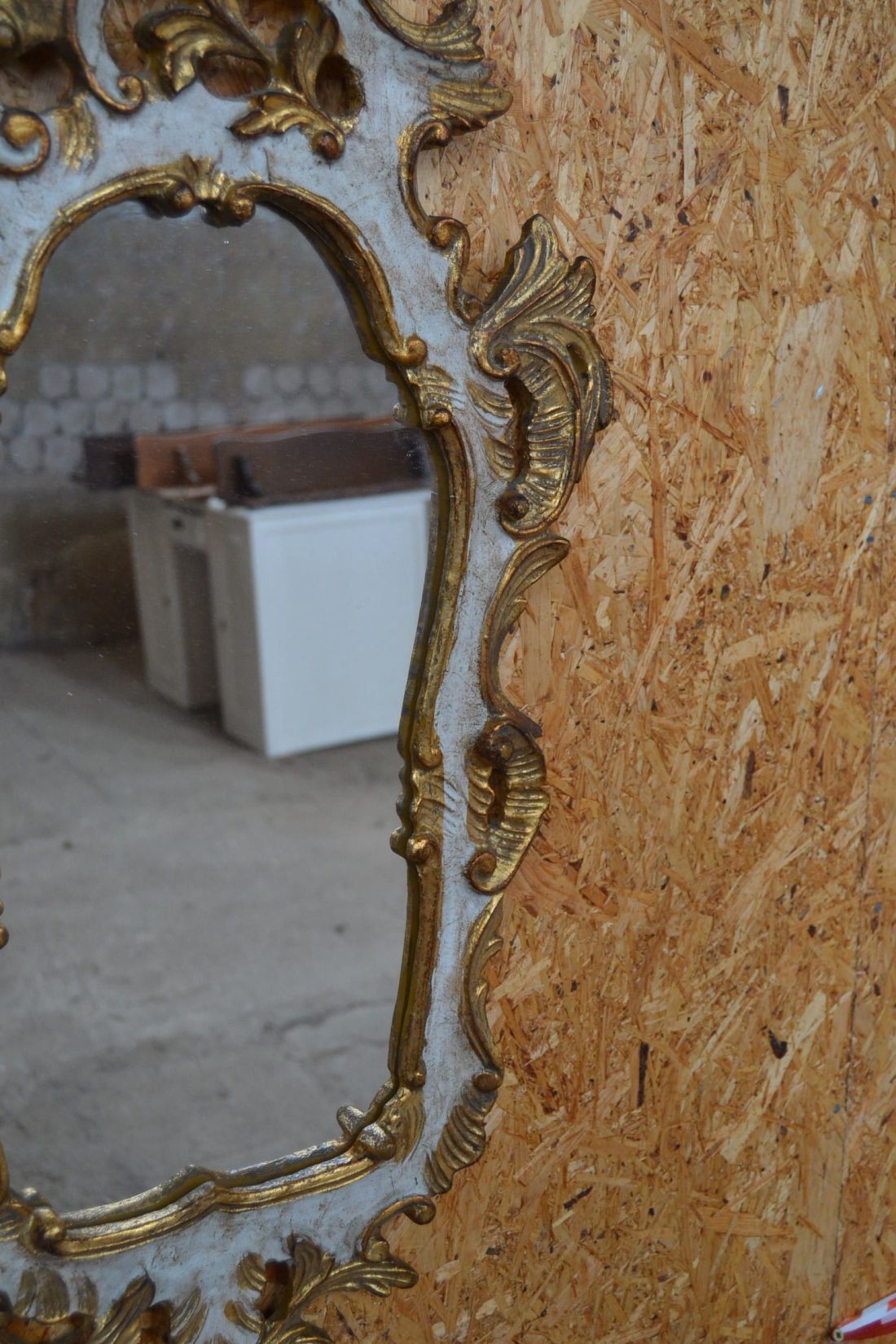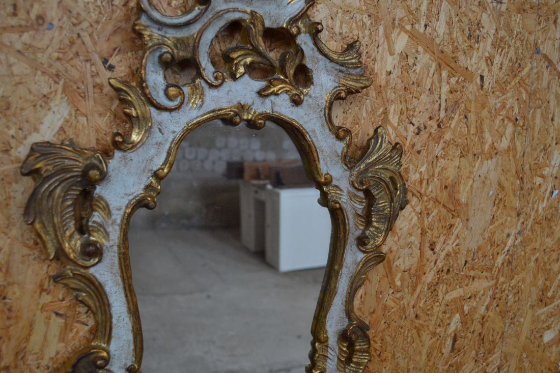 Mõõdud 420 x 880 mm. Kuldses mitmetoonilises raamis rohkete kaunistustega vanem peegel, mõned kriimud, täkked, kuivamispraod, kasutustunnused. Tagaküljel riputusaas.