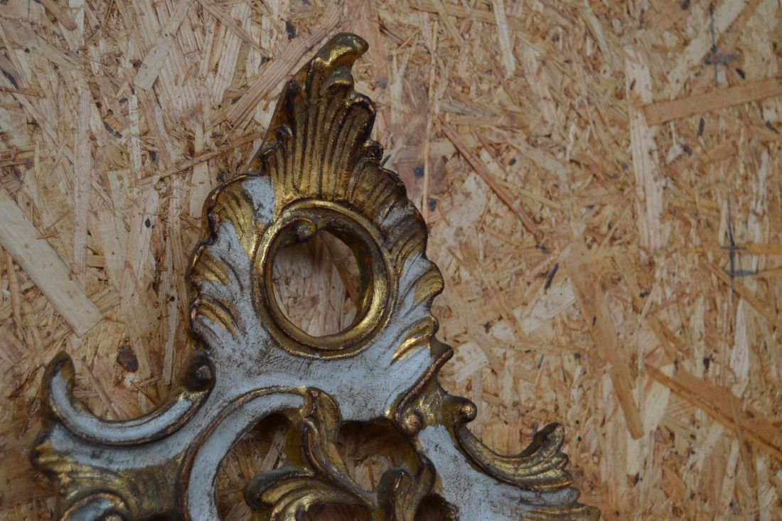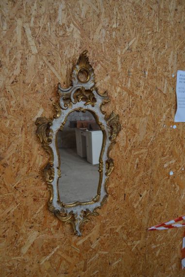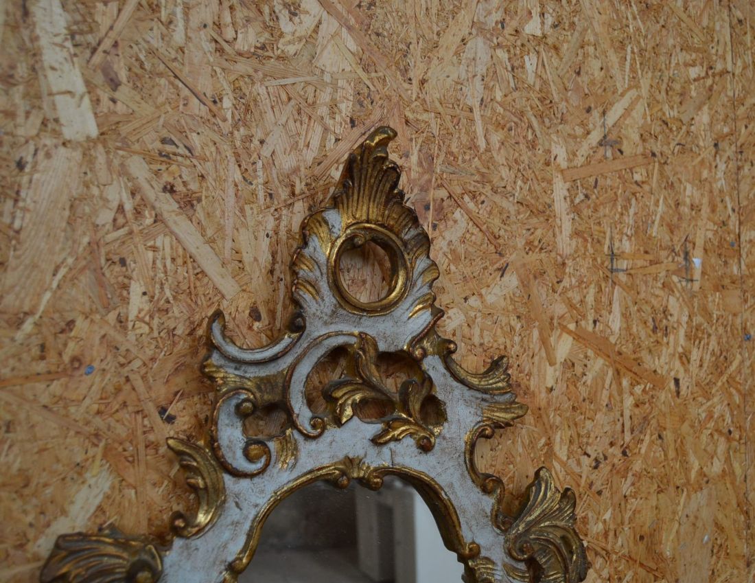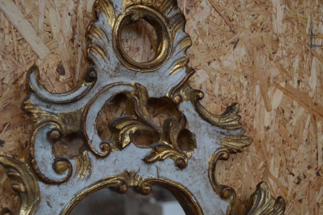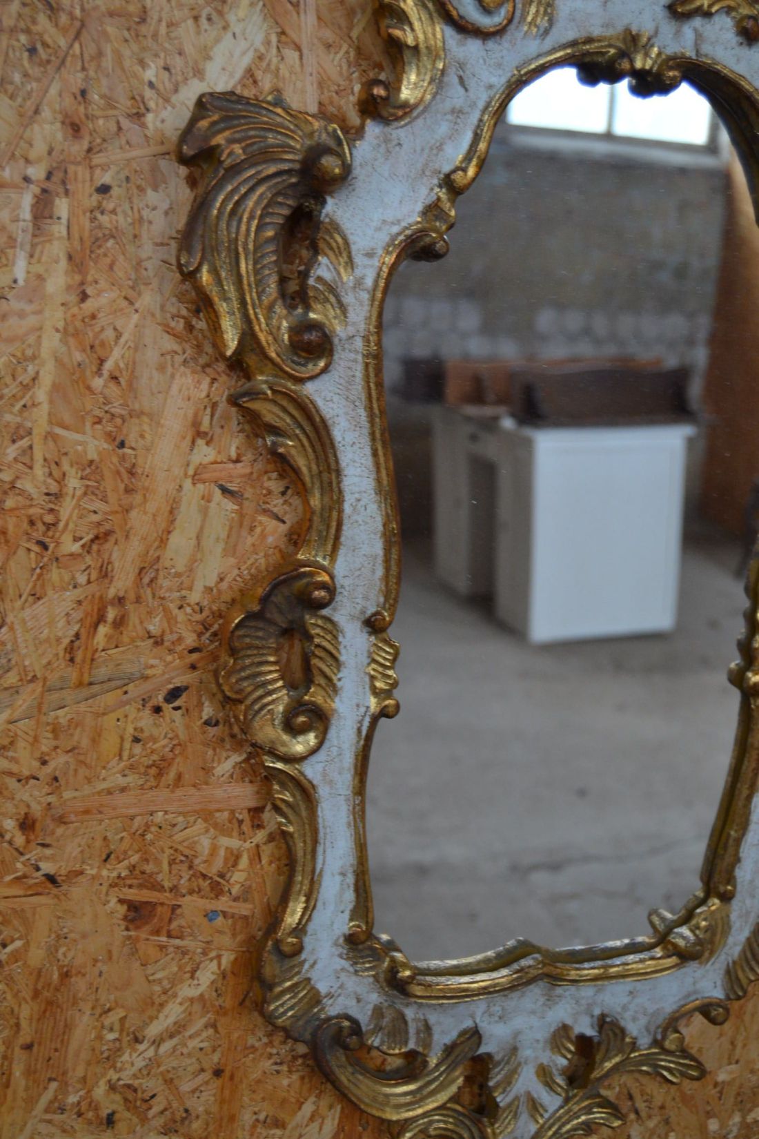 Mõõdud 420 x 880 mm. Kuldses mitmetoonilises raamis rohkete kaunistustega vanem peegel, mõned kriimud, täkked, kuivamispraod, kasutustunnused. Tagaküljel riputusaas.