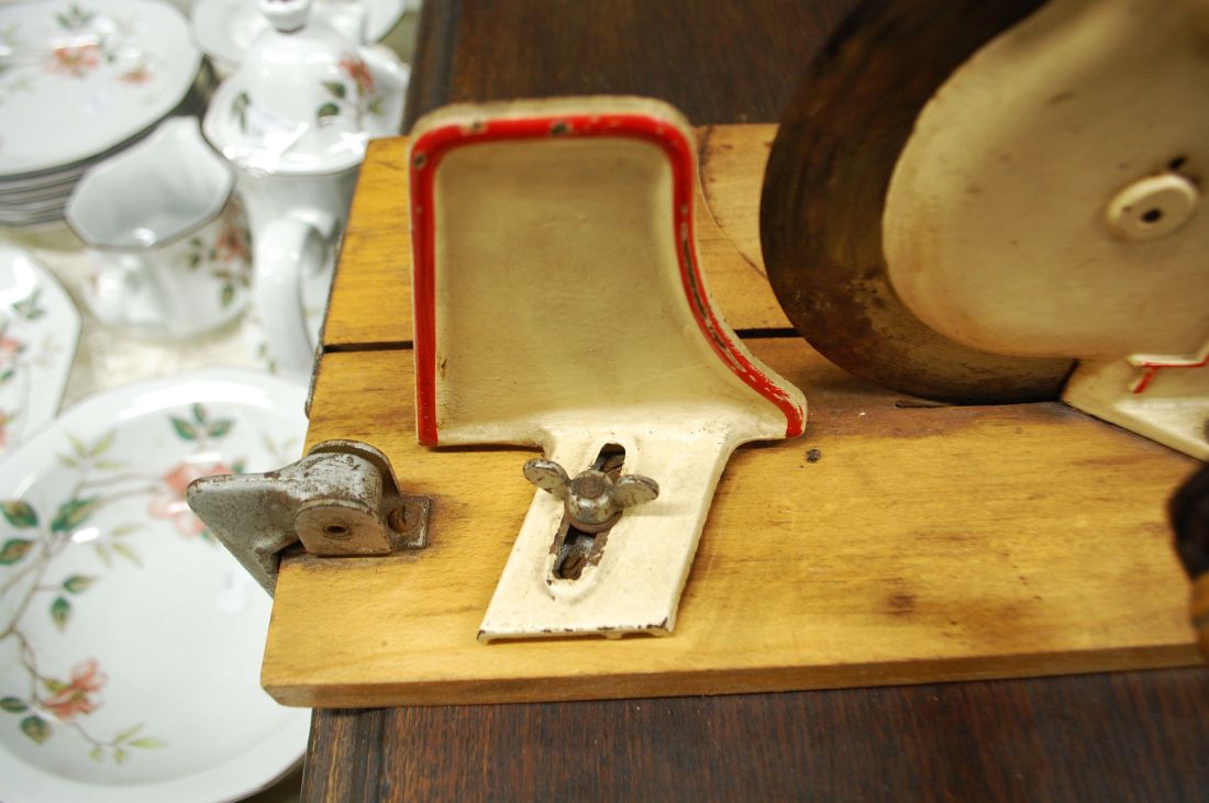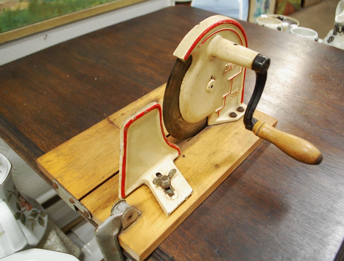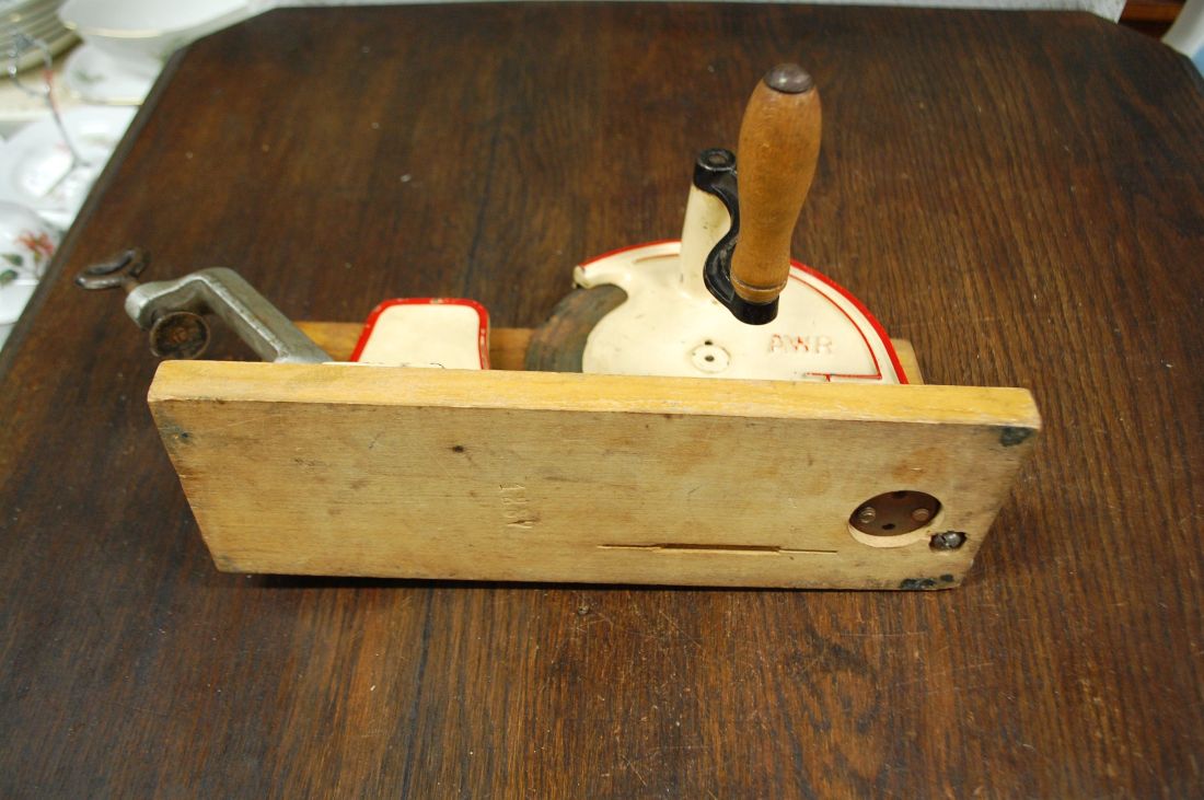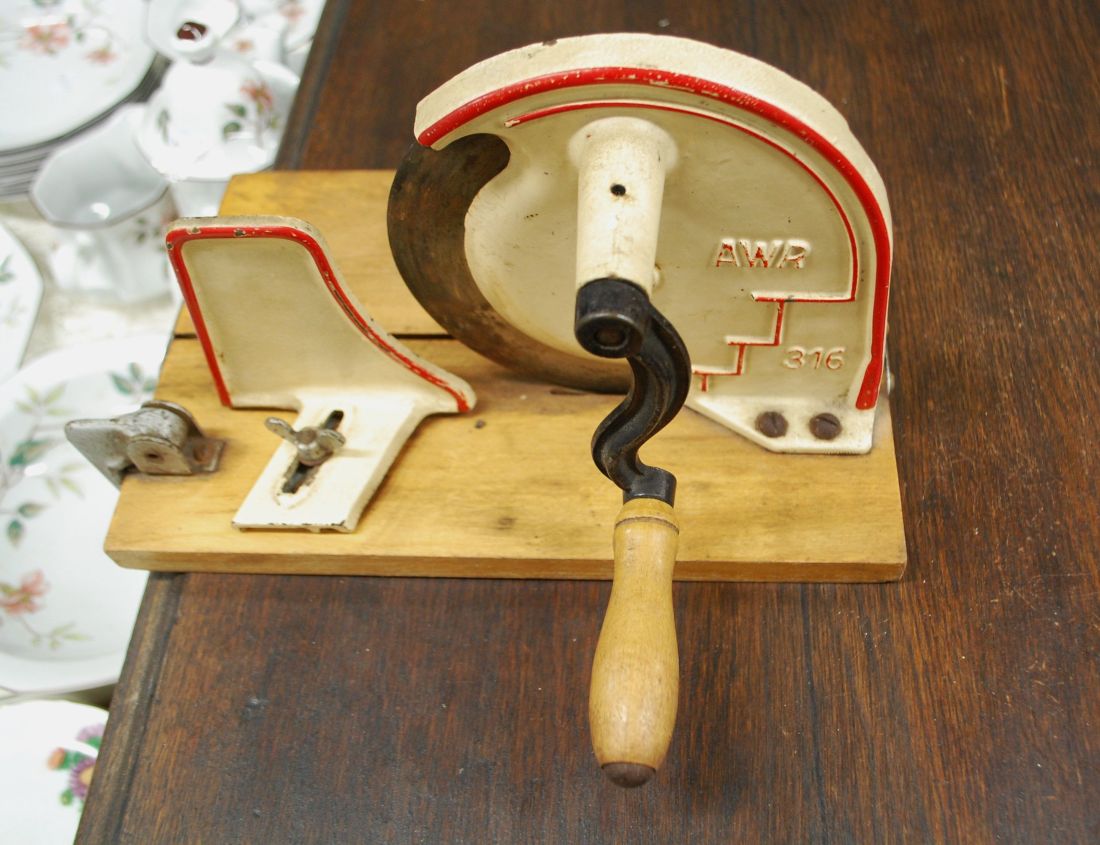 Mõõdud: 310 x 190mm, kõrgus 180mm. Vana stiilne lauale kinnitatav käsitsi viilutaja. Puitalusel puidust käepidemega, reguleeritav viilupaksus. 1920-30-ndad. Esineb kriime, täkkeid, kulumist, kasutustunnuseid. Tarne pakiautomaati