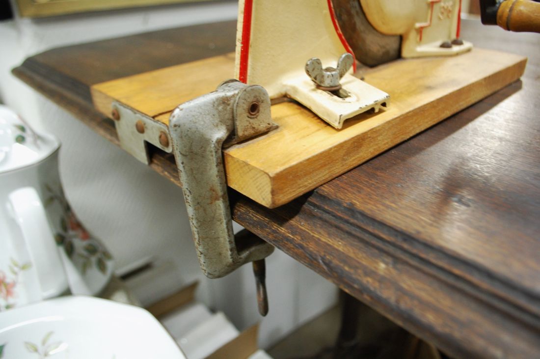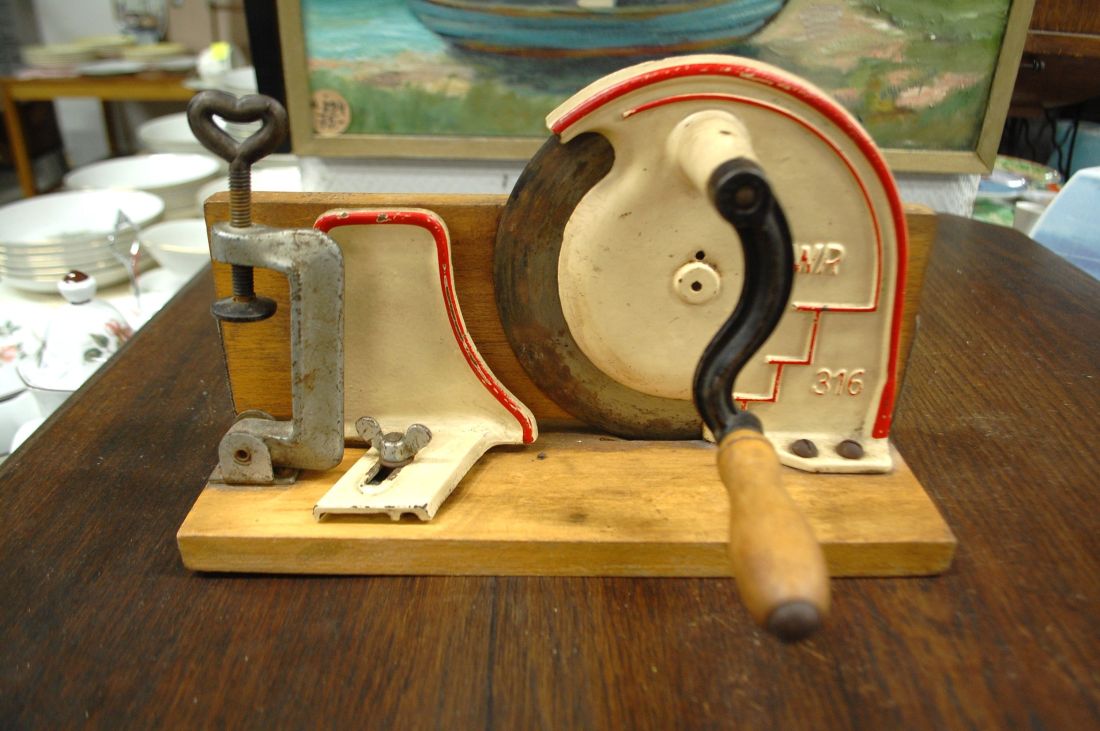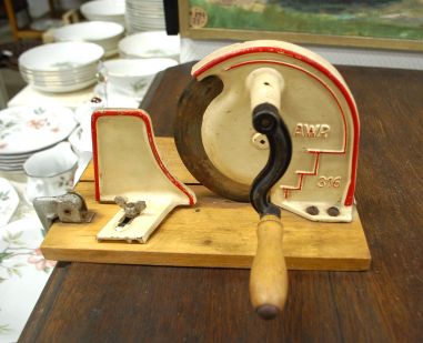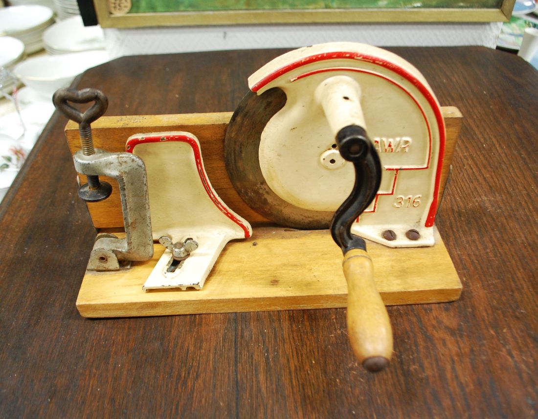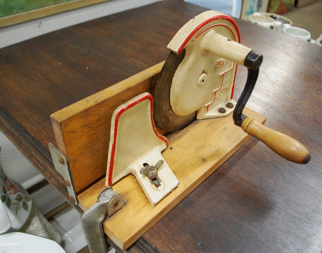 Mõõdud: 310 x 190mm, kõrgus 180mm. Vana stiilne lauale kinnitatav käsitsi viilutaja. Puitalusel puidust käepidemega, reguleeritav viilupaksus. 1920-30-ndad. Esineb kriime, täkkeid, kulumist, kasutustunnuseid. Tarne pakiautomaati
