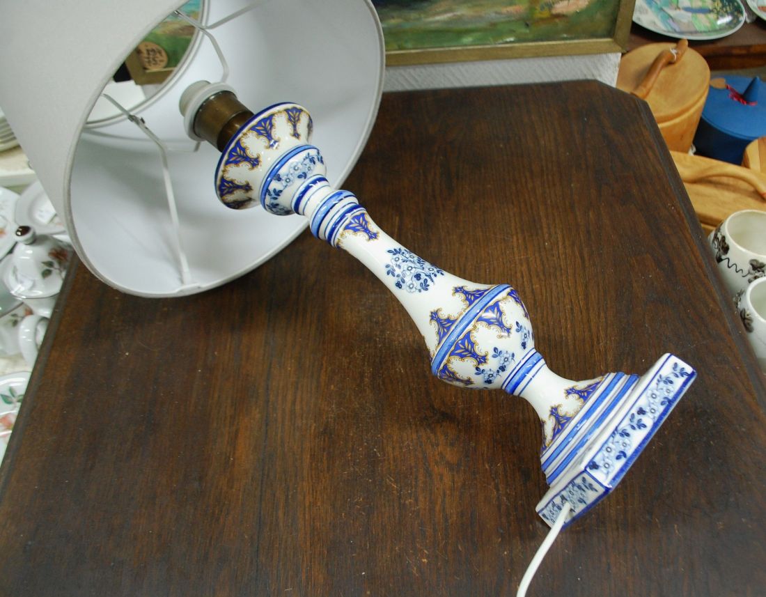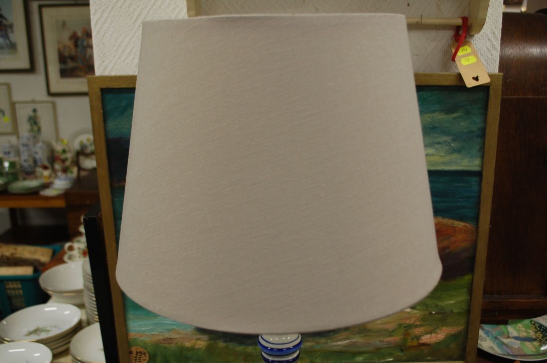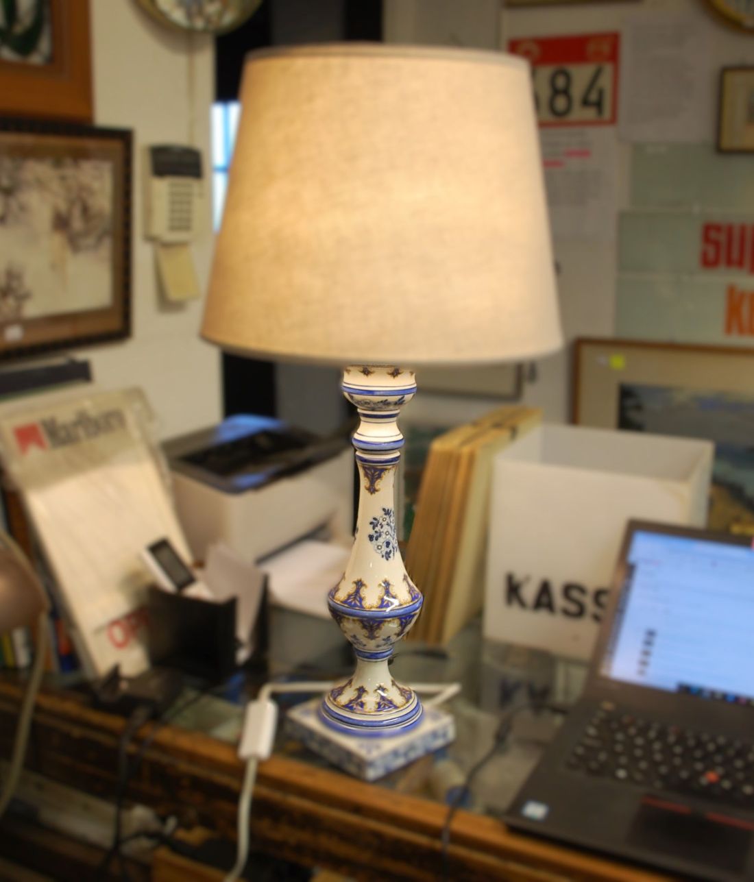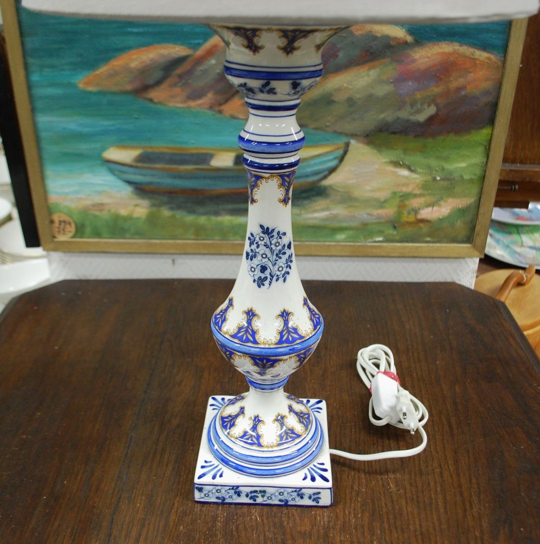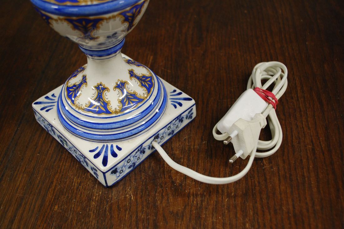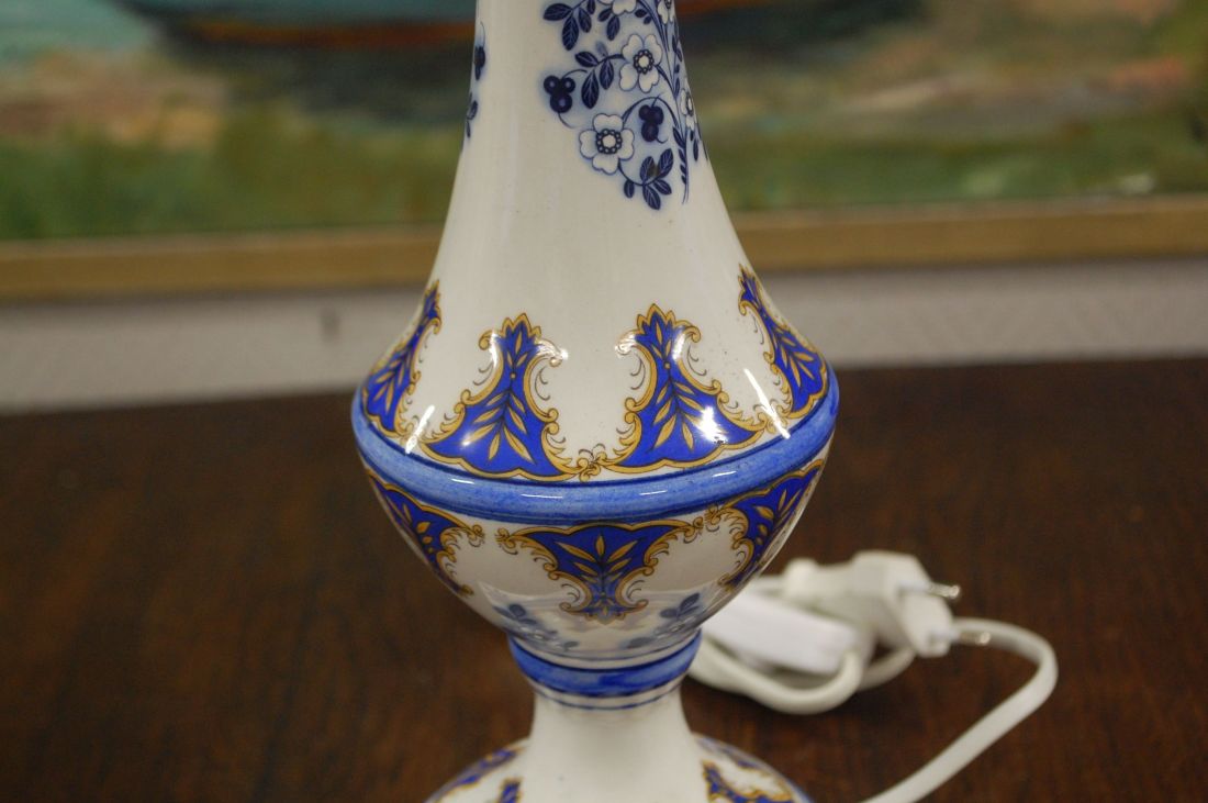 Mõõdud: jalg alt 120 x 120mm, kogukõrgus kupliga 650mm. Portselanist värviküllane kauni kujuga jalg.  Pirnipesa ümbrus kaetud metalliga (metallosal pragu, pilt). Kuppel beežikas ja uueväärne ning kasutustunnusteta. E 27 pirnipesa ja proovides läks põlema. Tarne pakiauromaati