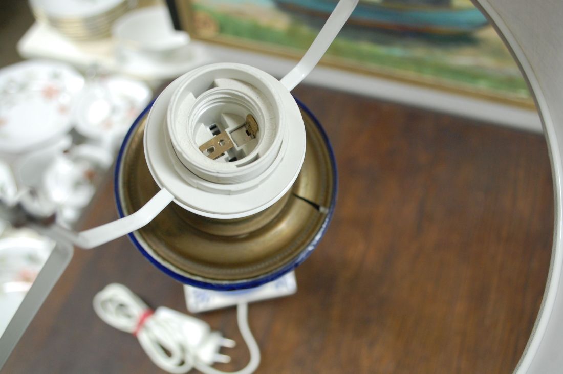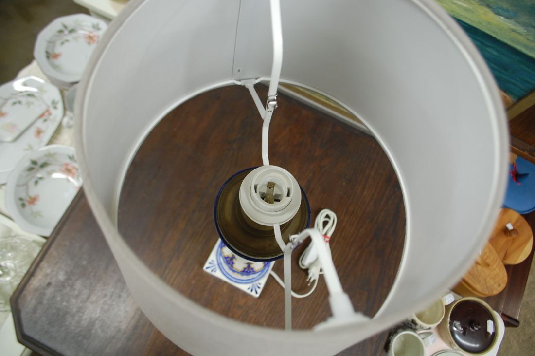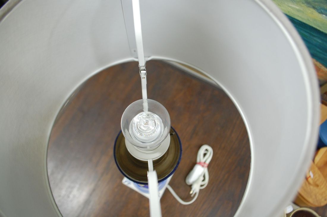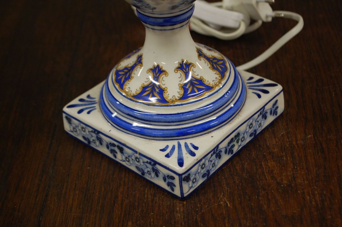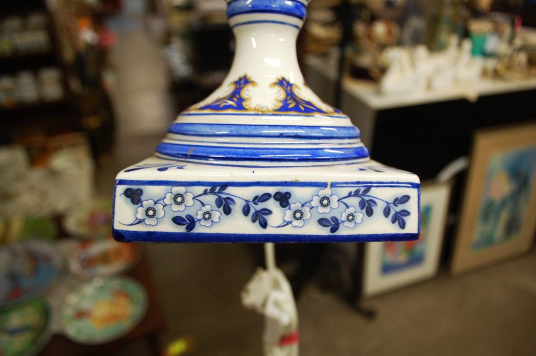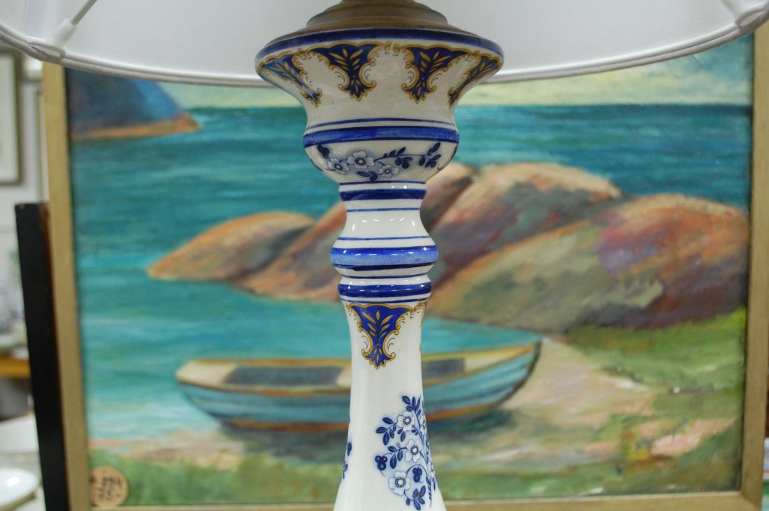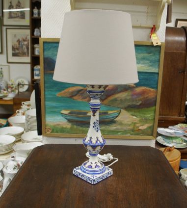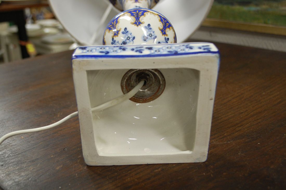 Mõõdud: jalg alt 120 x 120mm, kogukõrgus kupliga 650mm. Portselanist värviküllane kauni kujuga jalg.  Pirnipesa ümbrus kaetud metalliga (metallosal pragu, pilt). Kuppel beežikas ja uueväärne ning kasutustunnusteta. E 27 pirnipesa ja proovides läks põlema. Tarne pakiauromaati