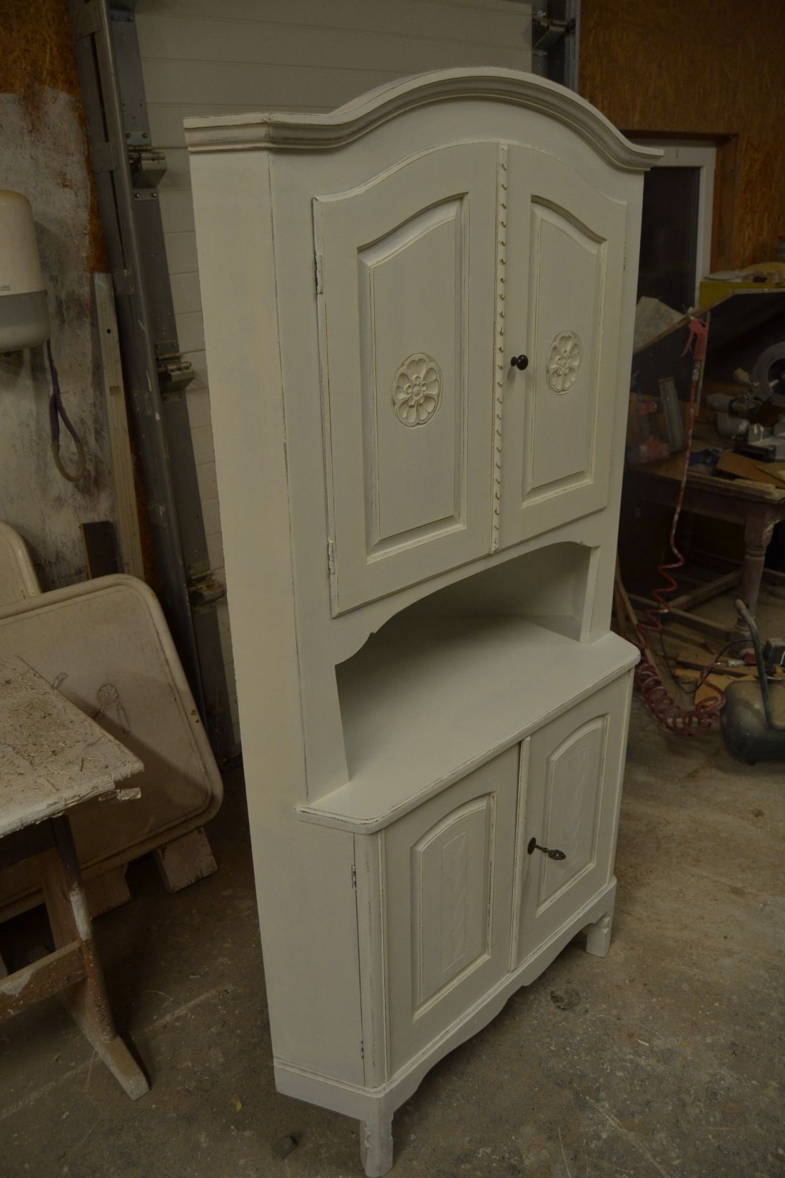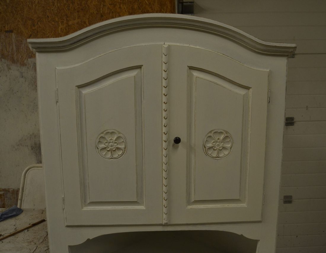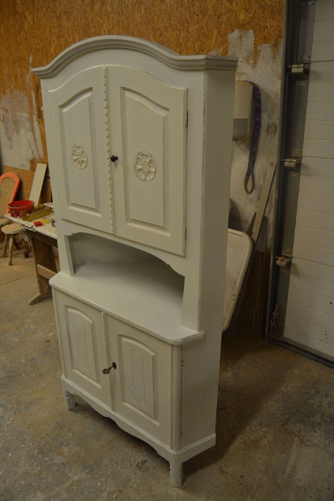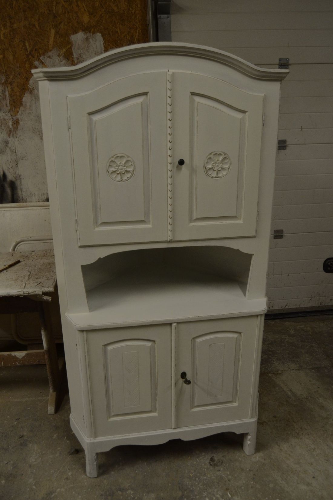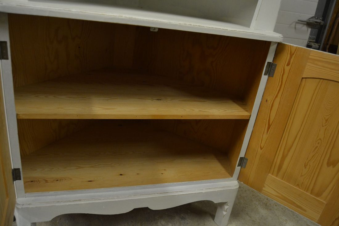 Mõõdud nurgal 660x660, eest laius 860, kõrgus 1790 mm. Suurem puidust nurgakapp. Ustel ilusad puulõiked. Ülal 2 ust, uksel rullsulgur, kapis 2 riiulit. KESKEL AVATUD Kapi osa. Allosas kahe uksega kapp, ukse lukk töökorras, käib veidi raskelt. Kapis riiul. Valgeks värvitud, värv vanutatud, esineb kriime, täkkeid, kasutustunnuseid, toonierinevusi. Tarne 1 osas.