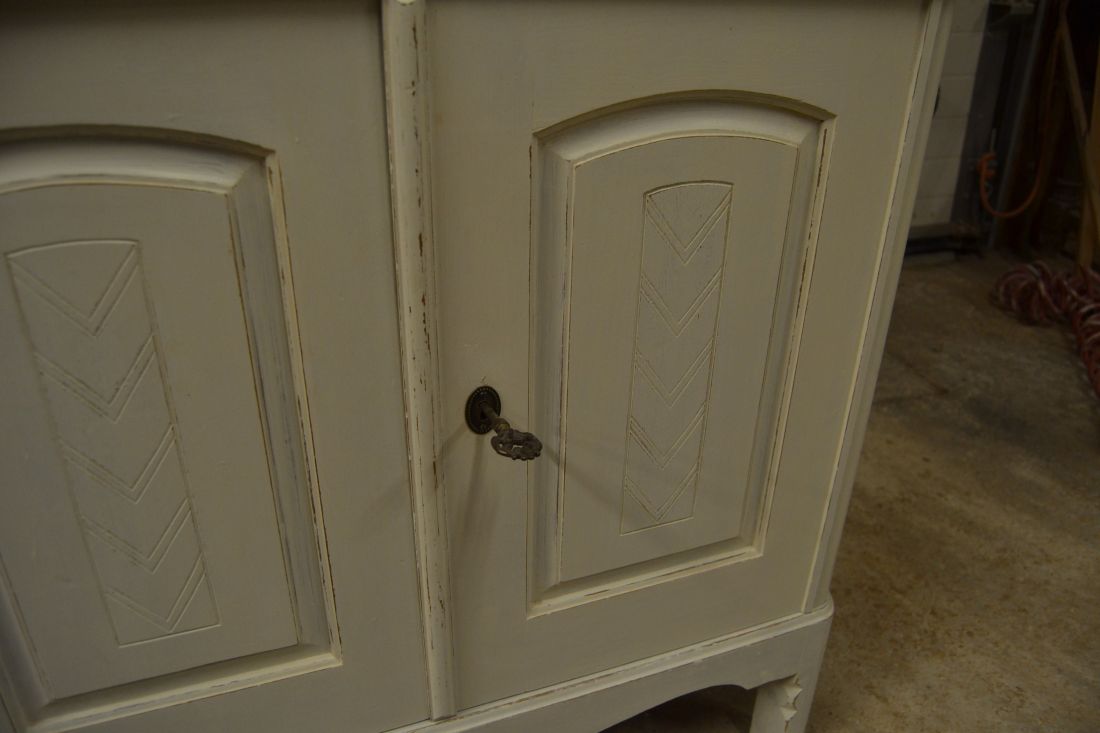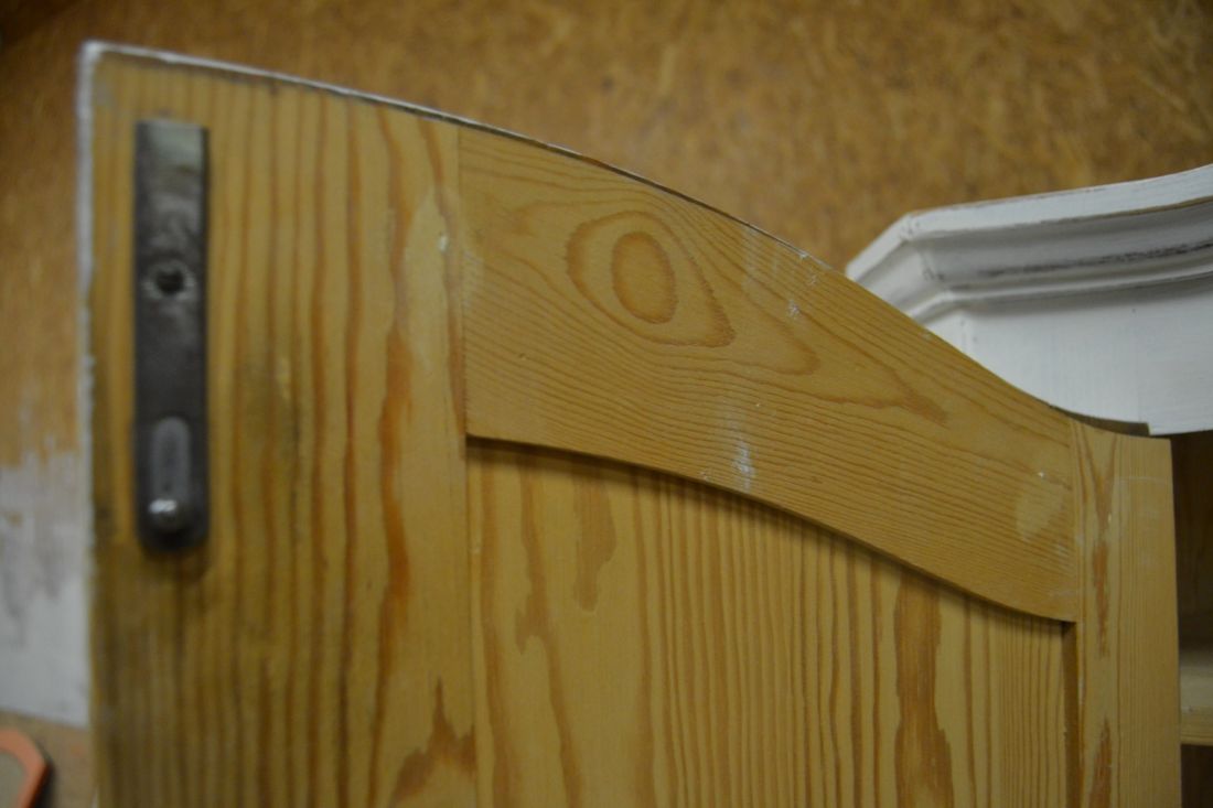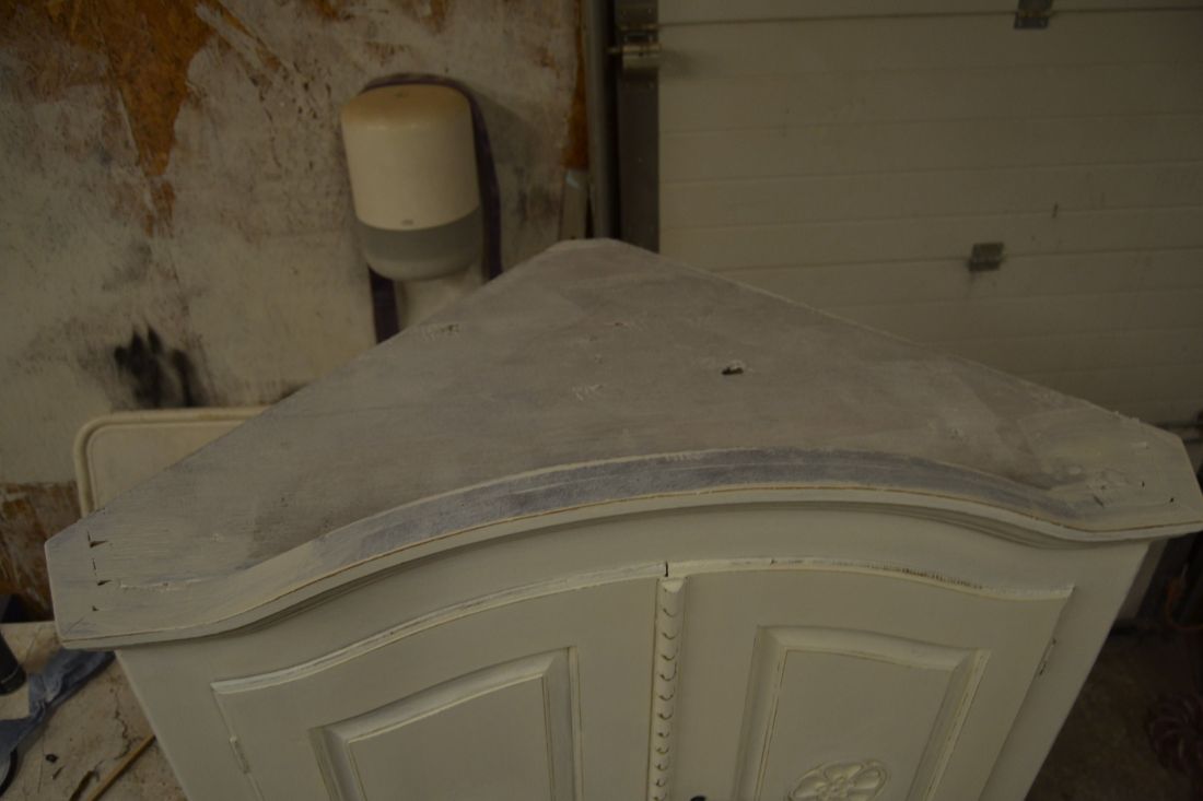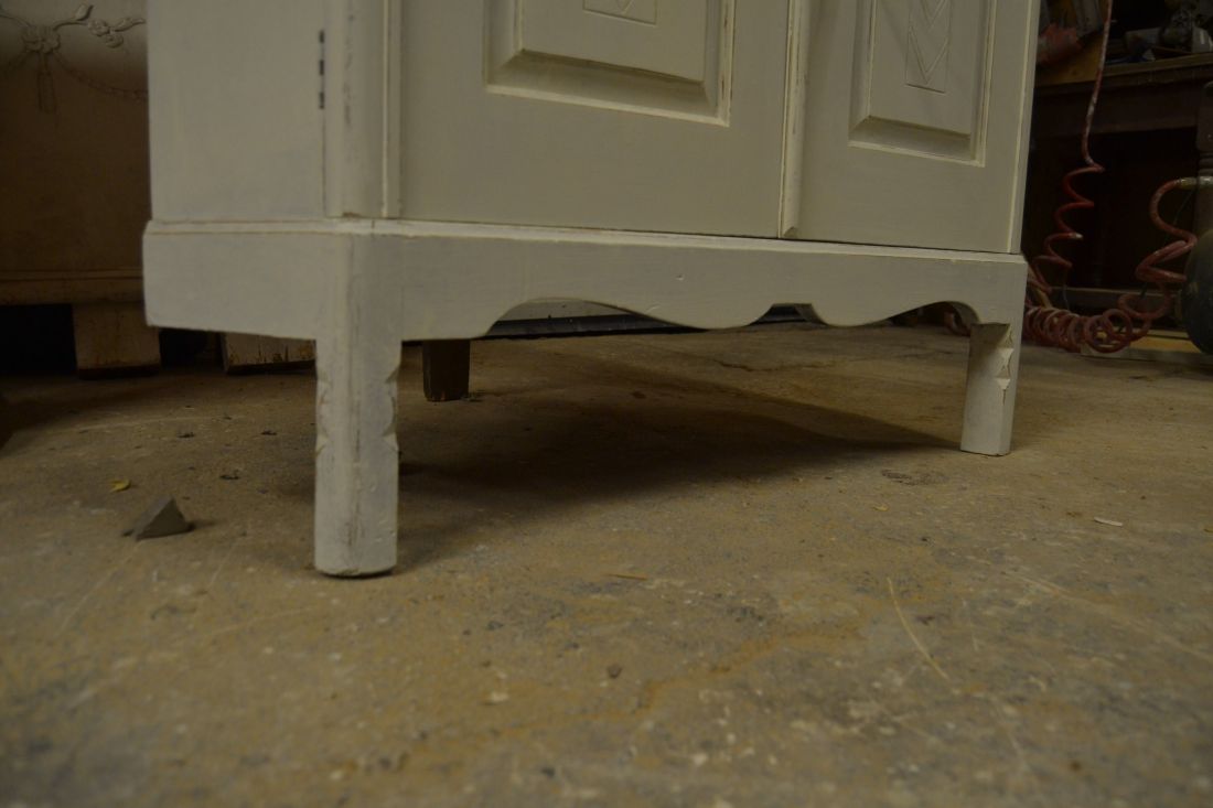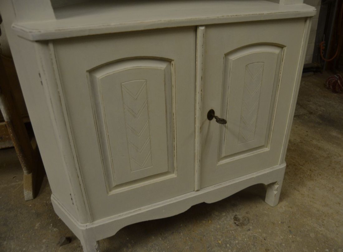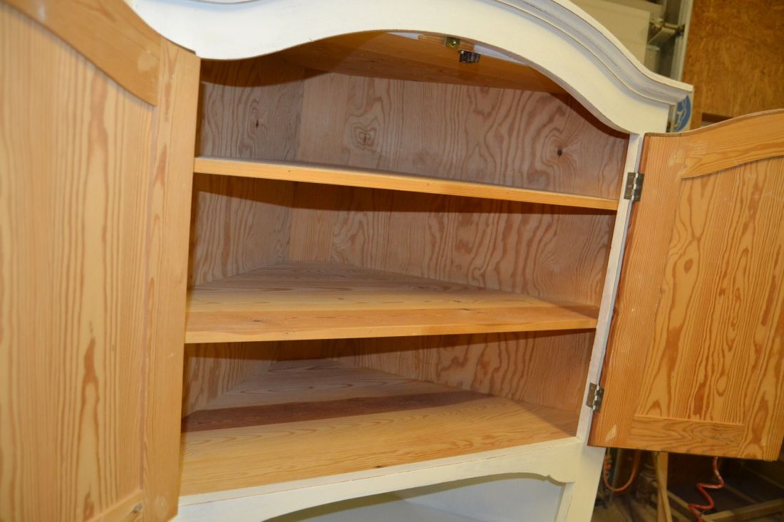 Mõõdud nurgal 660x660, eest laius 860, kõrgus 1790 mm. Suurem puidust nurgakapp. Ustel ilusad puulõiked. Ülal 2 ust, uksel rullsulgur, kapis 2 riiulit. KESKEL AVATUD Kapi osa. Allosas kahe uksega kapp, ukse lukk töökorras, käib veidi raskelt. Kapis riiul. Valgeks värvitud, värv vanutatud, esineb kriime, täkkeid, kasutustunnuseid, toonierinevusi. Tarne 1 osas.