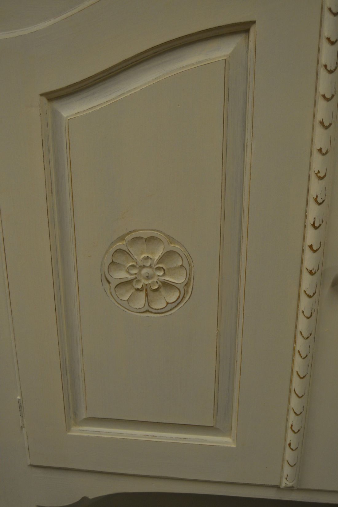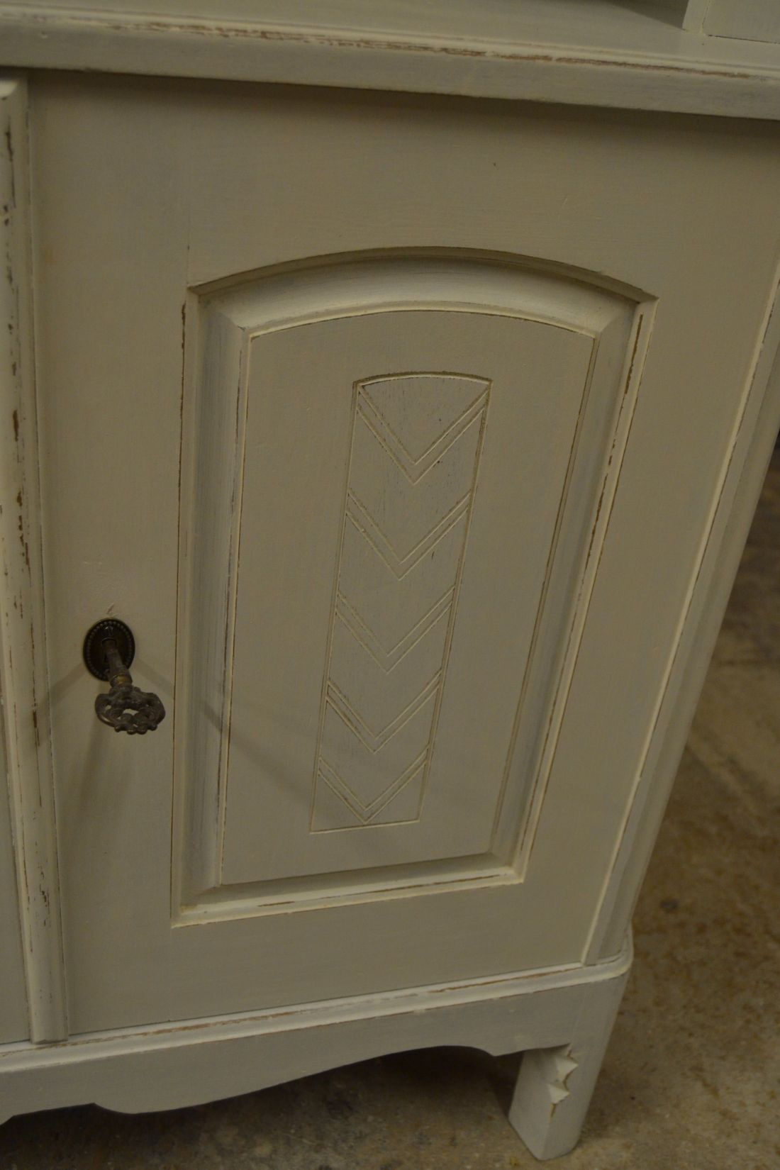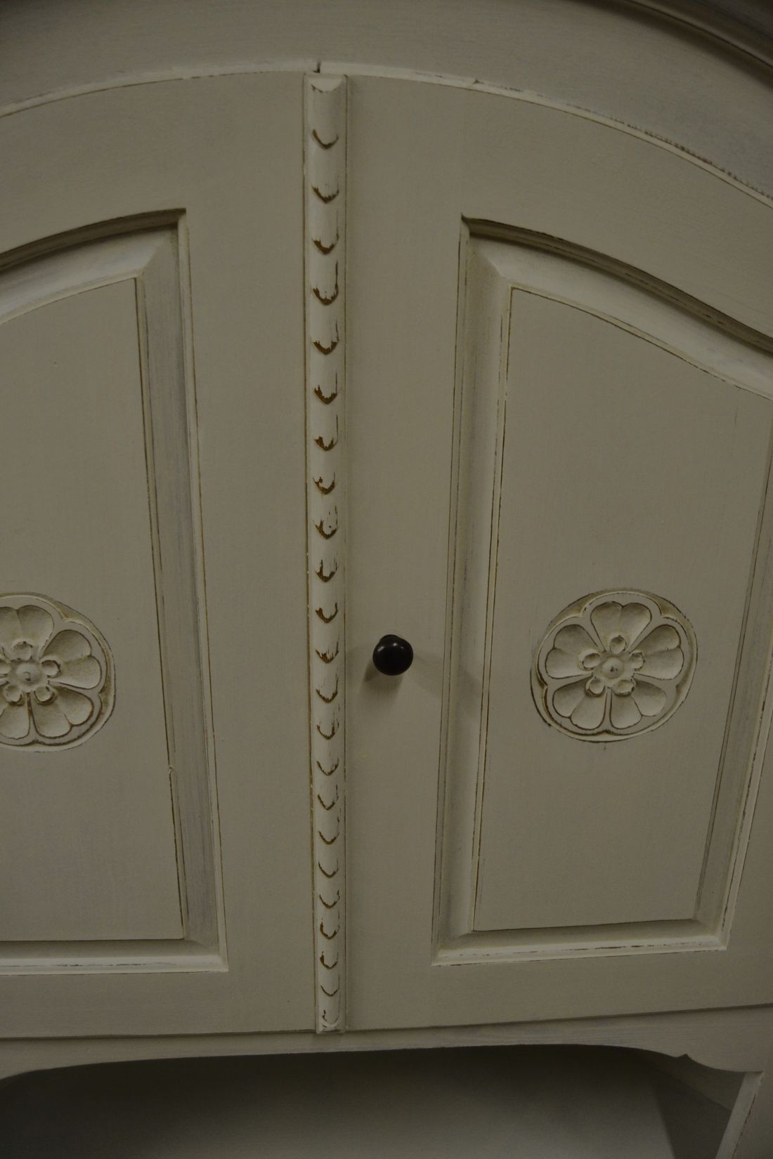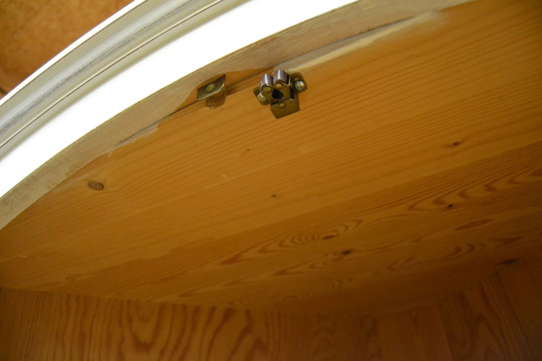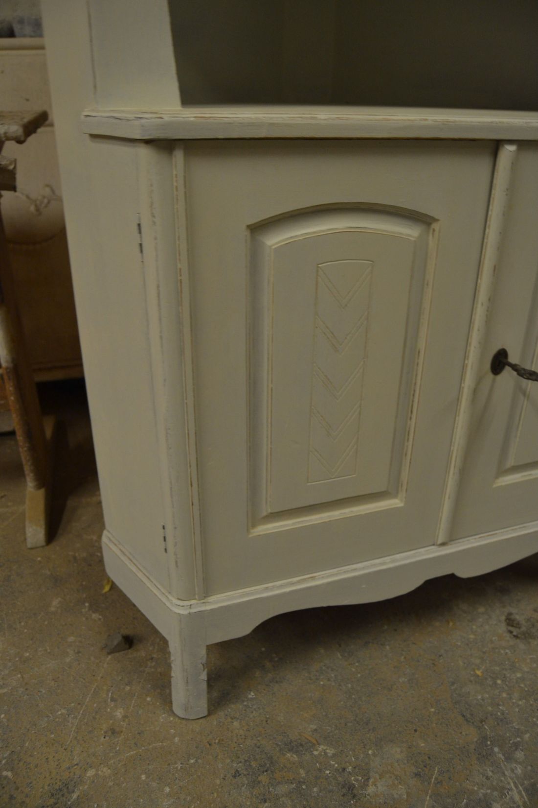 Mõõdud nurgal 660x660, eest laius 860, kõrgus 1790 mm. Suurem puidust nurgakapp. Ustel ilusad puulõiked. Ülal 2 ust, uksel rullsulgur, kapis 2 riiulit. KESKEL AVATUD Kapi osa. Allosas kahe uksega kapp, ukse lukk töökorras, käib veidi raskelt. Kapis riiul. Valgeks värvitud, värv vanutatud, esineb kriime, täkkeid, kasutustunnuseid, toonierinevusi. Tarne 1 osas.
