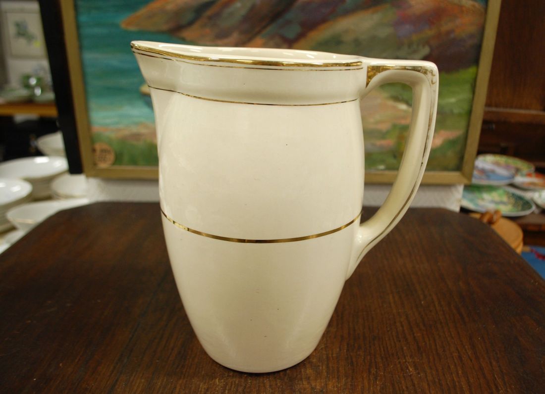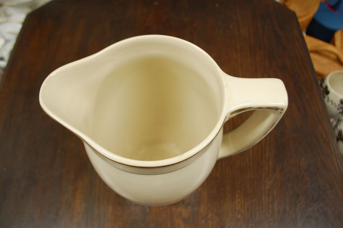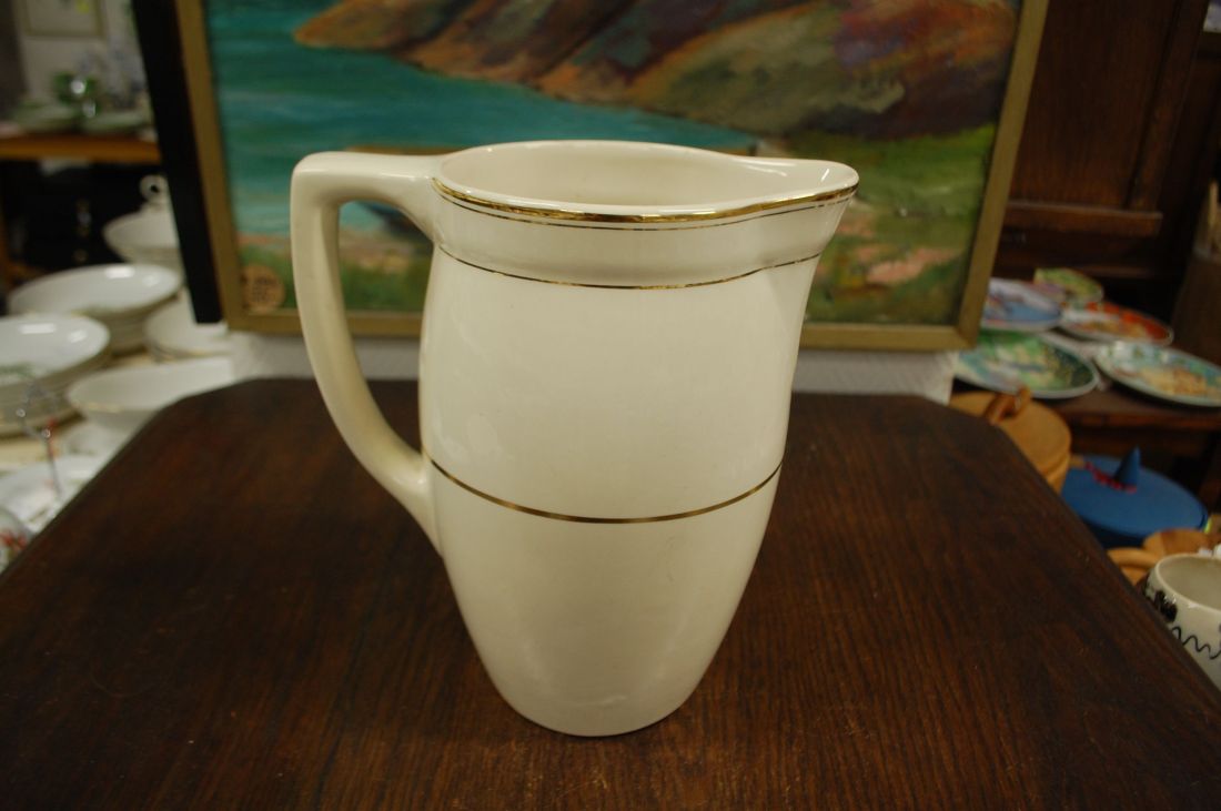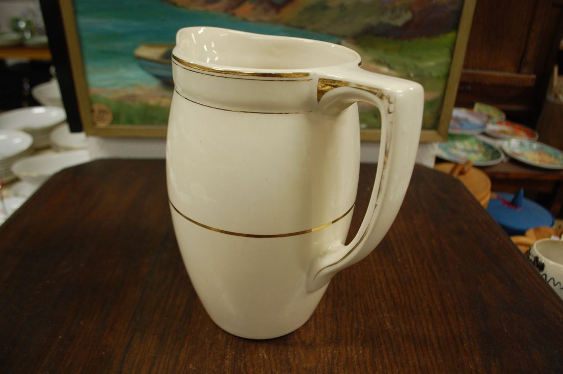 Mõõdud: 230 x 170mm, kõrgus 260mm. Kreemikas toon, kullatis. Kena vana lihtsa joonega kann. Toodeti ca 1920a, Boch, Belgia. Esineb kriime ja kullatise kulumist kasutusest. Tarne pakiutomaati