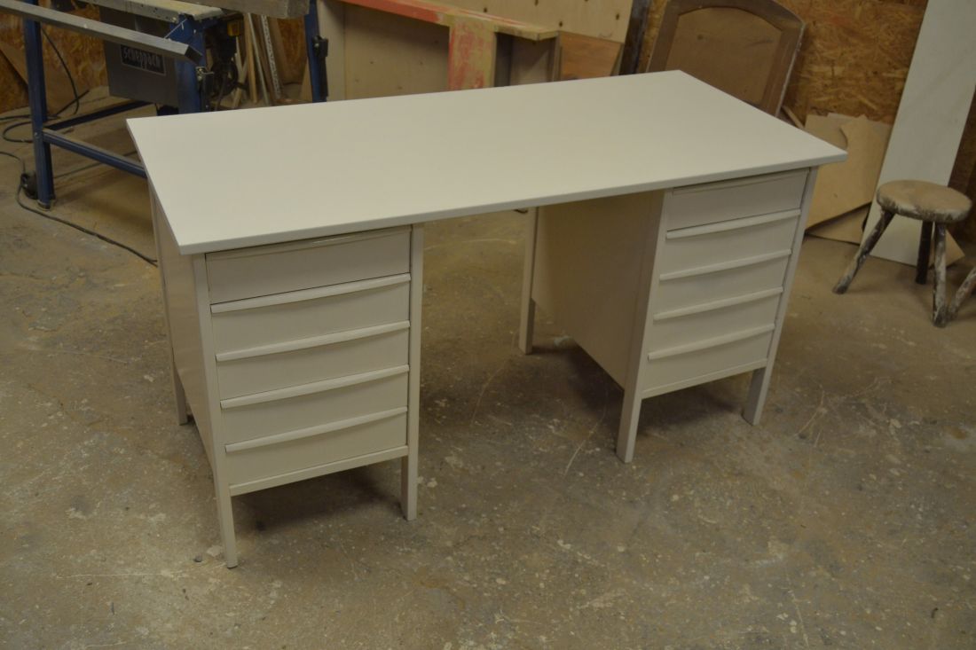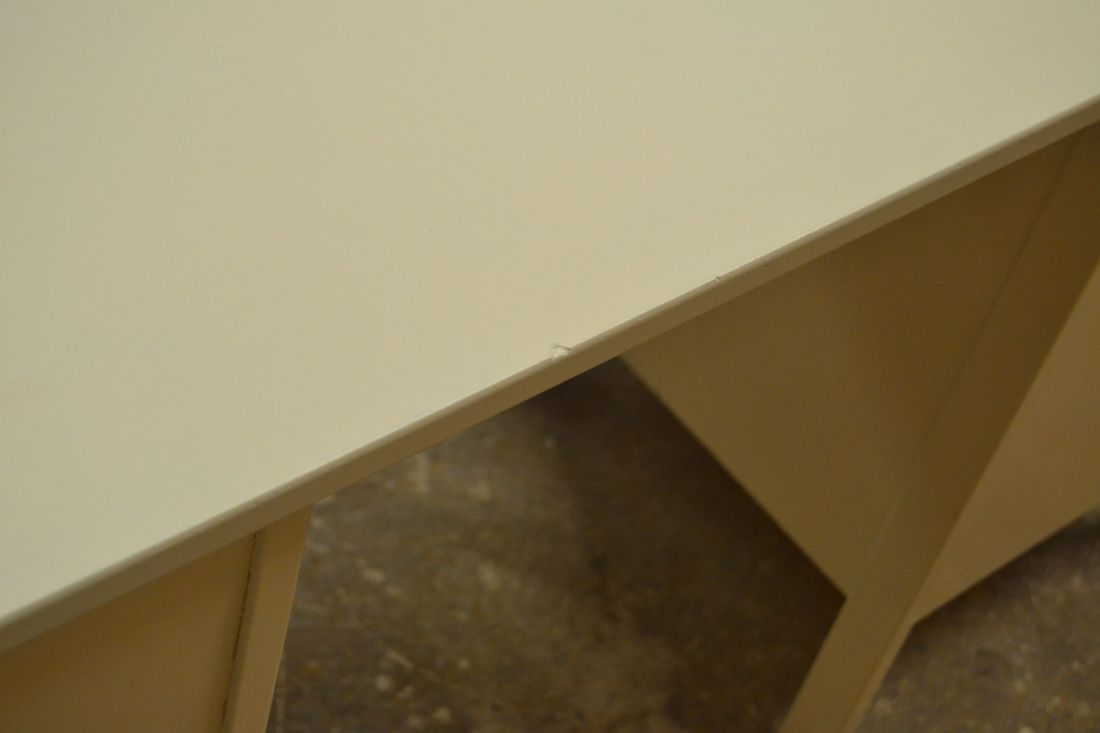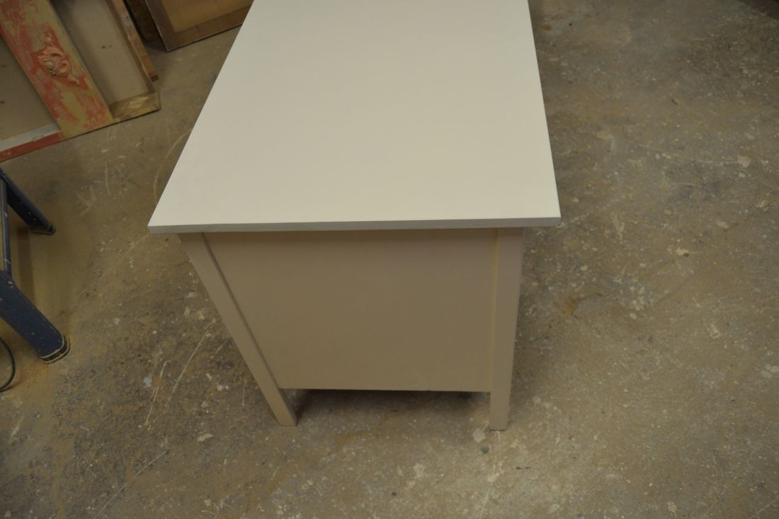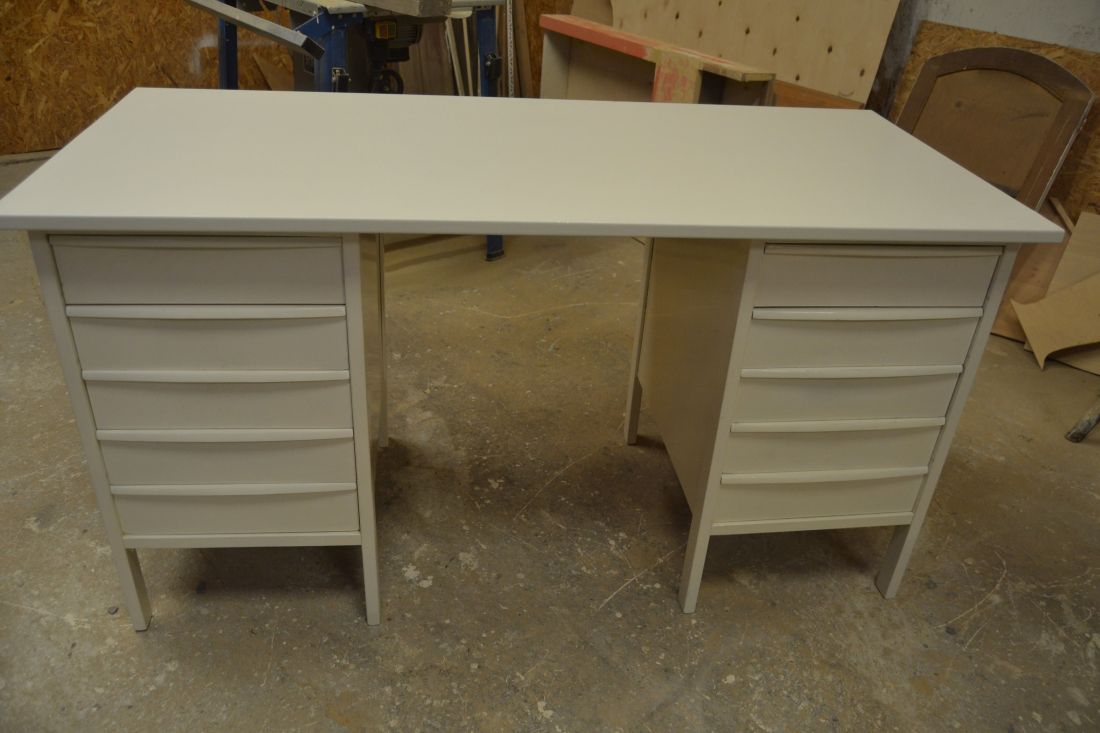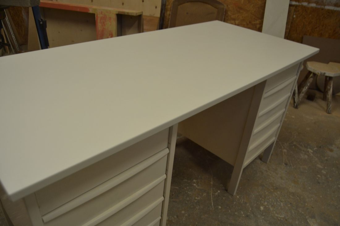 Mõõdud 870x400, kõrgus 985 mm. Valget värvi sekretär-kummut-kirjutuslaud. Ülal avaneb luuk tugedele tööpinnaks, üks tugi liigub veidi raskelt välja. tööpinnal riiulid ja sahtlid, luugi lukk töökorras. Allosas 3 sahtlit. Esineb kriime, täkkeid, toonierinevusi, kasutustunnuseid, kulumist, parandusjälgi.