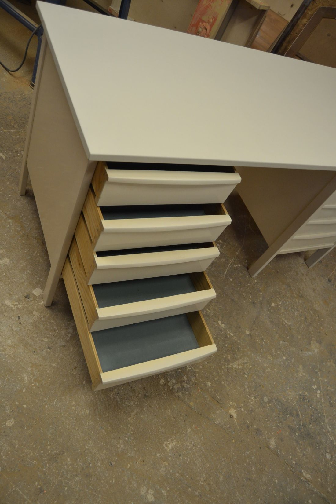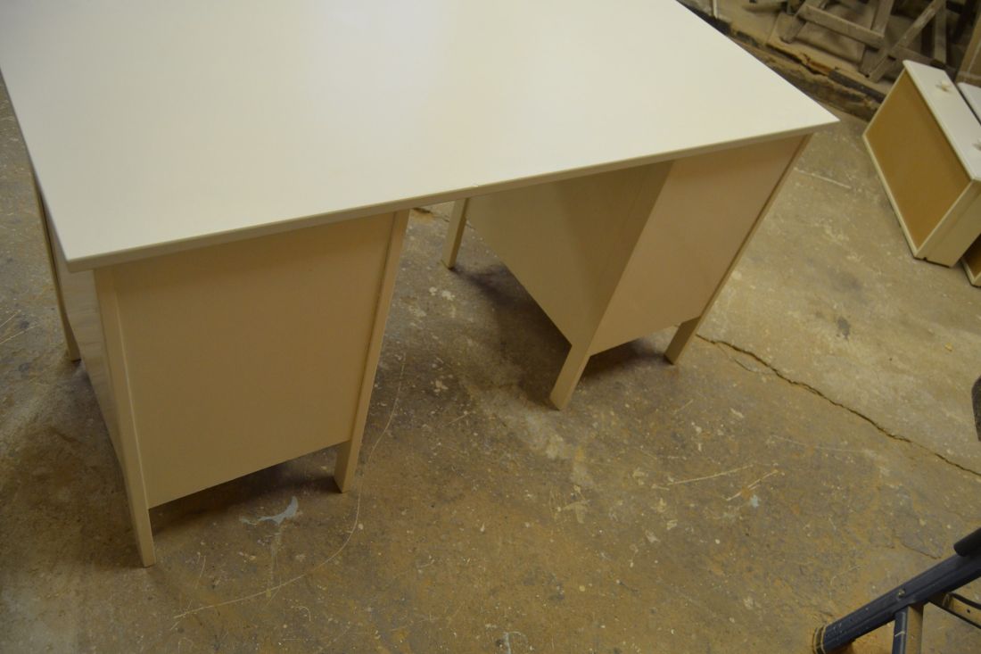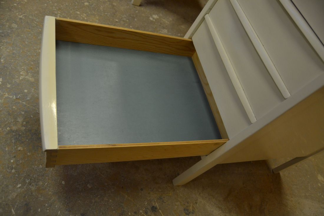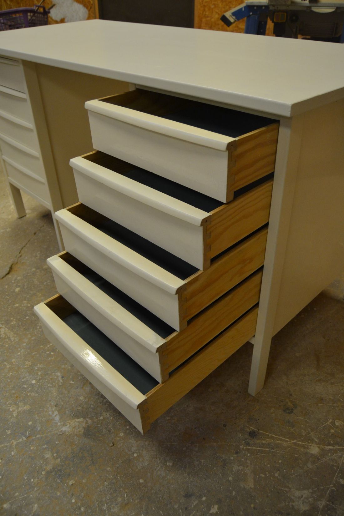Mõõdud 870x400, kõrgus 985 mm. Valget värvi sekretär-kummut-kirjutuslaud. Ülal avaneb luuk tugedele tööpinnaks, üks tugi liigub veidi raskelt välja. tööpinnal riiulid ja sahtlid, luugi lukk töökorras. Allosas 3 sahtlit. Esineb kriime, täkkeid, toonierinevusi, kasutustunnuseid, kulumist, parandusjälgi.