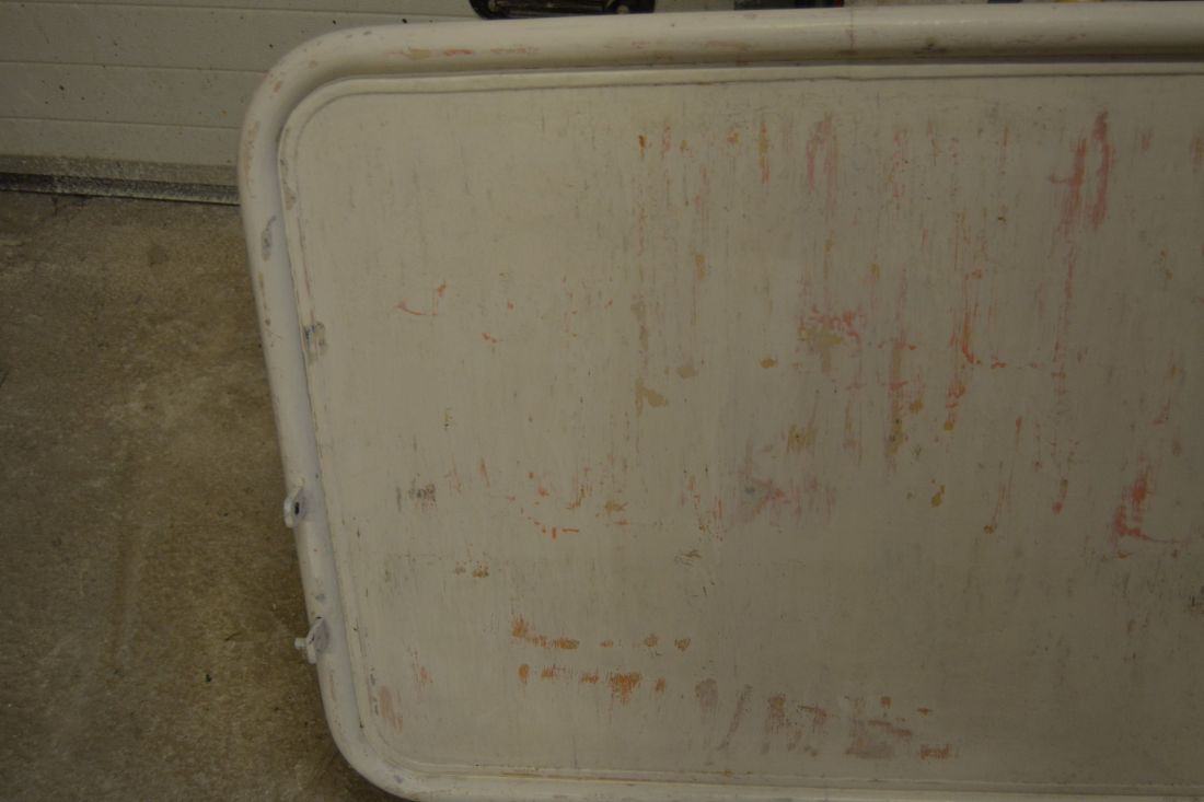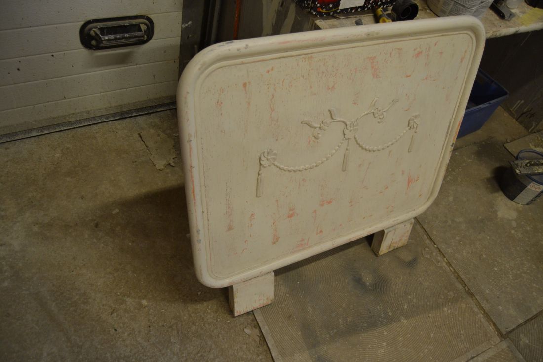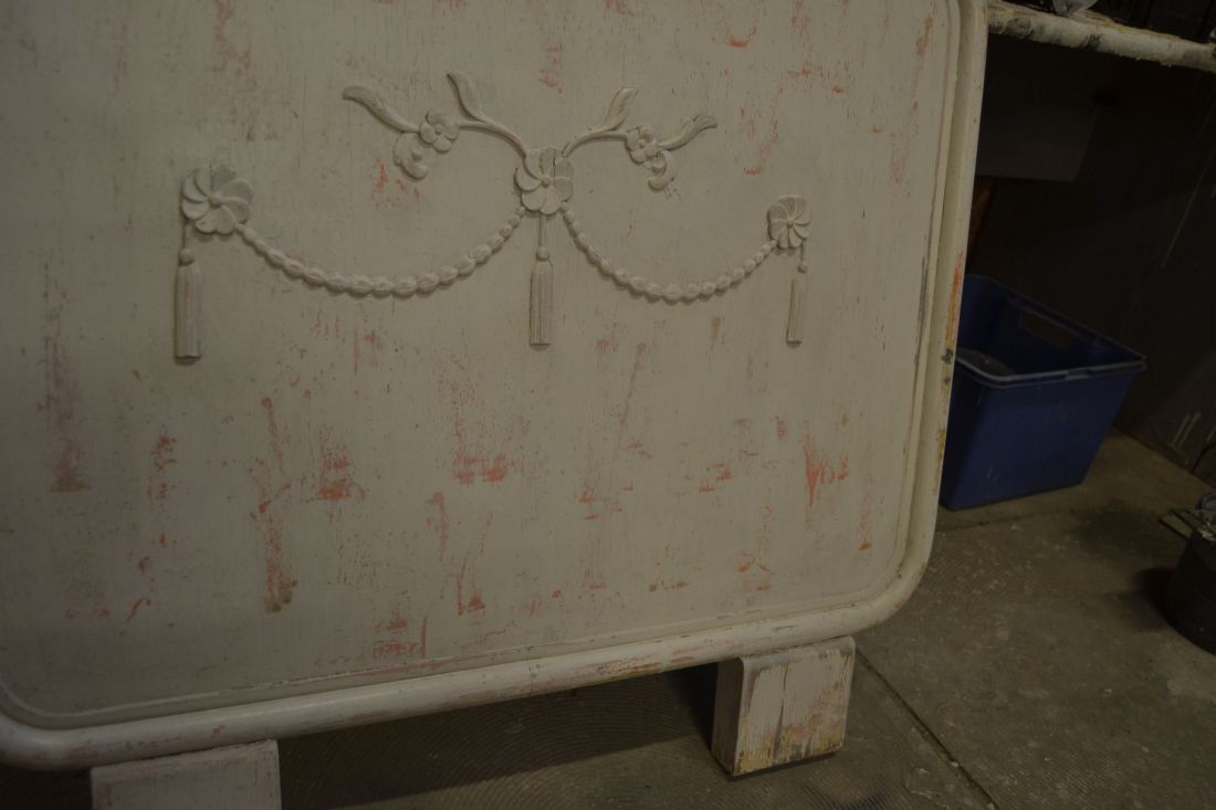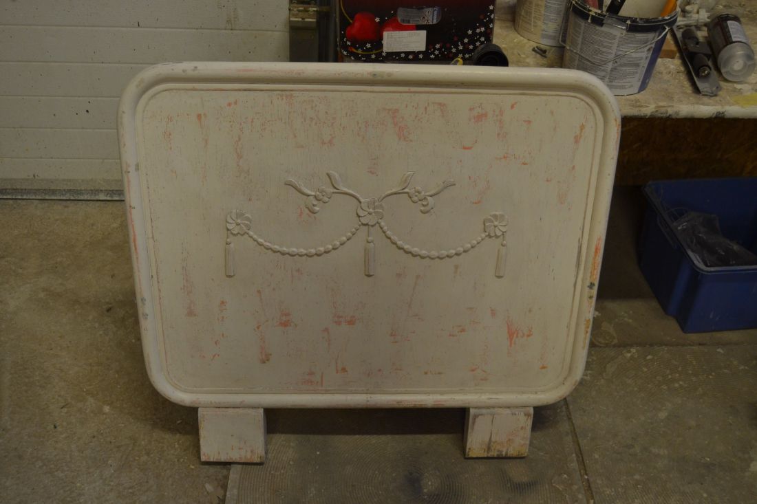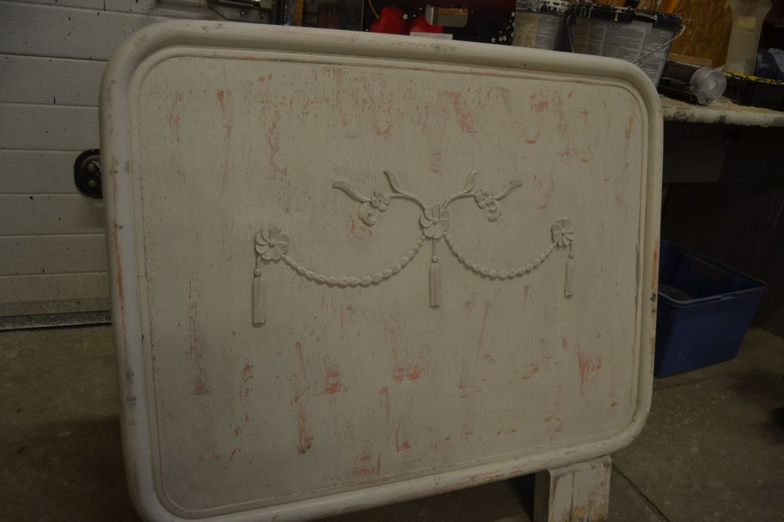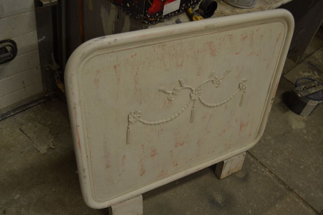 Mõõdud 900 (laius) x 820 mm. Vana voodiots. Metallraamil, keskmine osa vineer või puit. Jalaosad puidust. Väga raske ja stabiilne. Viimistlus rustikaalne, näha mitmeid värvikihte, lahtine värv eemaldatud ja viimistlus kergelt vanutatud. Esineb kriime, täkkeid, kulumist, ebatasasusi, kasutustunnuseid, kergelt korrosiooni. Saab kasutada näiteks seina ja madratsi vahel.