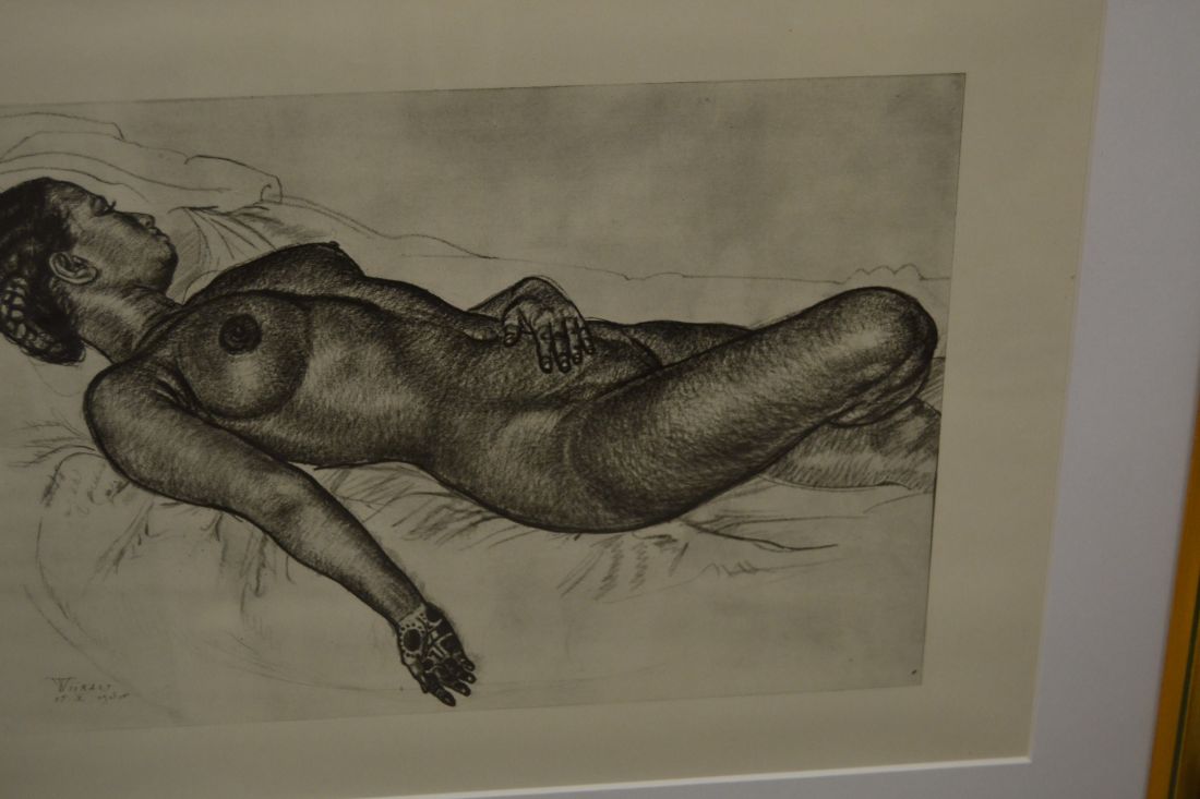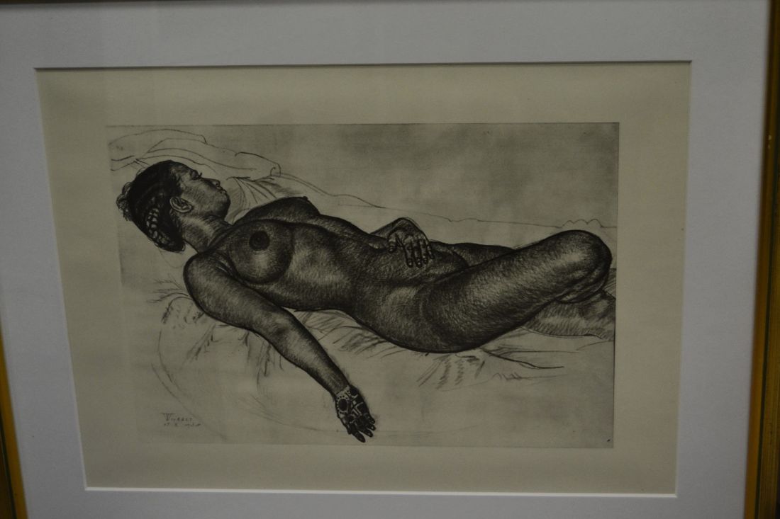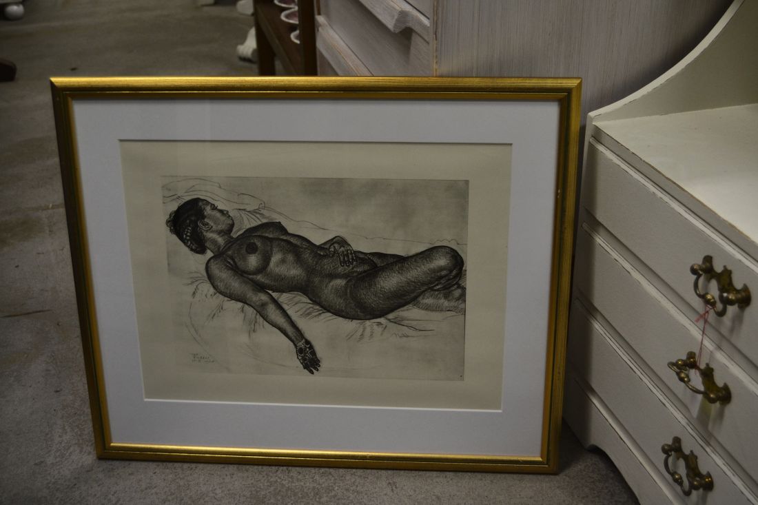 Mõõdud raamiga 520 x 430mm. Raamitud, klaasitud. 1958.a. trükirepro mapist. Lamav akt tätoveeritud käega. Joonistus 1938. Esineb  kriime, täkkeid, kasutustunnuseid. Ilusas, tavalisest suuremas raamis. Tarne pakiautomaati.