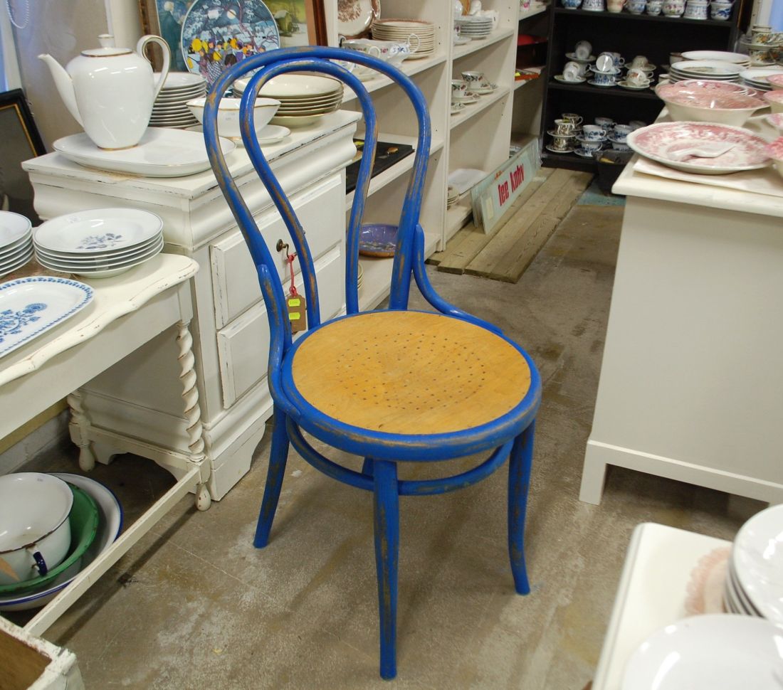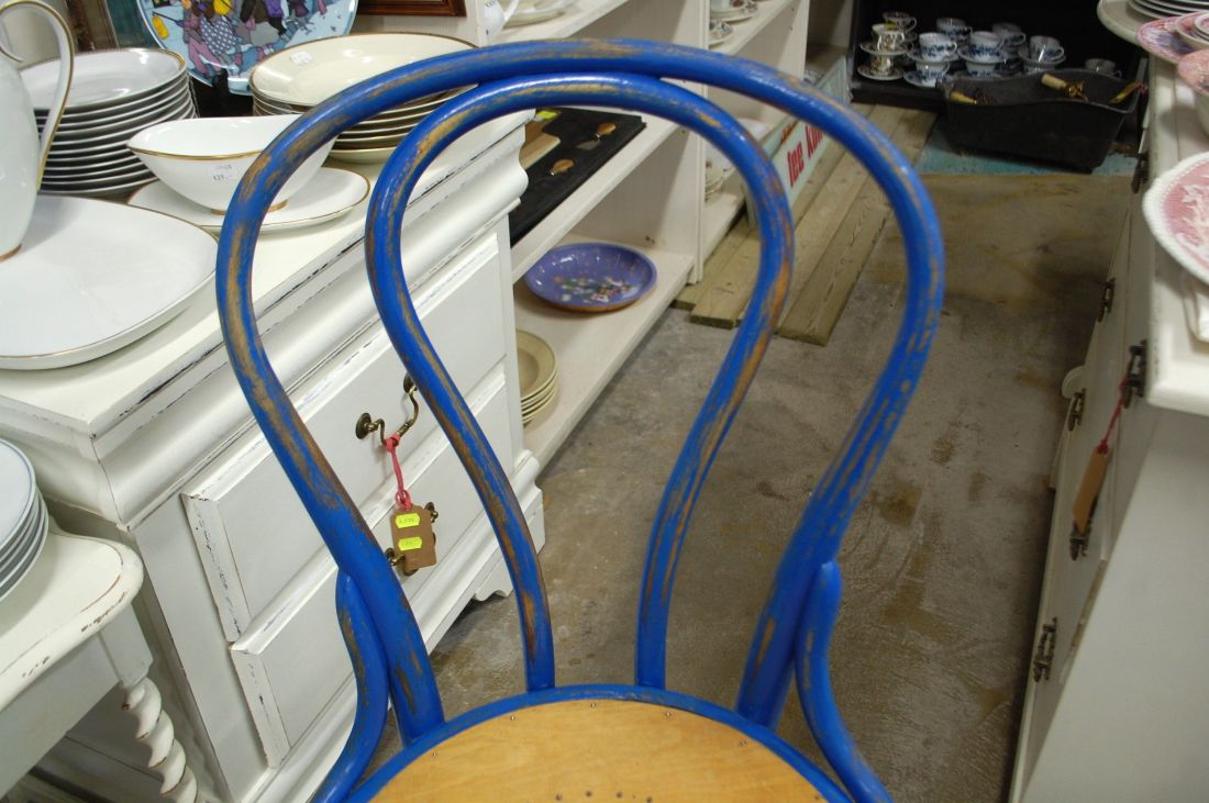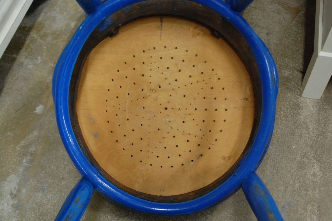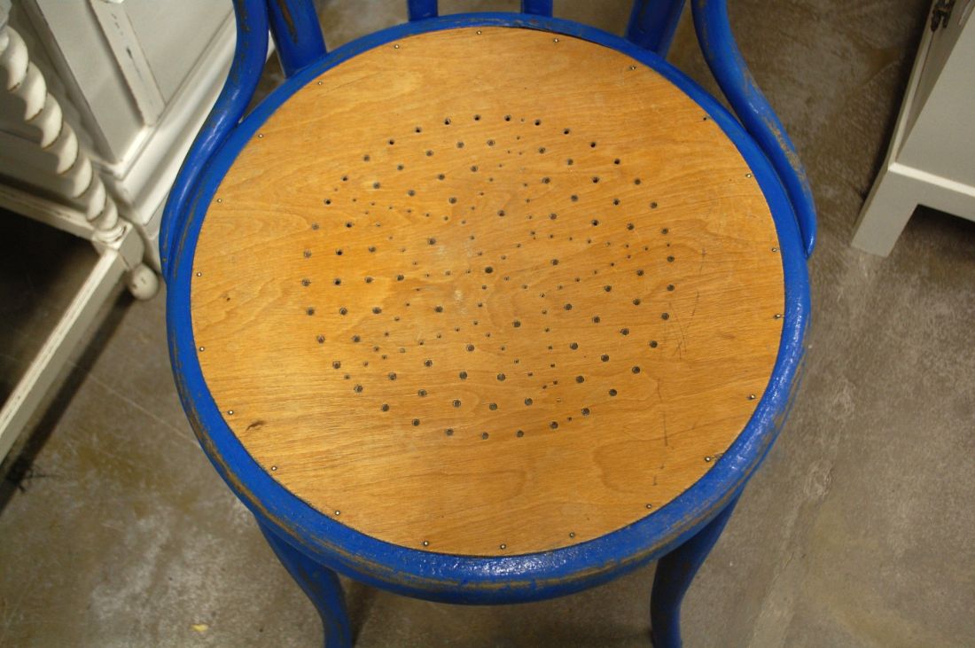 Laius 425, kõrgus 920, istumisosa maast 475mm. Vana puitraamil vineerpõhjaga klassikaline viinitool. Raam sinist värvi, värv vanutatud. Istme osa ilmselt hilisemast ajast, heledat tooni. Raamil märgistus Kohn Wien. Esineb kriime, täkkeid, kulumist, kuivamispragusid, ebatasasusi, toonierinevusi, kasutustunnuseid.