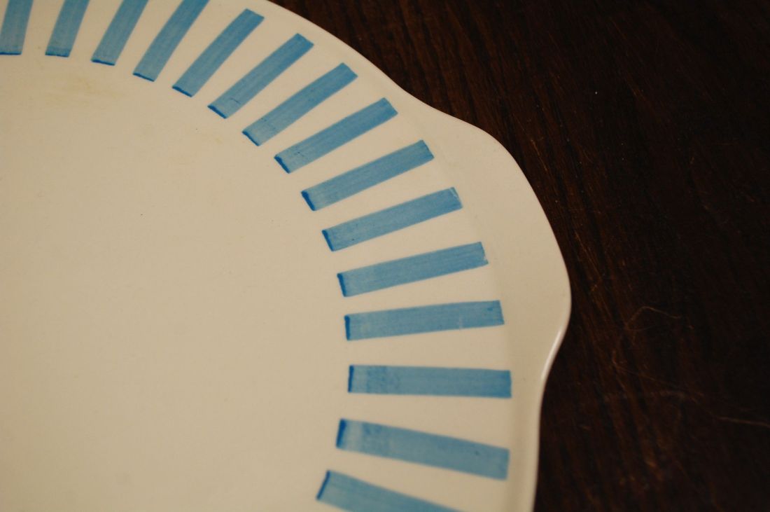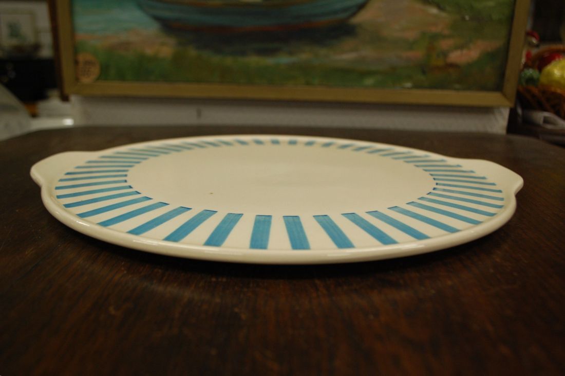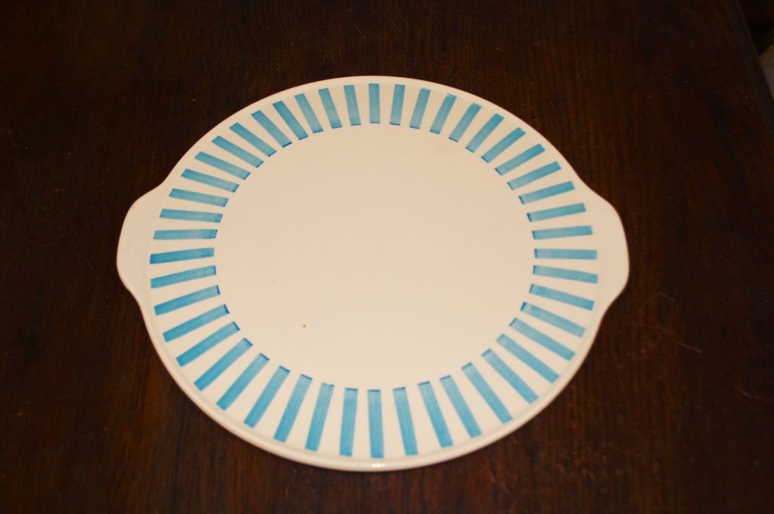 Mõõdud: 355 x 330mm, kõrgus 10mm. Naturaalne valge põhi, helesinine triibuline dekoor. V&B Saar, Ursel. Esineb väiksemaid kriime kasutusest. Tarne pakiautomaati