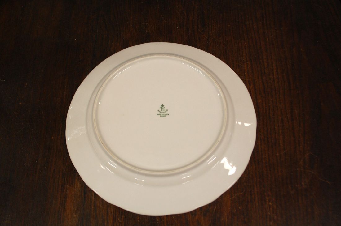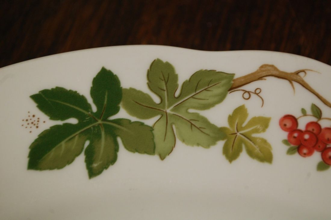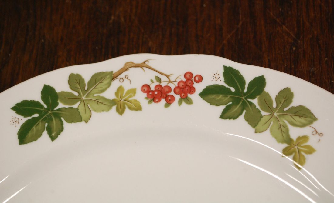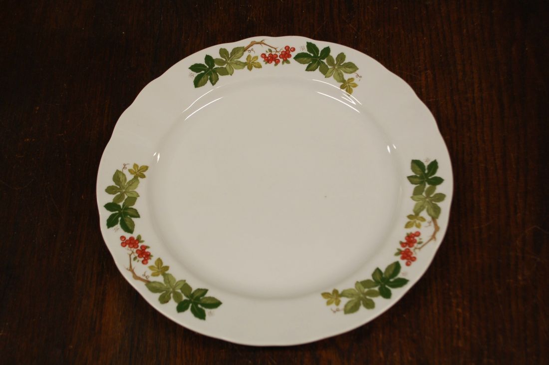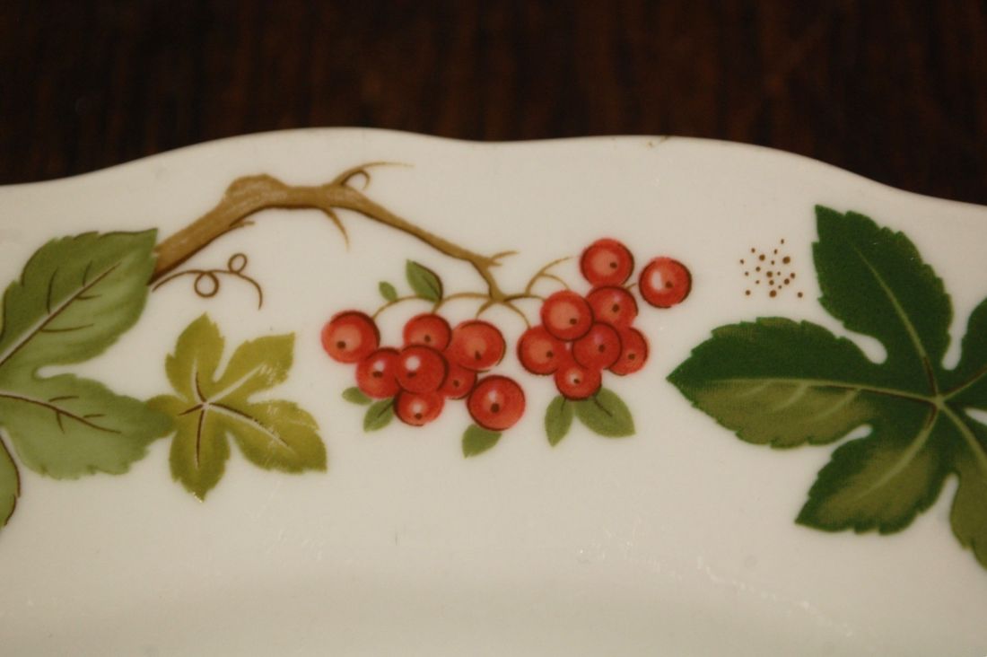 Mõõdud: 300 x 260mm, kõrgus 35mm. Ovaalne kergelt tõusmate servadega kena vaagen. Manufacture de Cadeaux Porcelaine, Prantsusmaa. Esineb väiksemaid kriime kasutusest. Tarne pakiautomaati