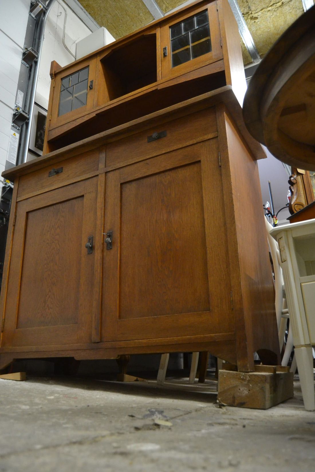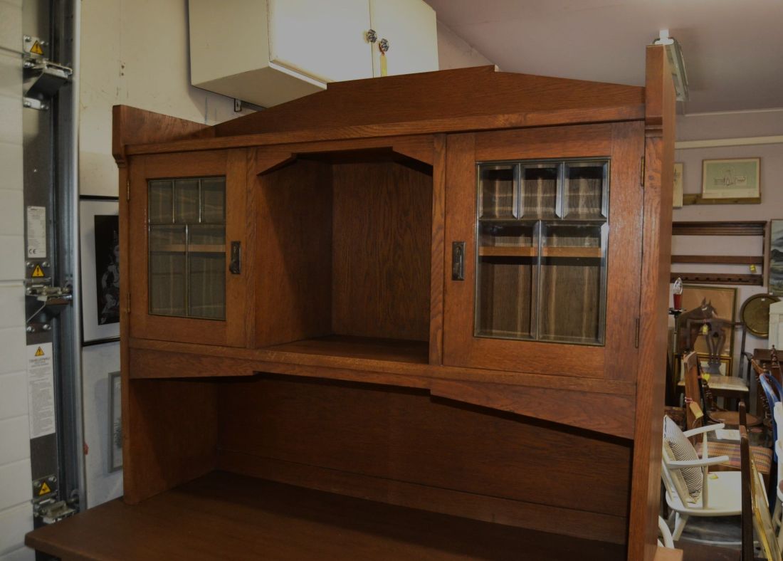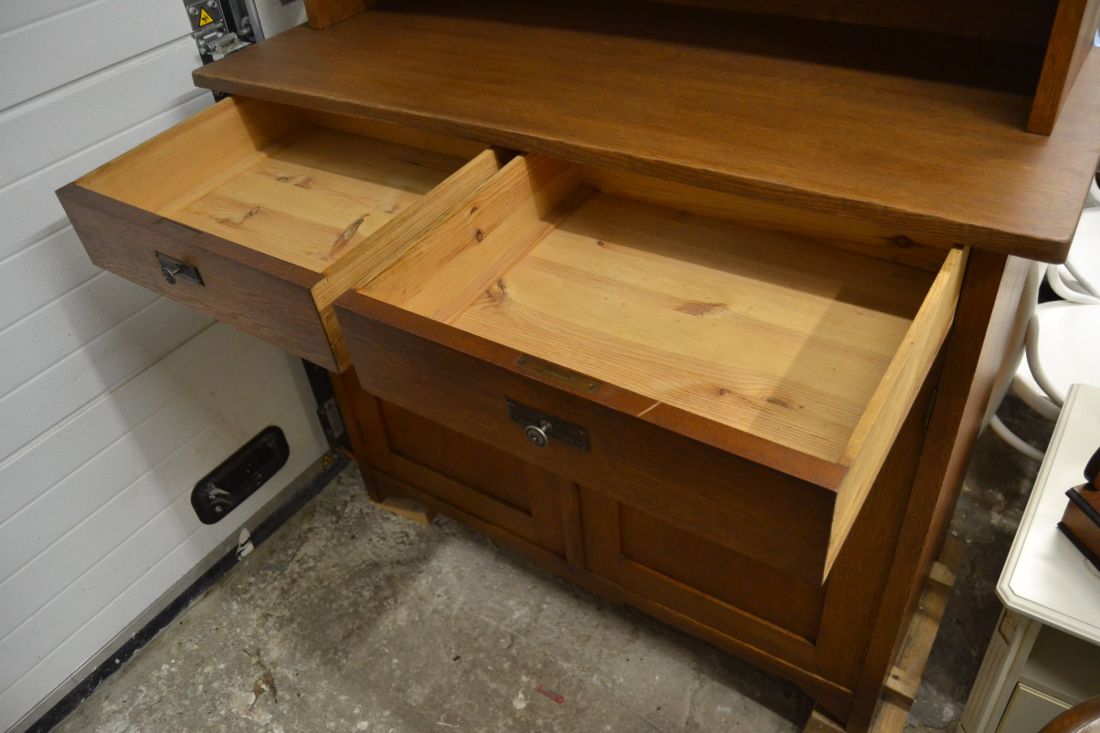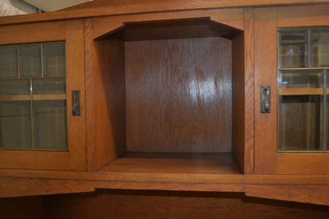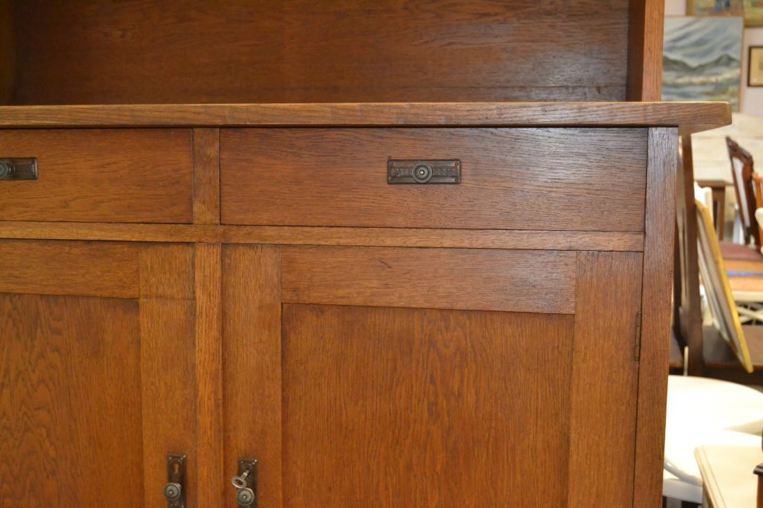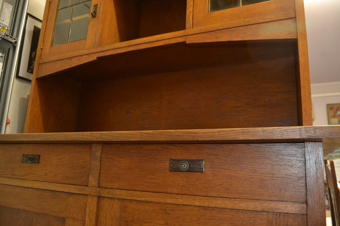 Mõõdud 1250x545, kõrgus 2020 mm. Suur raske vanem puhvetkapp. Ülal kahe uksega kapi osa, kappides riiul, ukse klaasid ruudumustriga, faasitud. Keskel avatud riiul. Allosas kaks sahtlit ja kahe uksega kapi osa. Kapis riiul. Uste lukud töökorras, 1 võti. Esineb kriime, täkkeid, kasutustunnuseid, toonierinevusi, parandusjälgi. Transport kahes osas. Riiulid ja sahtlid samuti eemaldatavad.