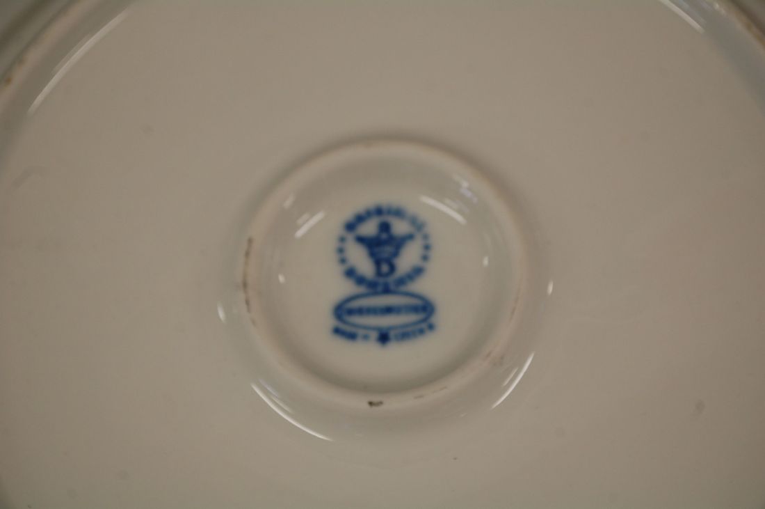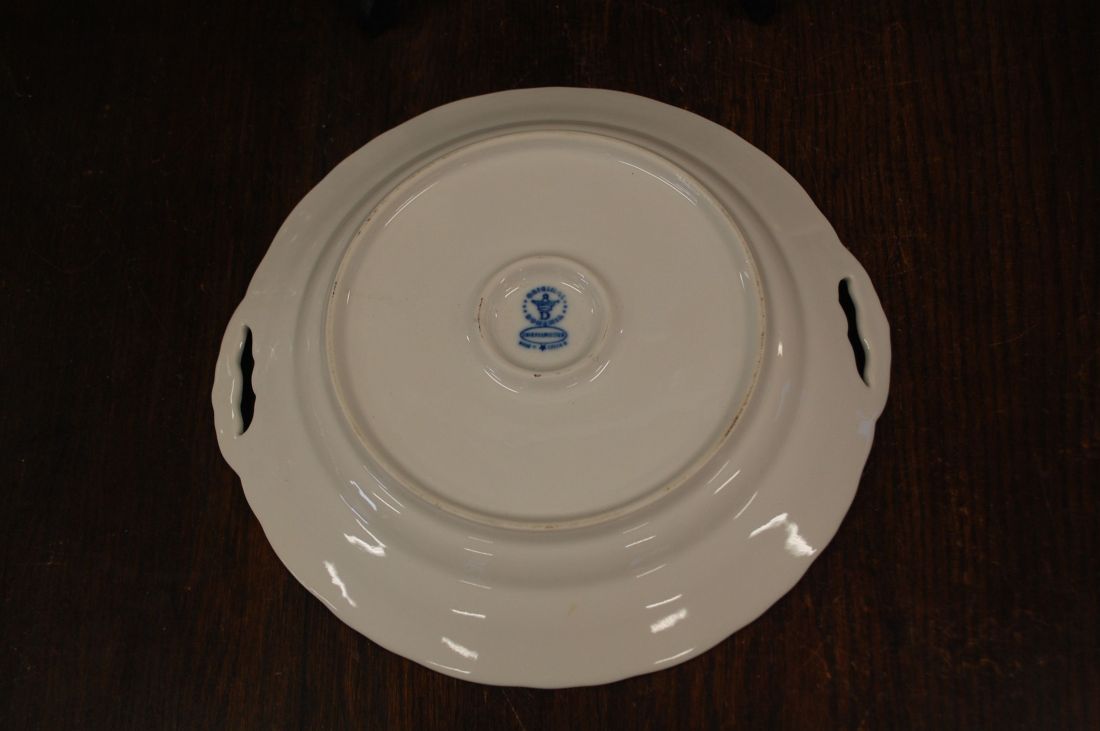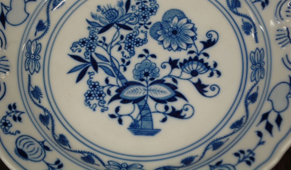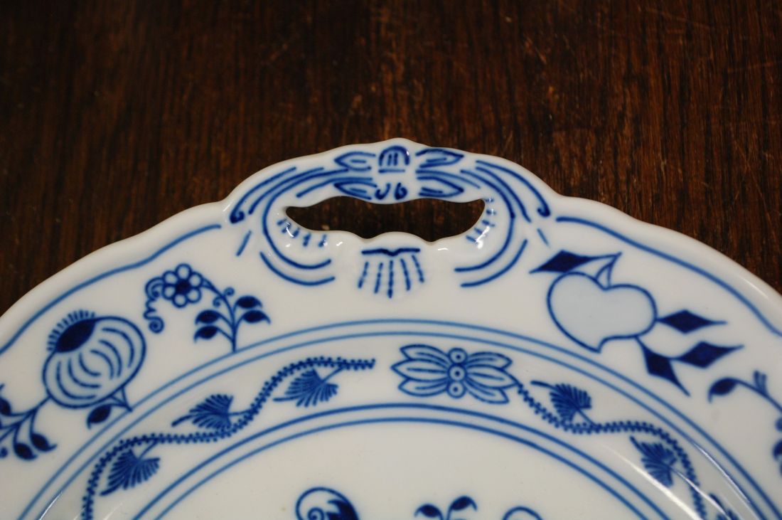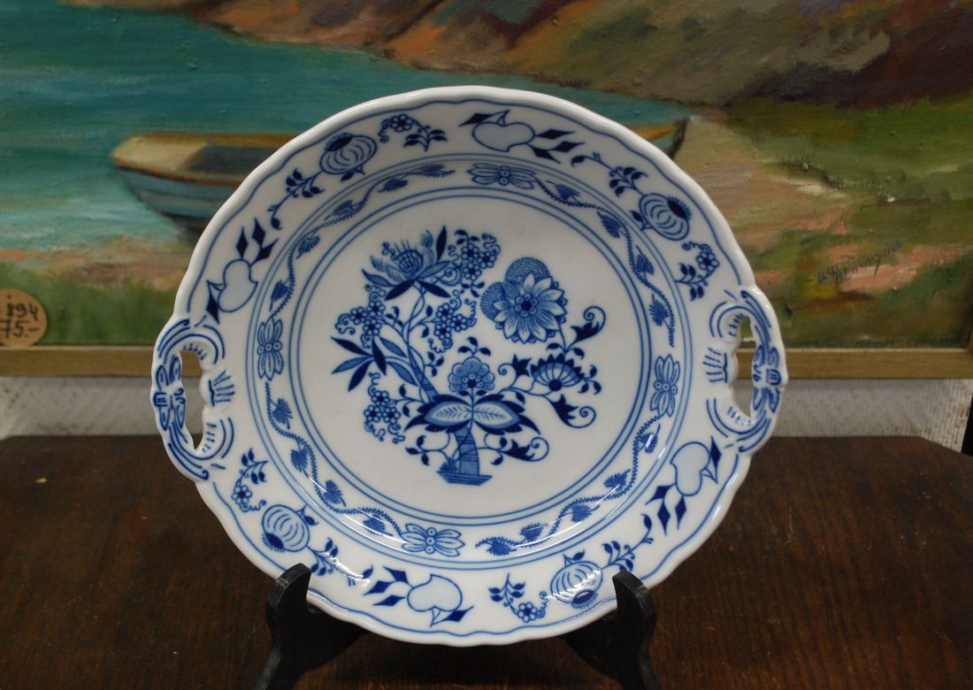 Mõõdud: 280 x 265mm, kõrgus 45mm. Sini-valge kena sibulamustriline sangadega  vaagen. Bohemia. Ilusas korras, võib olla mõni väiksem kriim kasutusest. Tarne pakiautoaati