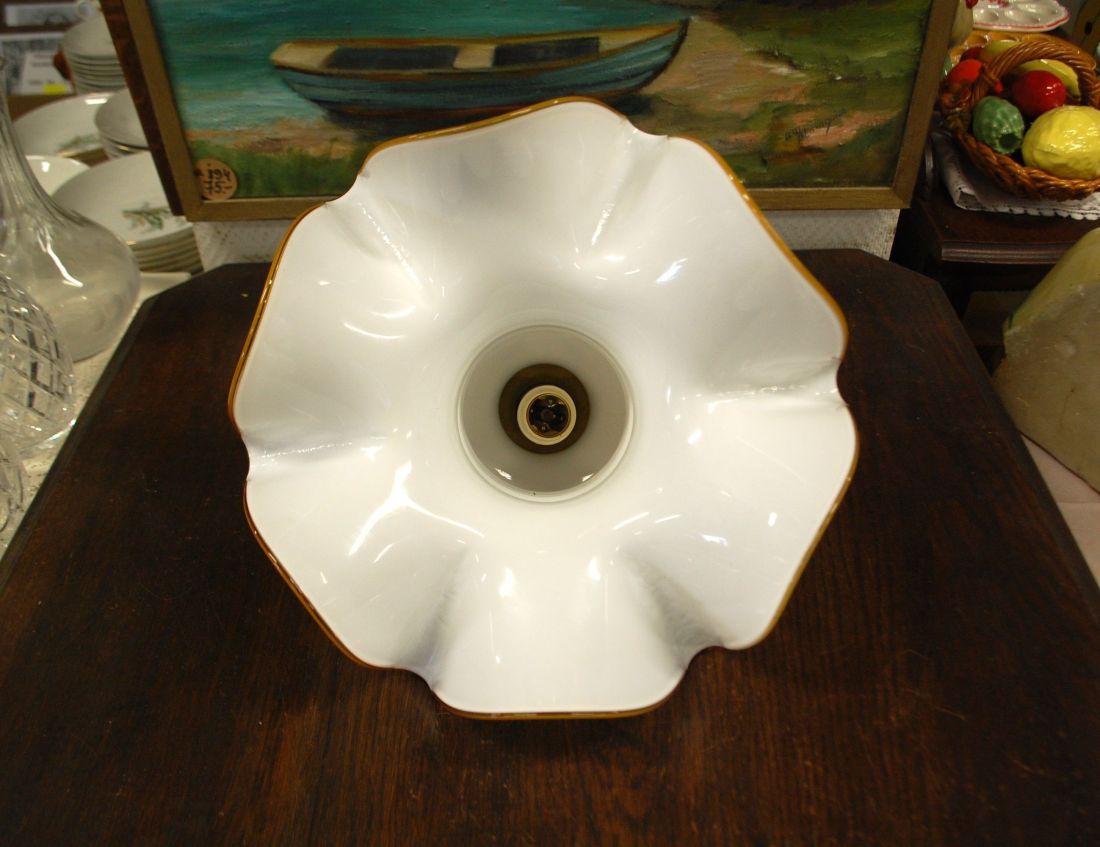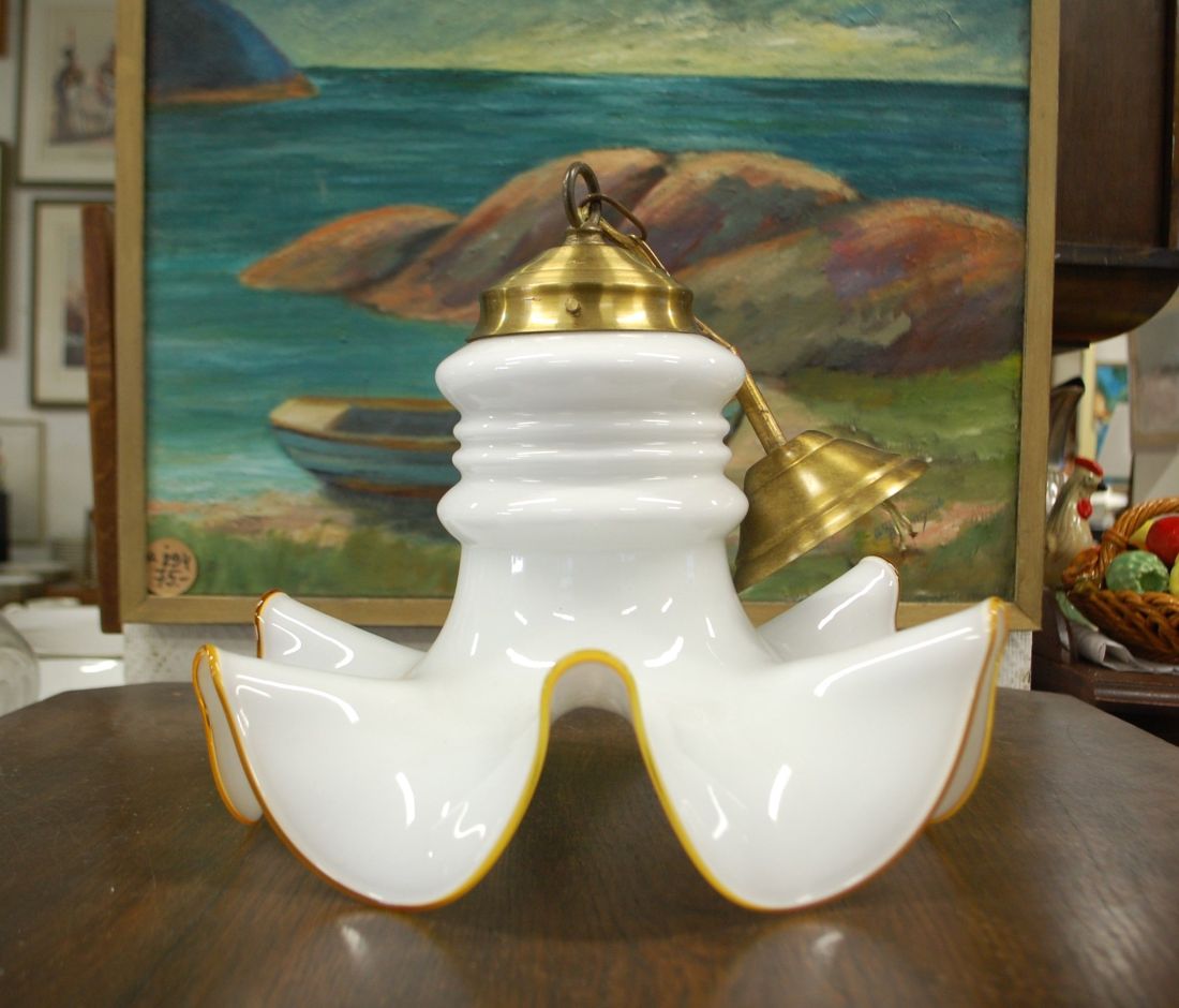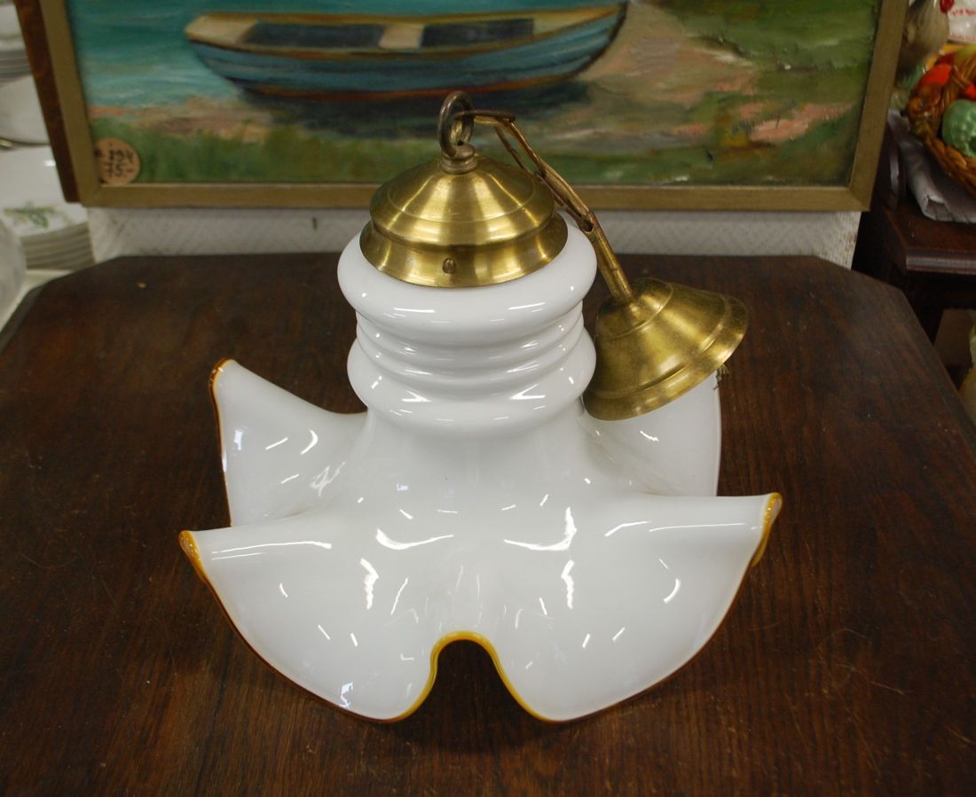 Mõõdud: lambi läbimõõt ca 350mm, kõrgus 290mm, kogukõrgus 450mm. Kollase metalli-ja piimja valge lainelise klaaskupliga uhke vana laevalgusti. E 27 pirnipesa. Soovitav enne kasutusele võttu lasta elektrikul üle vaadata. Mõned kriimud, kasutustunnused, Tarne pakiautomaati