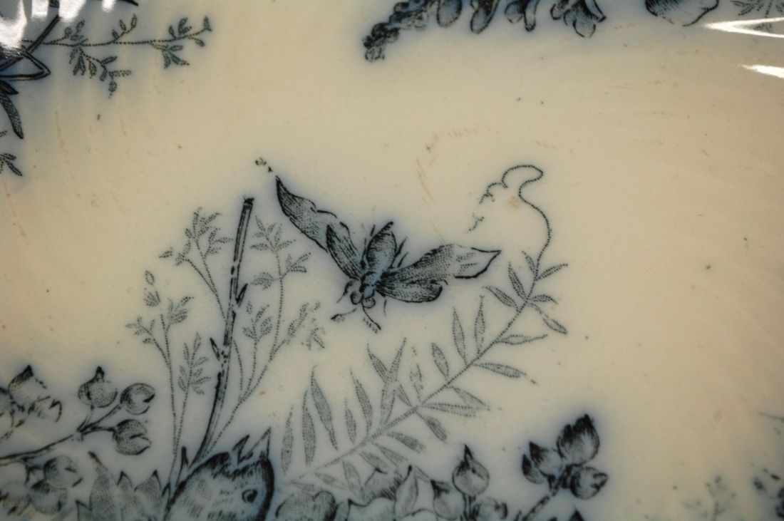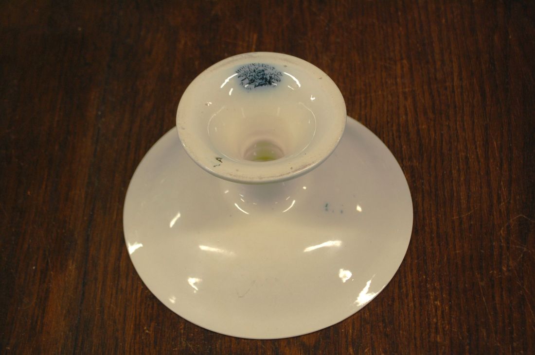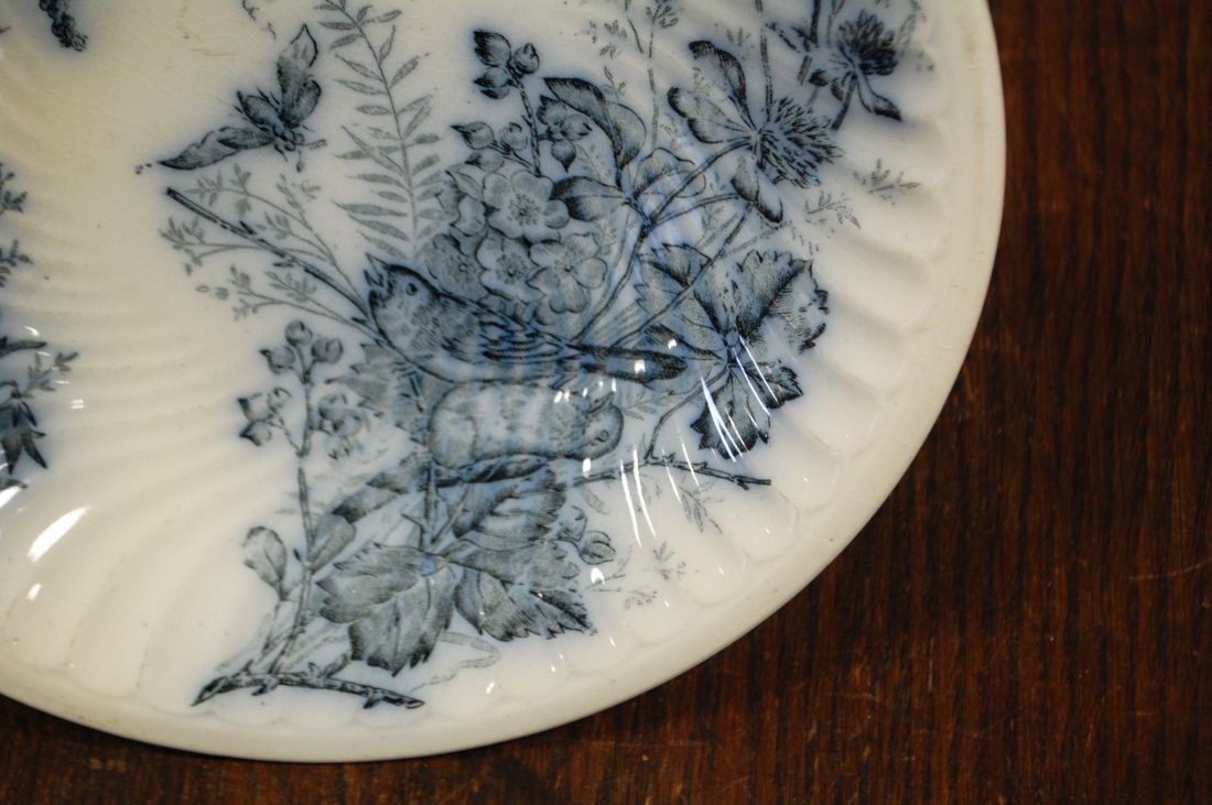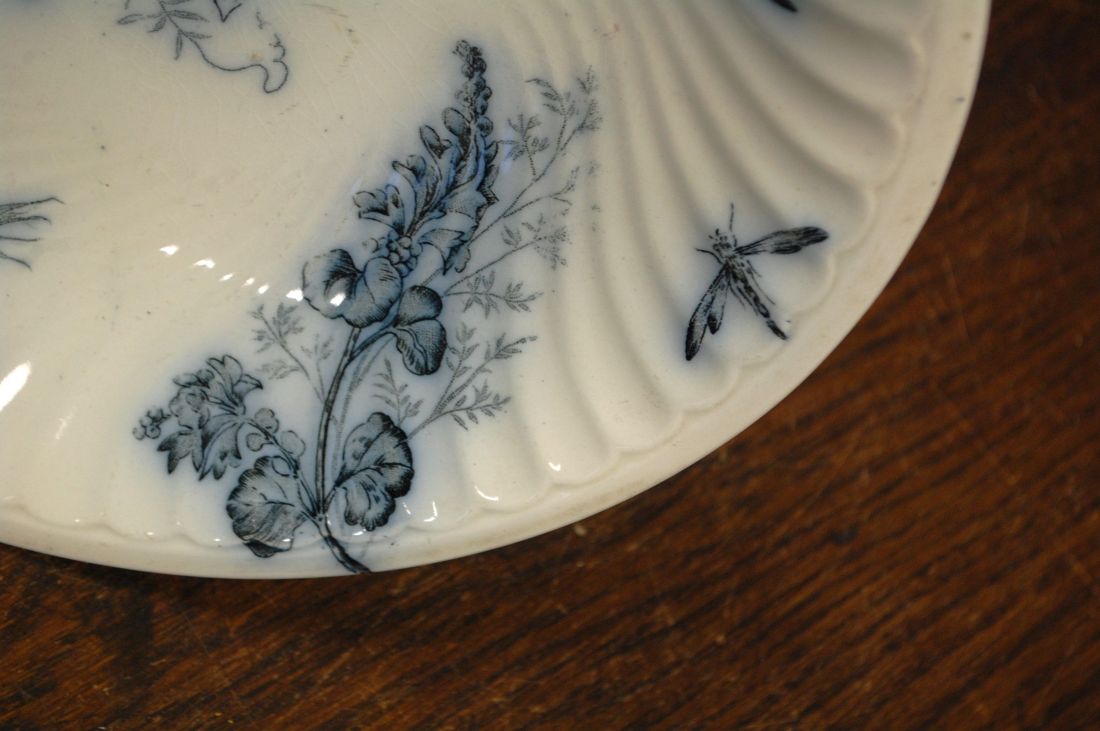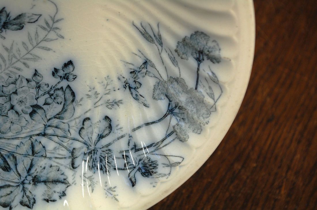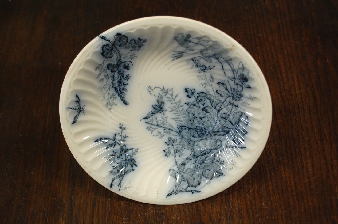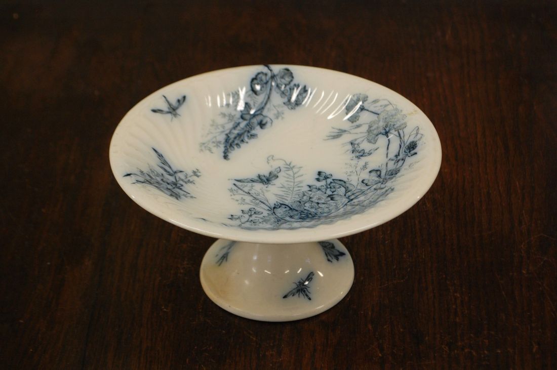 Läbimõõt 220mm, kõrgus 110mm. Sinise imelise dekoori- ja reljeefse pinnamustriga uhke jalal vaagen. Mouzin-lecat & Cie, Nimy, Belgia .Toodeti 18.saj lõpp, 19.saj algus. Esineb krakleed ja jala servas tumedam koht, pilt. Tarne pakiautomaati