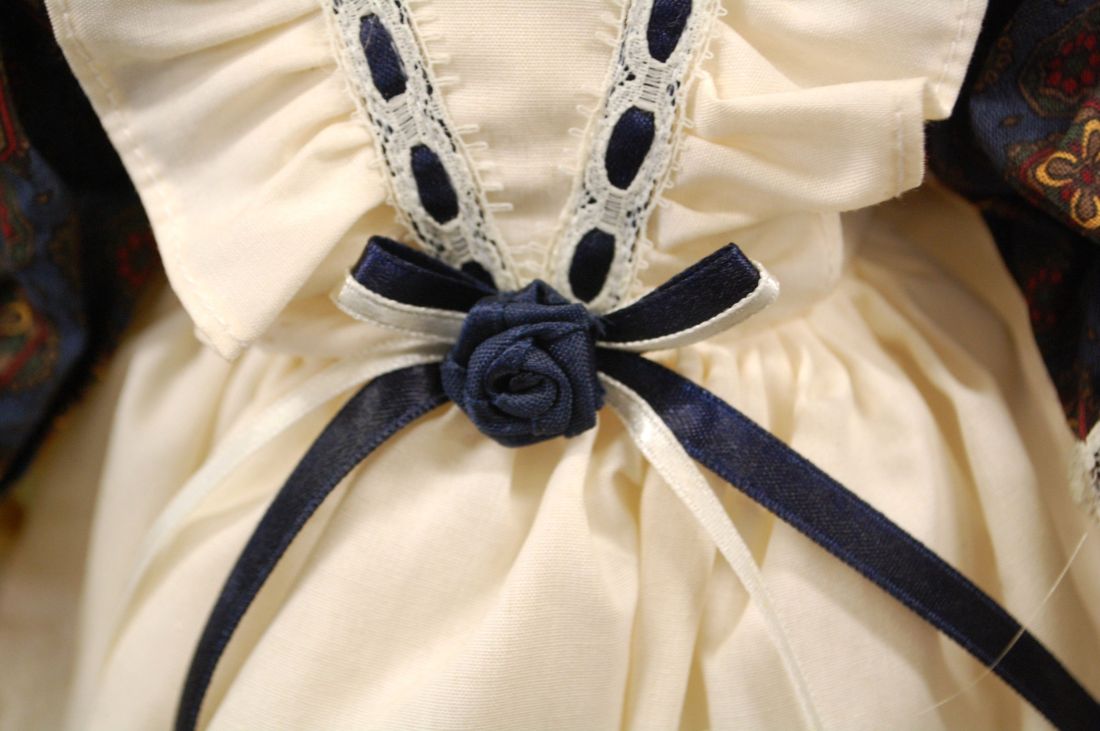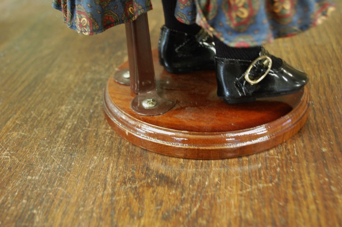 Pikkus ca 420mm. heledate lokkis jusste ja kauni kleidiga Gayle Alberon Collection nukk. Nuku pead saab liigutada nii ette-taha kui ka külgedele. märgistusega kuklal. Puidust alus kuulub komplekti.