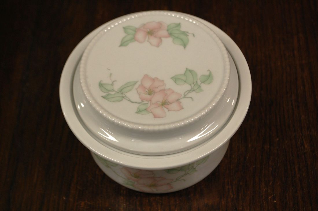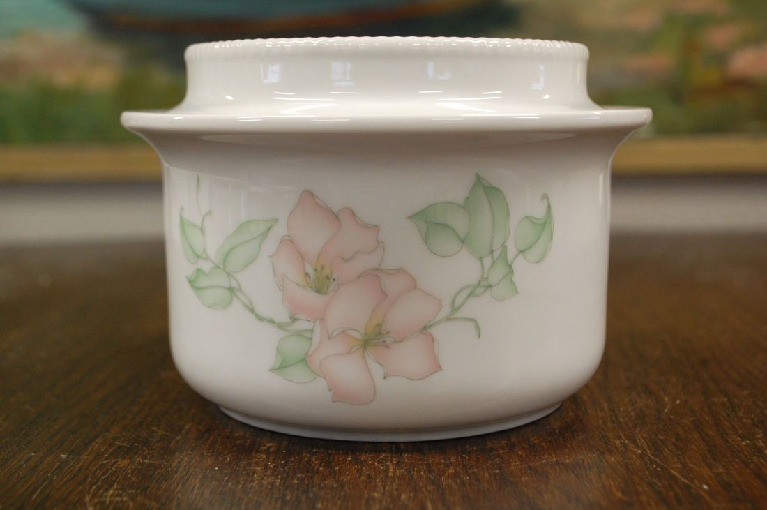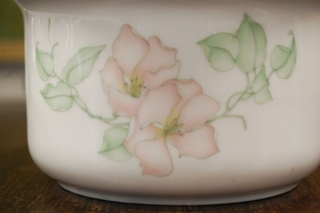 Läbimõõt 145mm, kõrgus 95mm. Valgel põhjal õrnad roosad õunapuuõied. toodeti 1954-90, Bavaria, Saksamaa. Ilusas korras, võib olla mõni väiksem kriim kasutusest. Tarne pakiautomaati