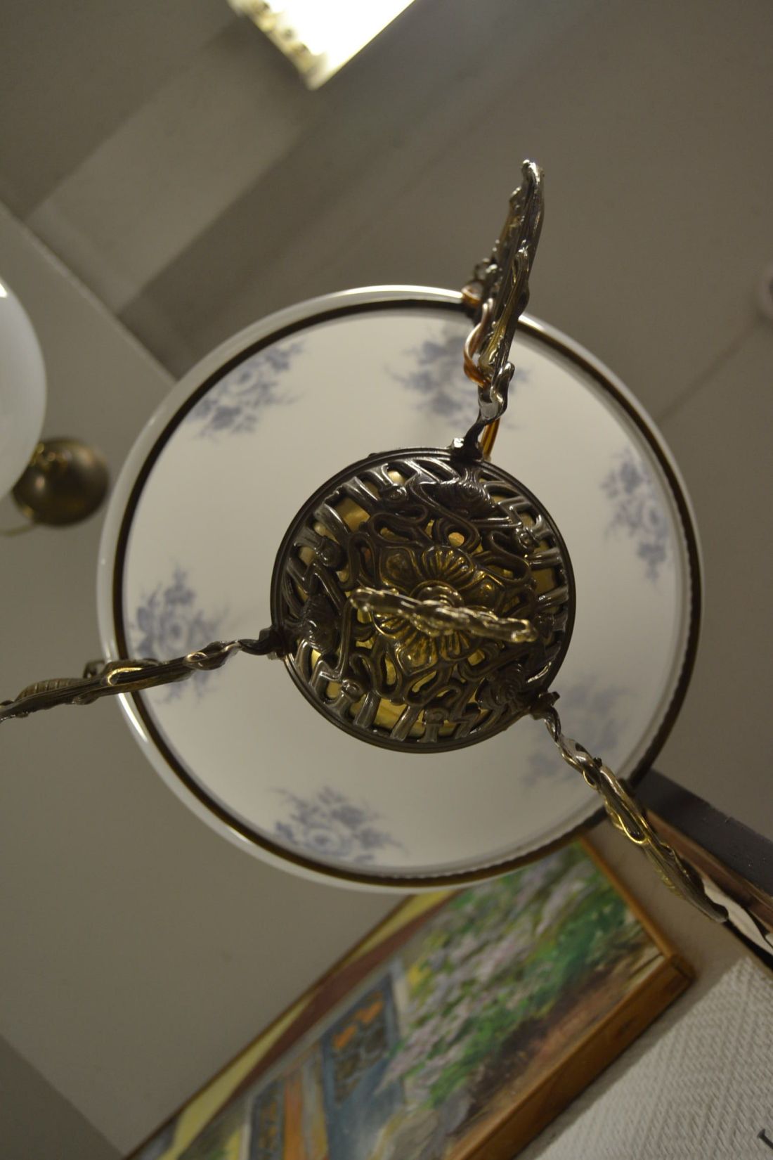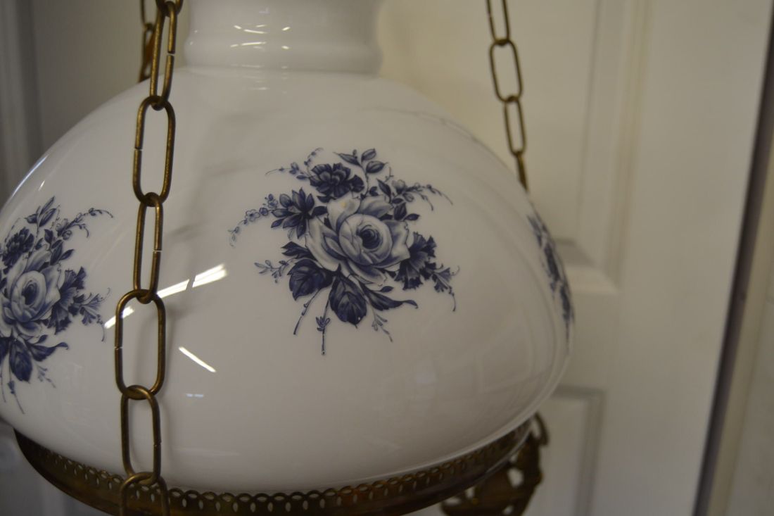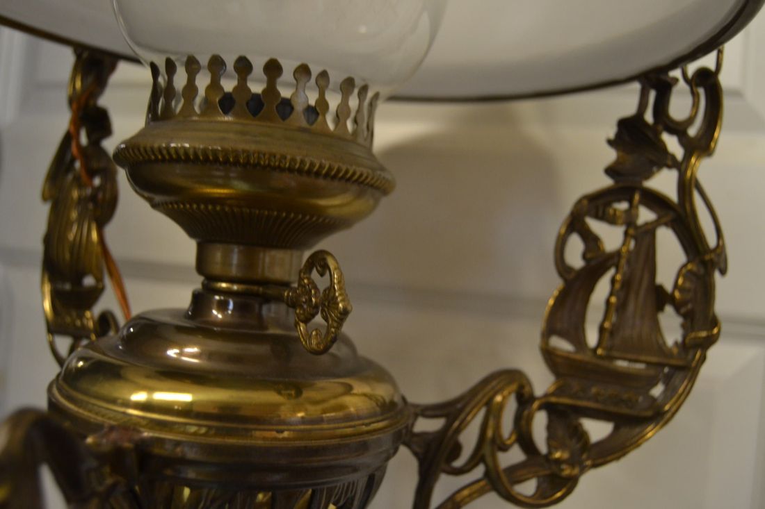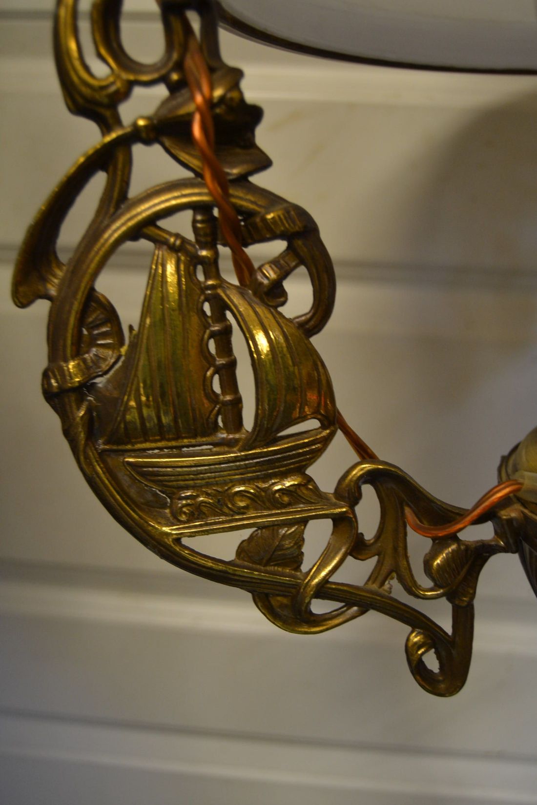 Mõõdud läbimõõt 315, kõrgus 980 mm. Kettidest annab kõrgust veidi vähendada. Metallraamil, raamil purjeka motiiv. Topelt klaasiga, sisemine meenutab petrooleumlambi klaasi, välimine valge piimklaas, sinise dekooriga. E27 pirnipesa. Mõned kriimud, täkked, kasutustunnused. Elektri osa soovitav elektrikul enne kasutusele võttu lasta üle kontrollida. Tarne detailidena.