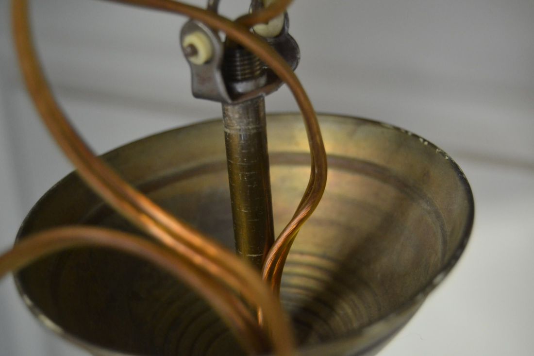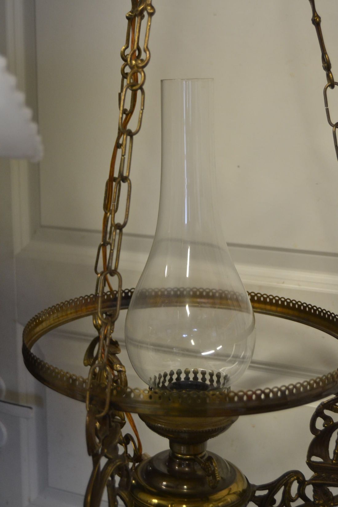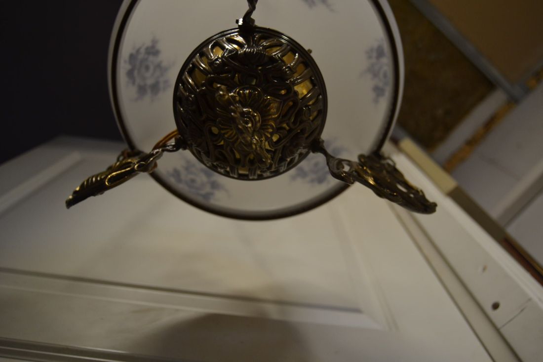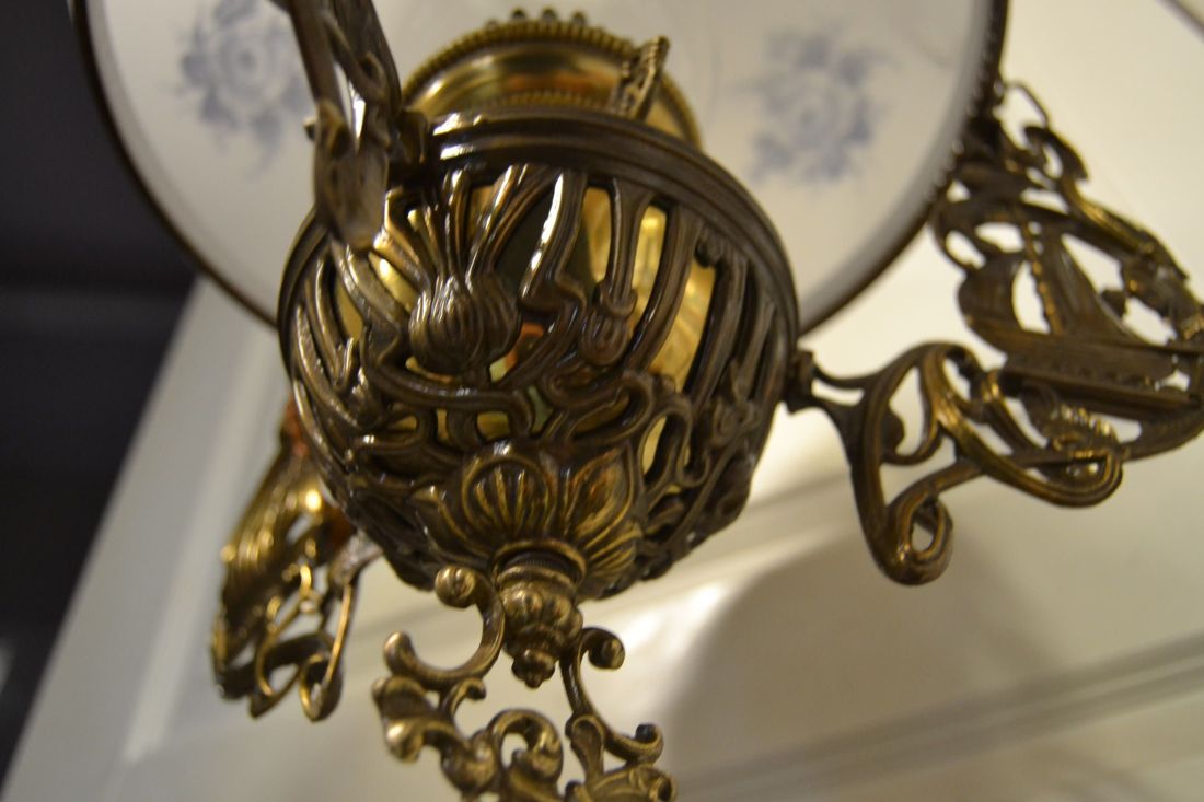 Mõõdud läbimõõt 315, kõrgus 980 mm. Kettidest annab kõrgust veidi vähendada. Metallraamil, raamil purjeka motiiv. Topelt klaasiga, sisemine meenutab petrooleumlambi klaasi, välimine valge piimklaas, sinise dekooriga. E27 pirnipesa. Mõned kriimud, täkked, kasutustunnused. Elektri osa soovitav elektrikul enne kasutusele võttu lasta üle kontrollida. Tarne detailidena.