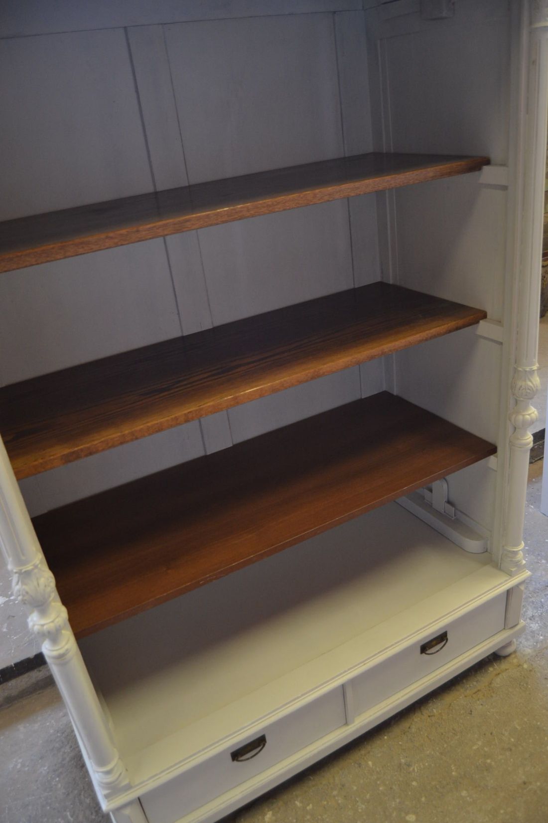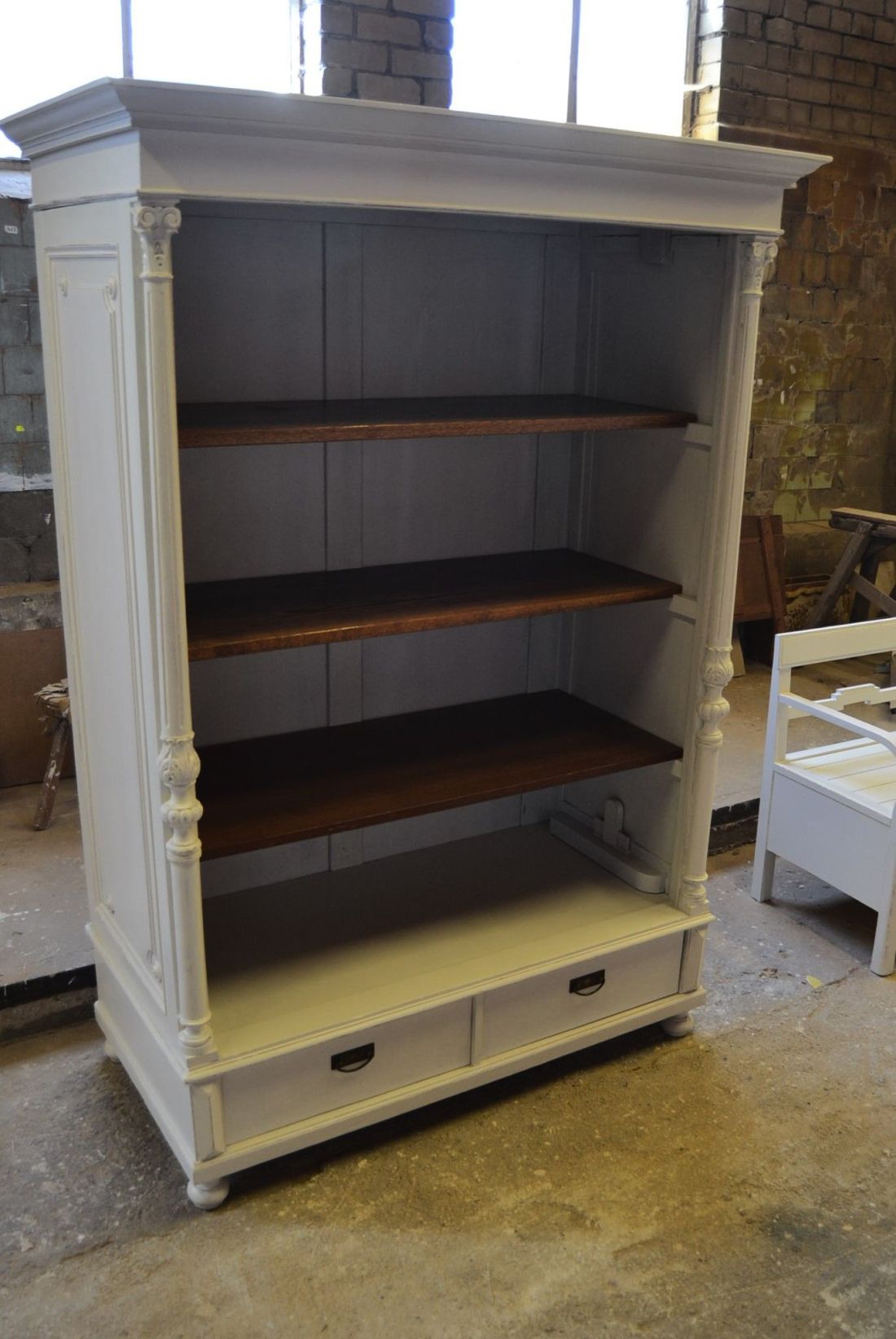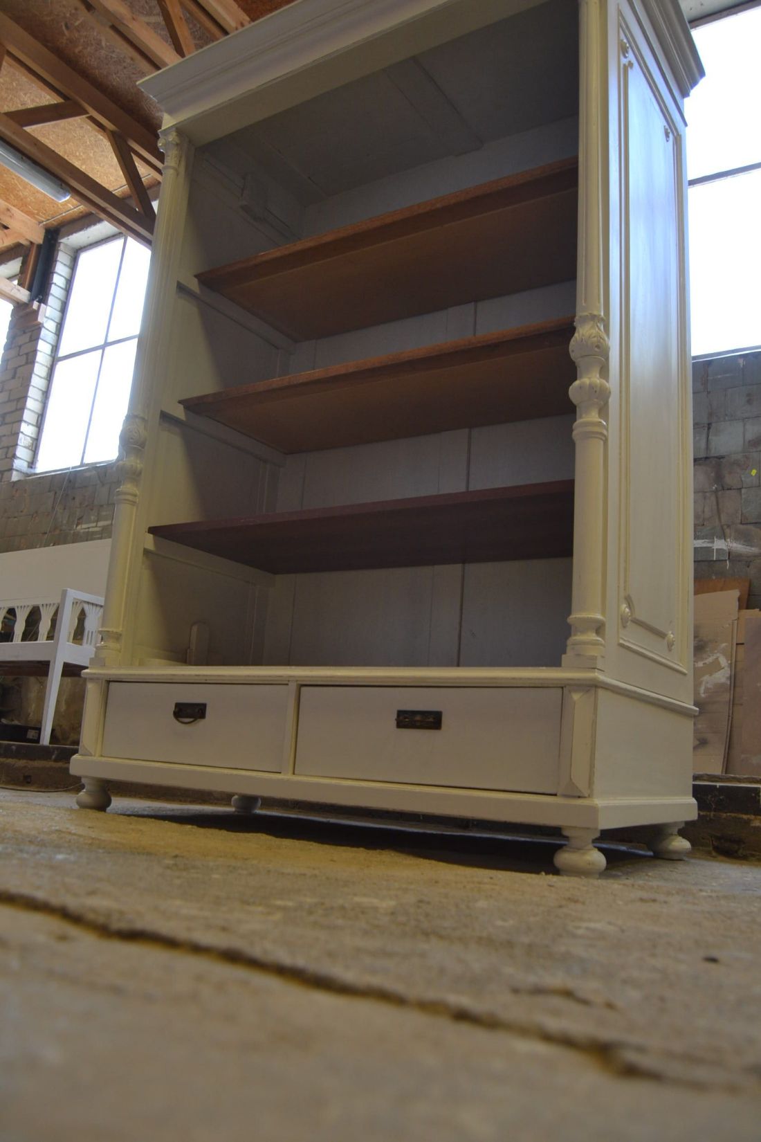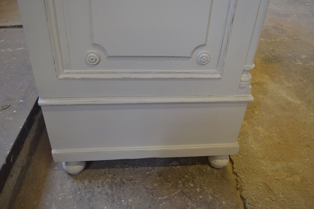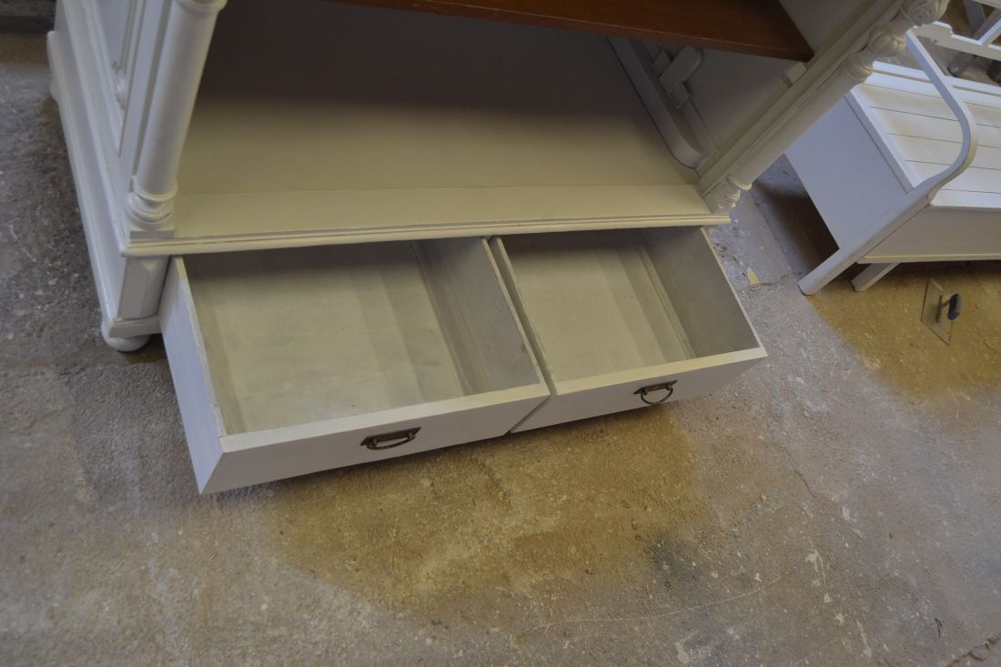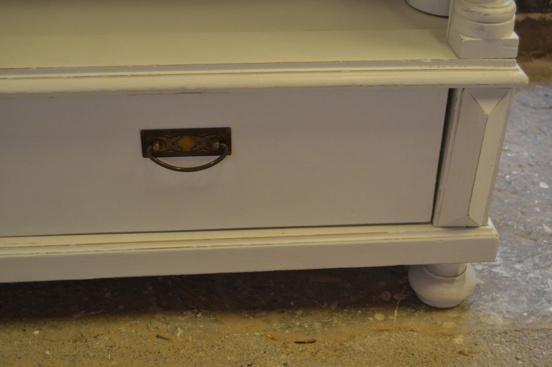 Mõõdud 1395 x 710, kõrgus 1990 mm. Vana kapp. Allosas 2 sahtlit. Ülal 3 tugevat laia riiulit. Kapp ise vana, valgeks värvitud, värv vanutatud, esineb kriime, täkkeid, toonierinevusi, ebatasasusi, kuivamispragusid, ebatasasusi, parandusjälgi. Riiulid ja sahtli käepidemed tänapäevased. Sobilik hästi ka raskemate esemete ladustamiseks, kauplusesse kauba väljapanekuks. Väga raske. Käib detailideks, iga detail eraldi, koos käib 4 kiiluga. Stabiilne. HINNAS EI SISALDU TRANSPORT