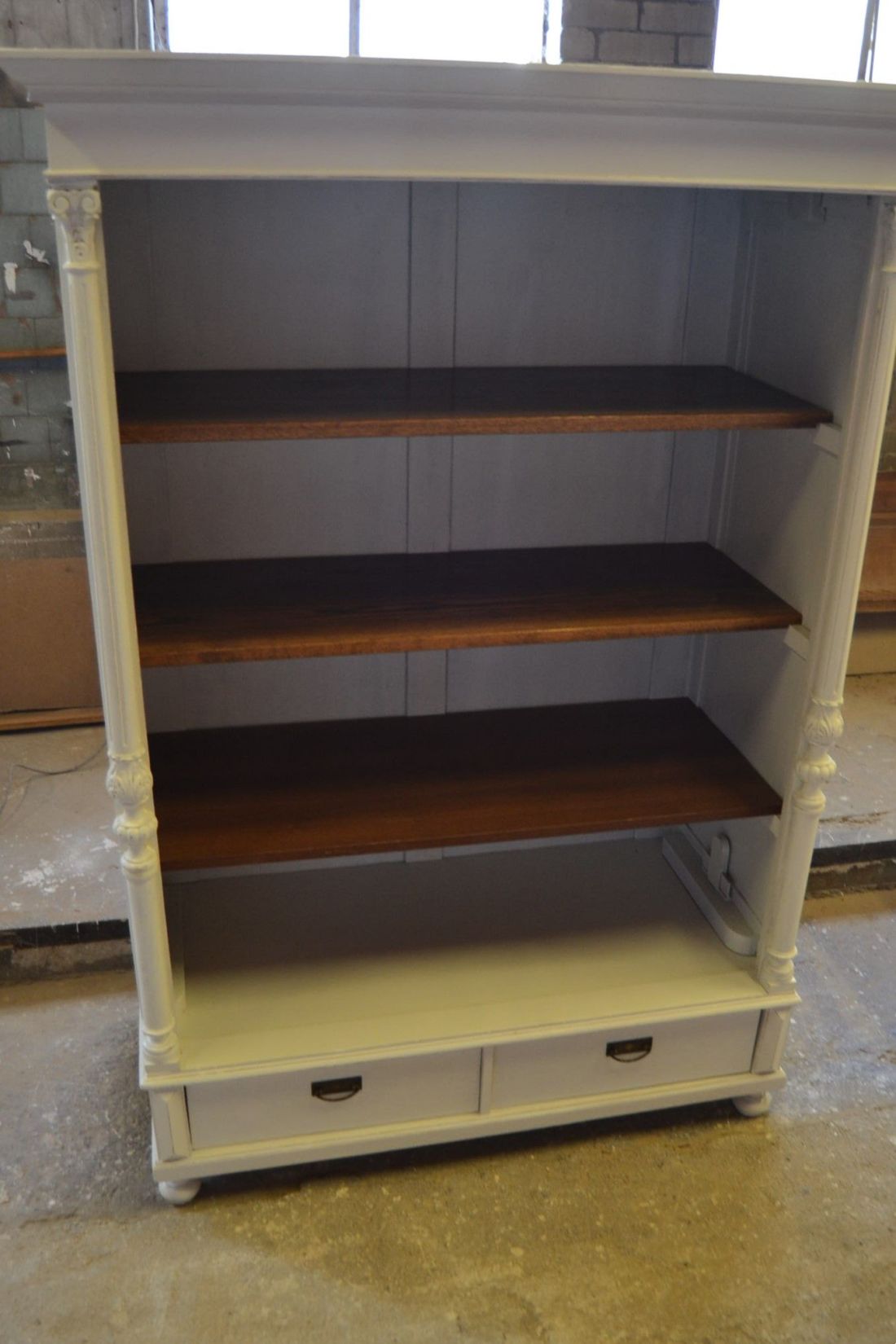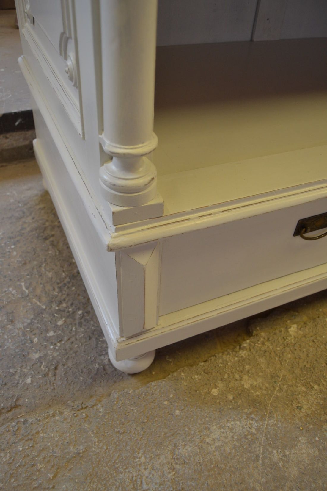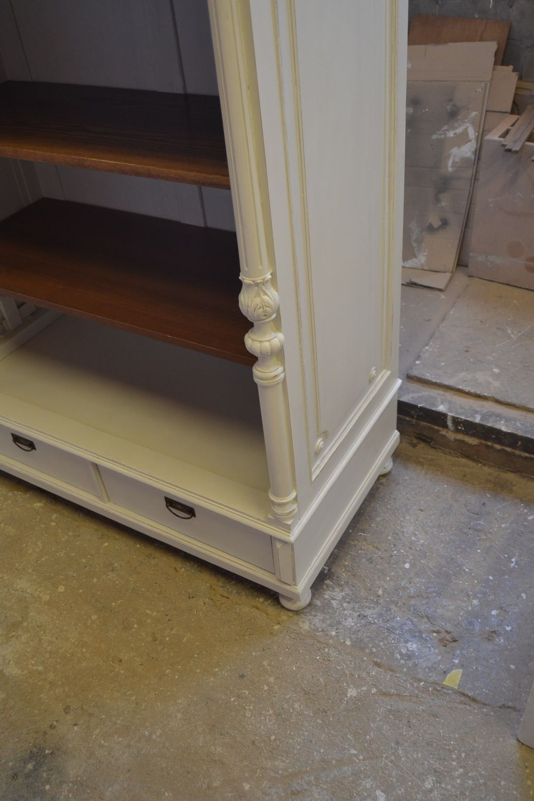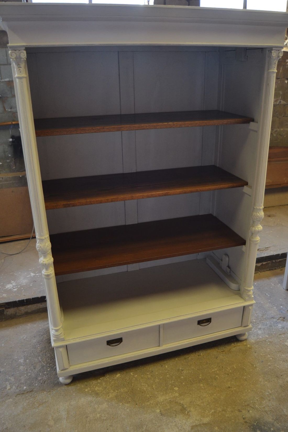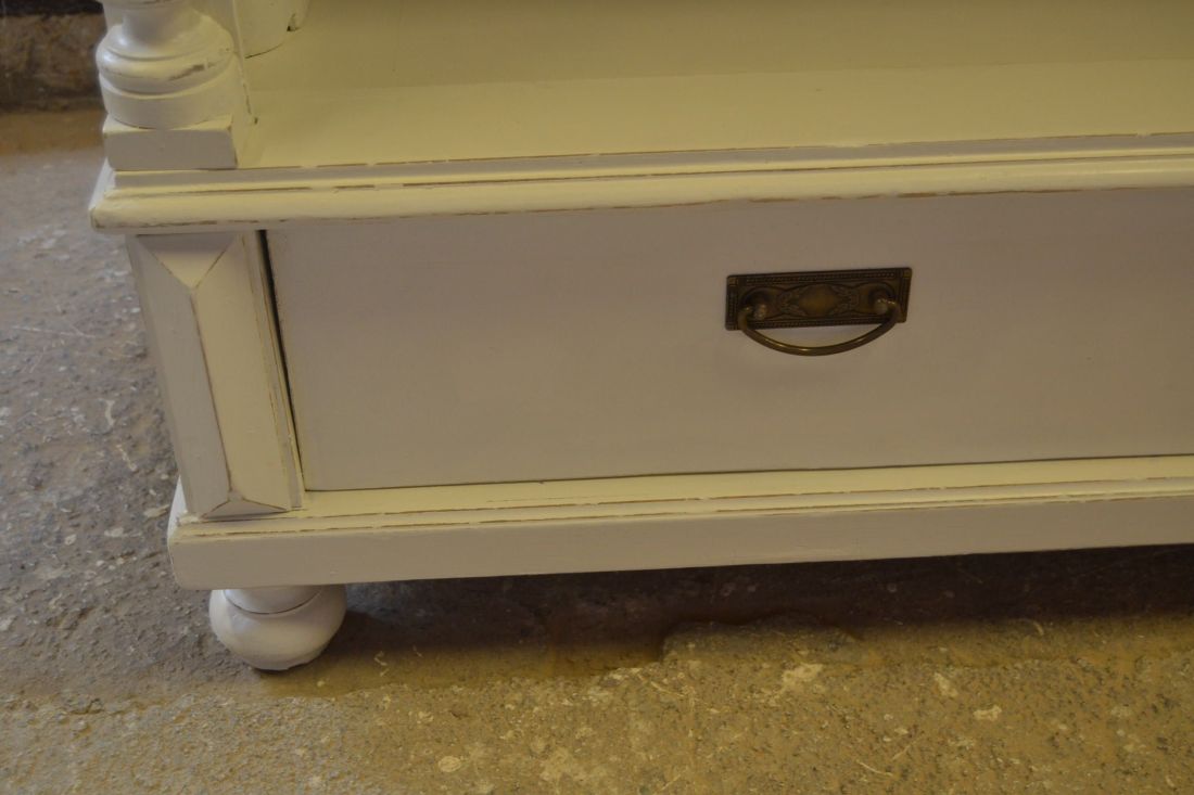 Mõõdud 1395 x 710, kõrgus 1990 mm. Vana kapp. Allosas 2 sahtlit. Ülal 3 tugevat laia riiulit. Kapp ise vana, valgeks värvitud, värv vanutatud, esineb kriime, täkkeid, toonierinevusi, ebatasasusi, kuivamispragusid, ebatasasusi, parandusjälgi. Riiulid ja sahtli käepidemed tänapäevased. Sobilik hästi ka raskemate esemete ladustamiseks, kauplusesse kauba väljapanekuks. Väga raske. Käib detailideks, iga detail eraldi, koos käib 4 kiiluga. Stabiilne. HINNAS EI SISALDU TRANSPORT