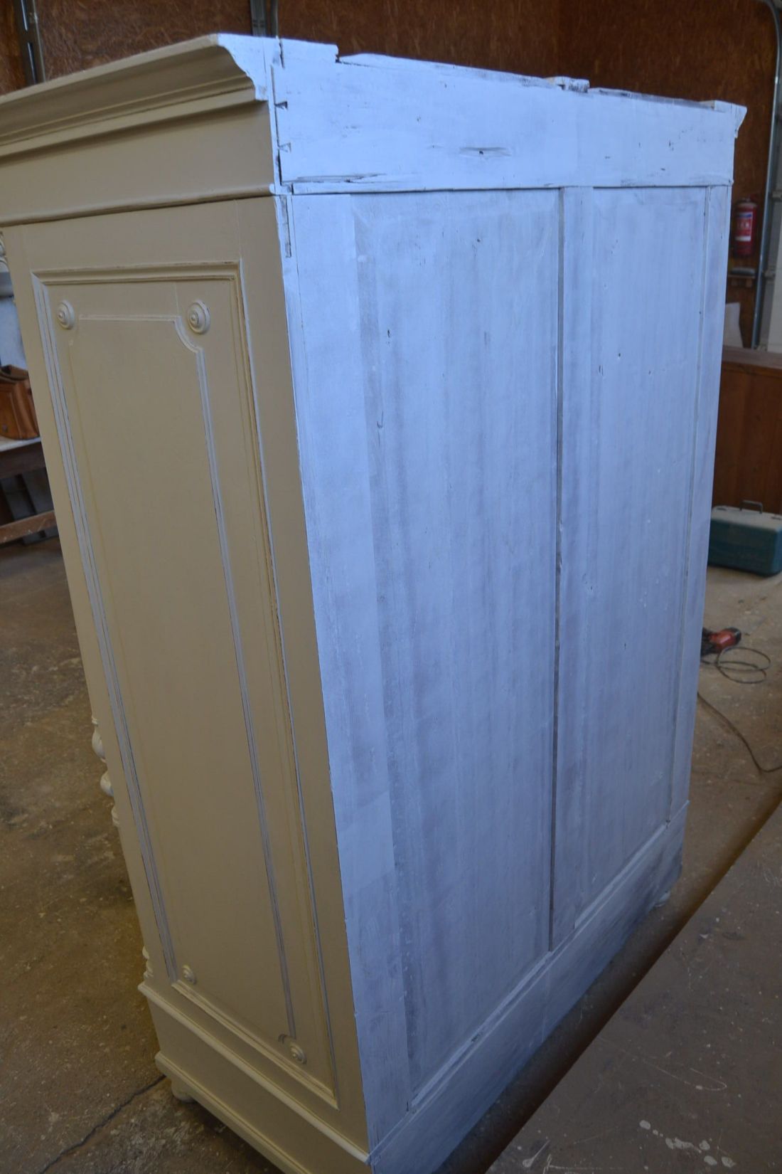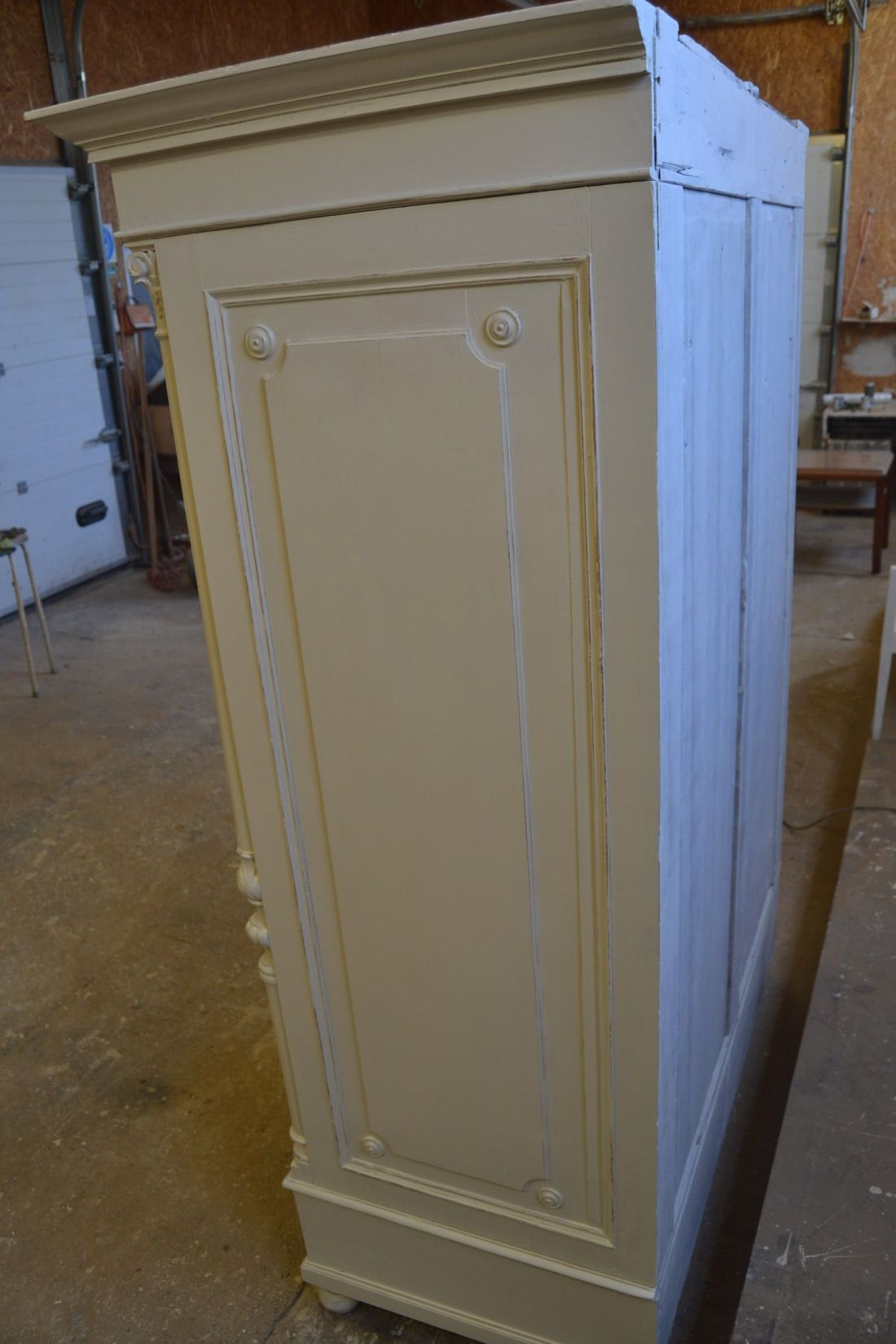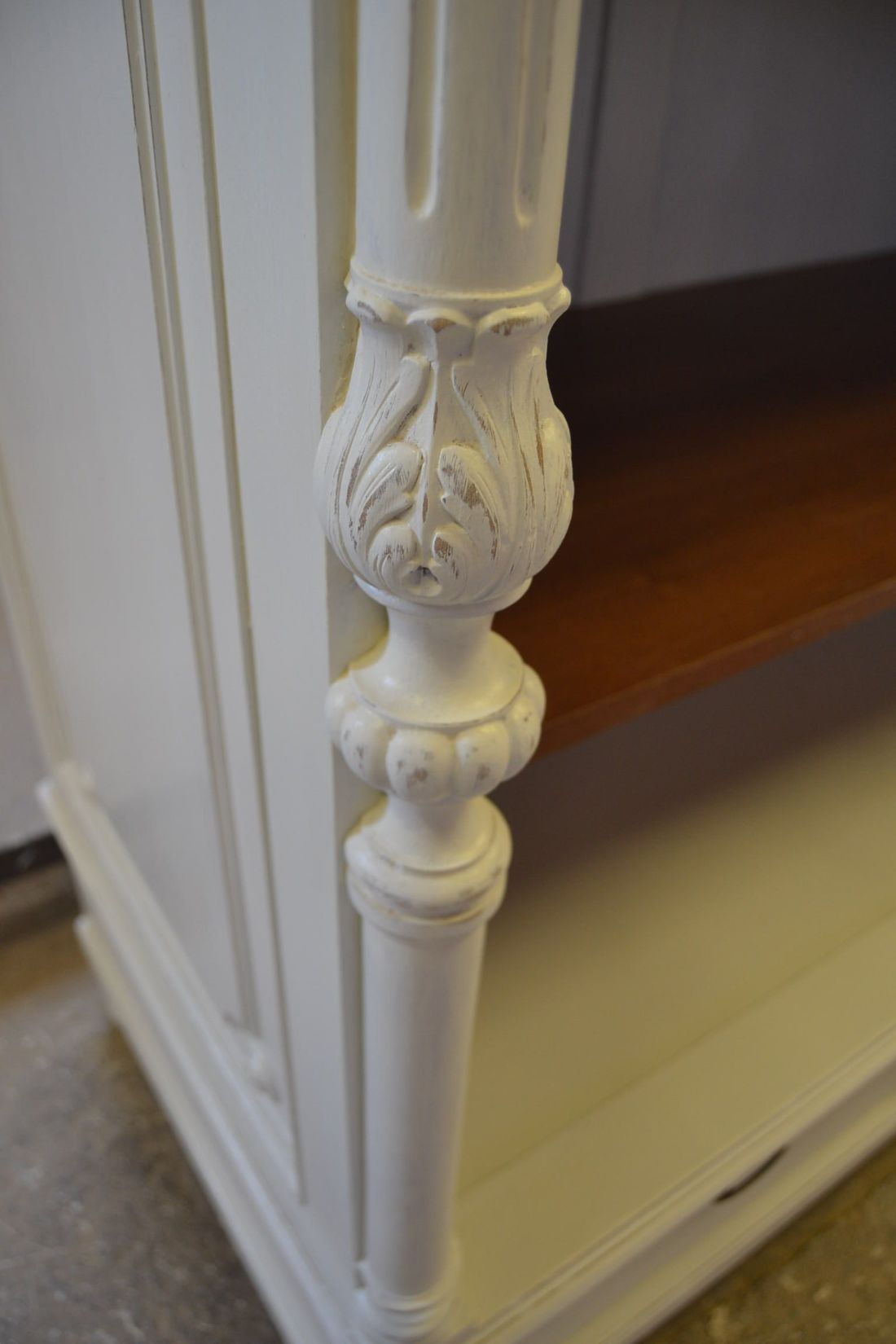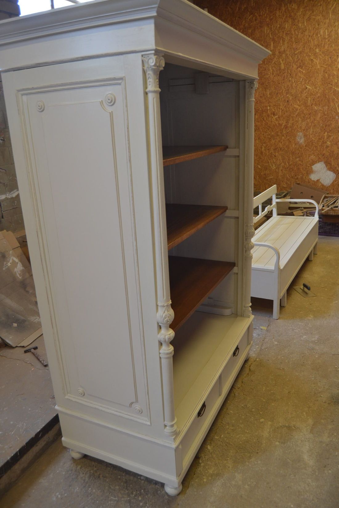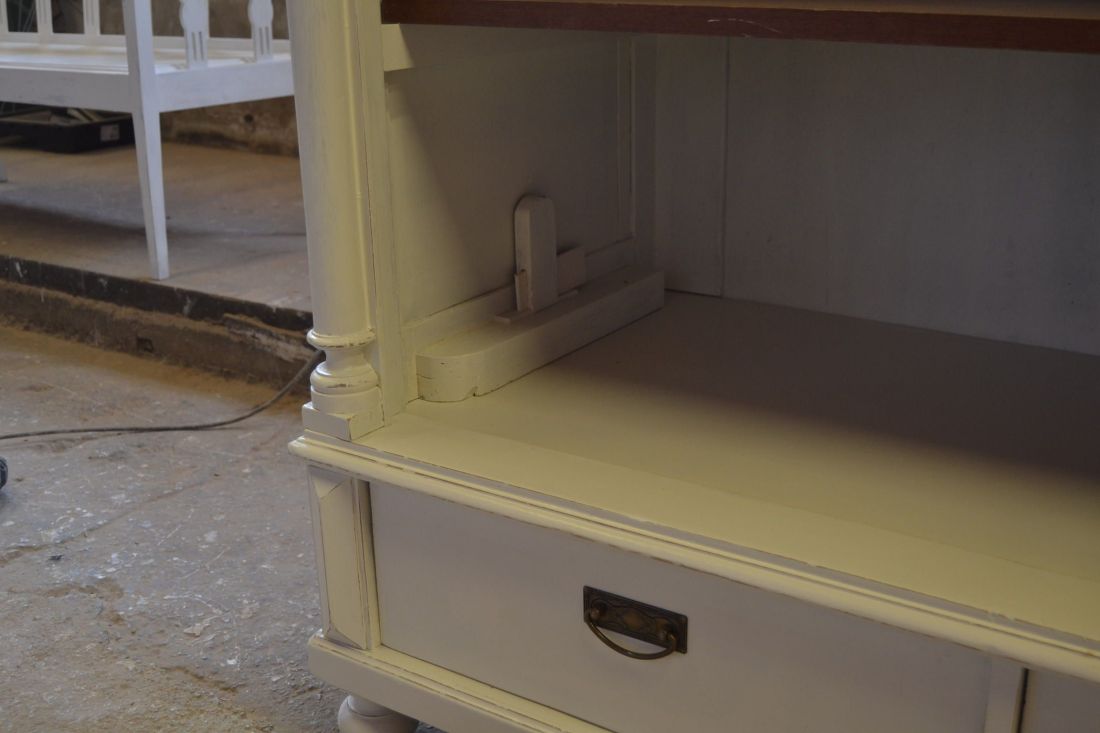 Mõõdud 1395 x 710, kõrgus 1990 mm. Vana kapp. Allosas 2 sahtlit. Ülal 3 tugevat laia riiulit. Kapp ise vana, valgeks värvitud, värv vanutatud, esineb kriime, täkkeid, toonierinevusi, ebatasasusi, kuivamispragusid, ebatasasusi, parandusjälgi. Riiulid ja sahtli käepidemed tänapäevased. Sobilik hästi ka raskemate esemete ladustamiseks, kauplusesse kauba väljapanekuks. Väga raske. Käib detailideks, iga detail eraldi, koos käib 4 kiiluga. Stabiilne. HINNAS EI SISALDU TRANSPORT