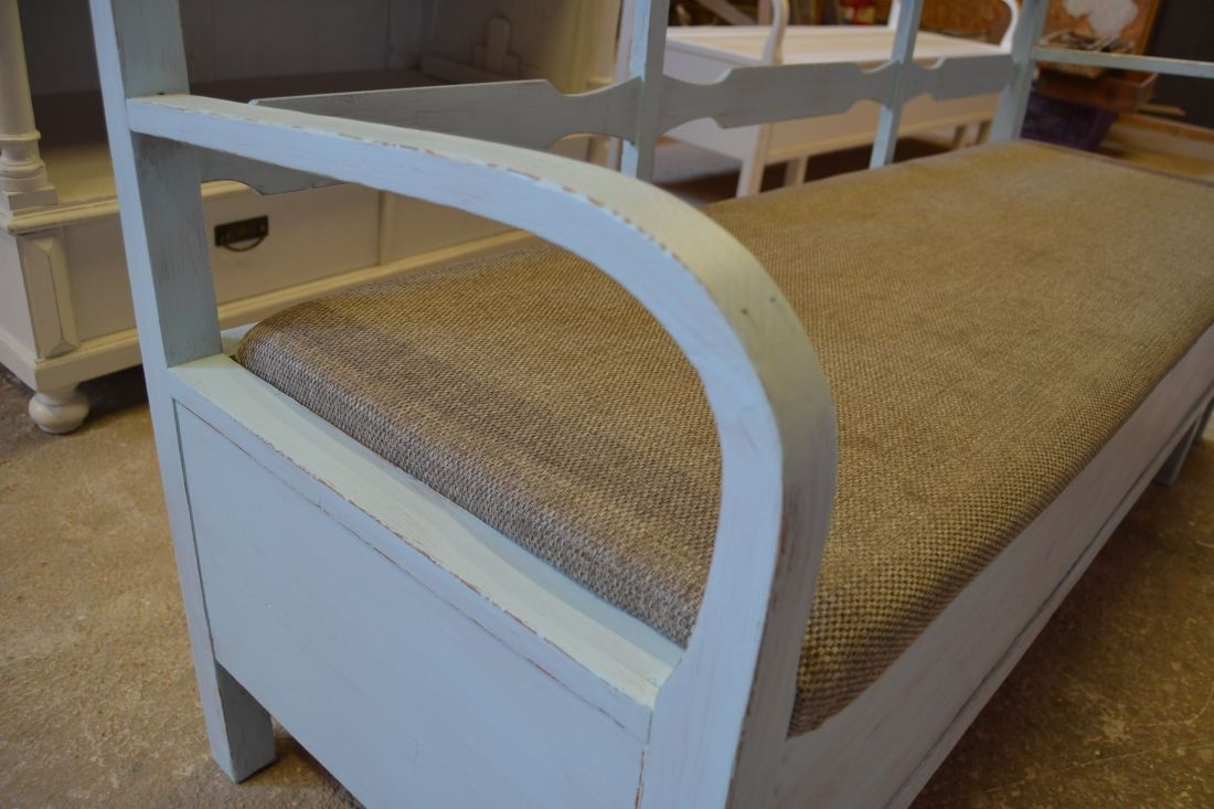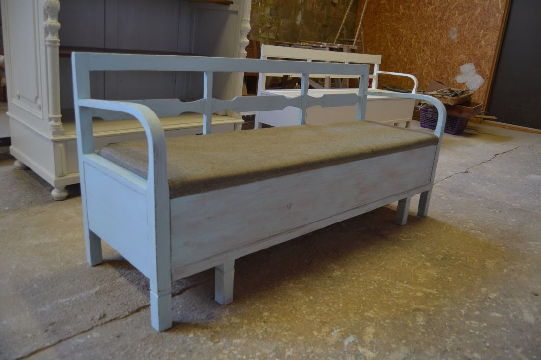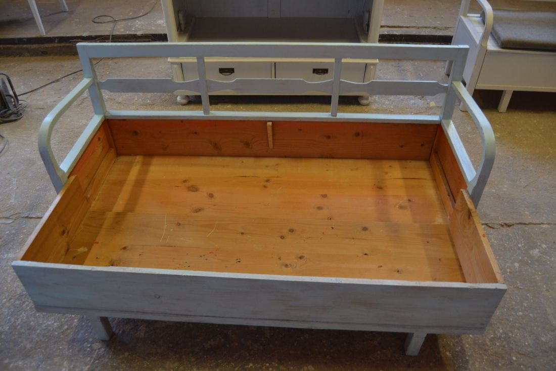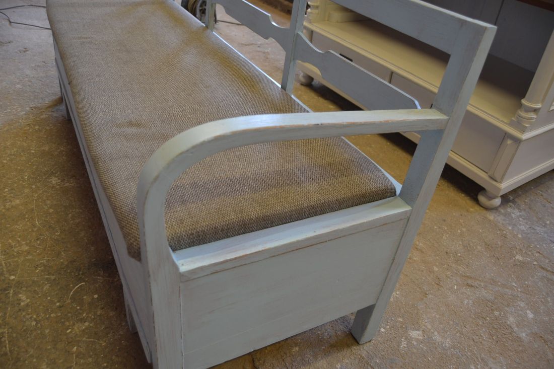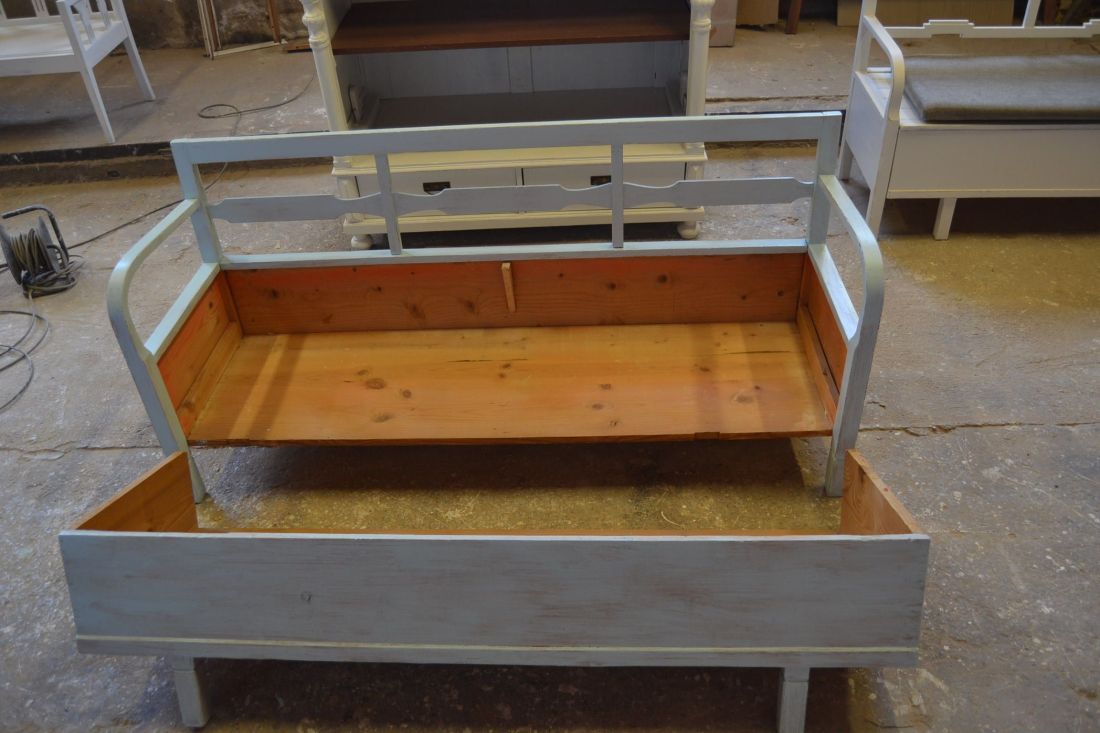Mõõdud 1665 x540, kõrgus 765, istumisosa maast 460 mm. Vana raske puidust pink. Istumisosa pehmendusega, hallika kangaga, võib vajada puhastust. Istumisosa eemaldatav, selle all panipaik mida saab ka ette poole välja tõmmata. Pink helesinist tooni, värv vanutatud, ebaühtlane, esineb kriime, täkkeid, toonierinevusi, kasutustunnuseid, killuvigu. Transpordiks saab võtta kolmeks osaks.