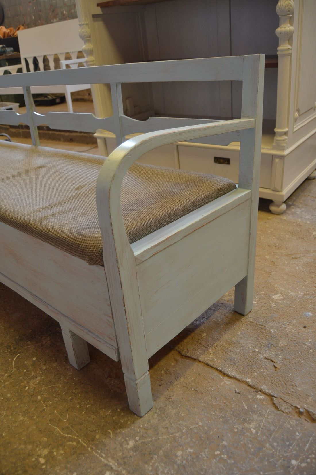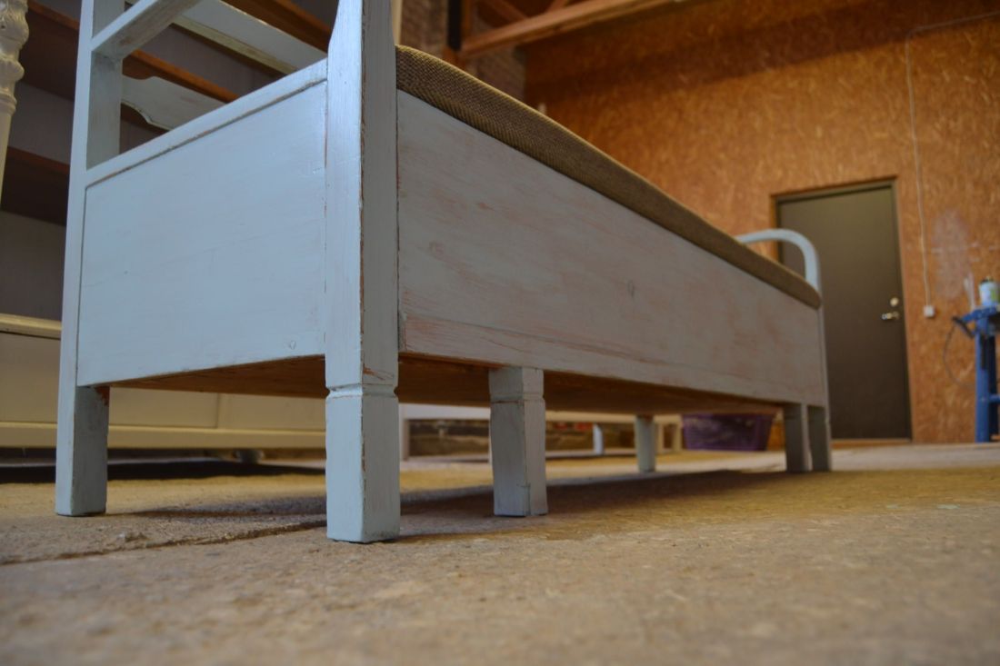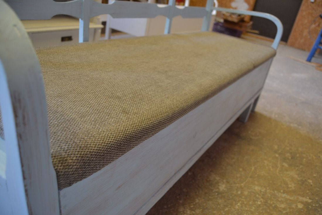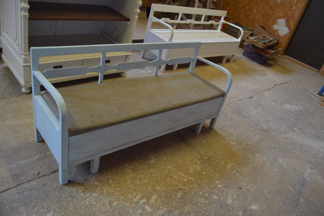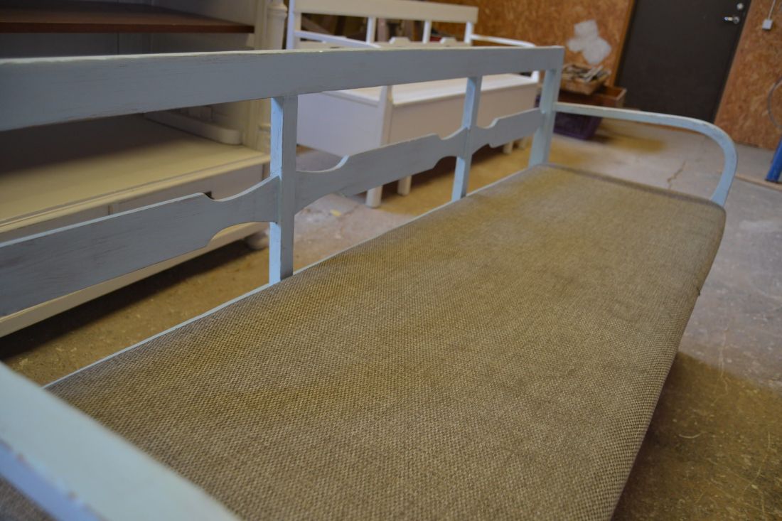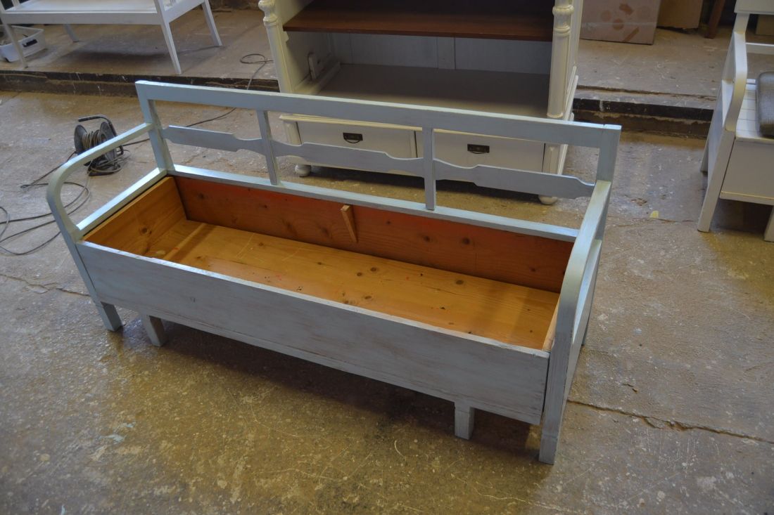 Mõõdud 1665 x540, kõrgus 765, istumisosa maast 460 mm. Vana raske puidust pink. Istumisosa pehmendusega, hallika kangaga, võib vajada puhastust. Istumisosa eemaldatav, selle all panipaik mida saab ka ette poole välja tõmmata. Pink helesinist tooni, värv vanutatud, ebaühtlane, esineb kriime, täkkeid, toonierinevusi, kasutustunnuseid, killuvigu. Transpordiks saab võtta kolmeks osaks.