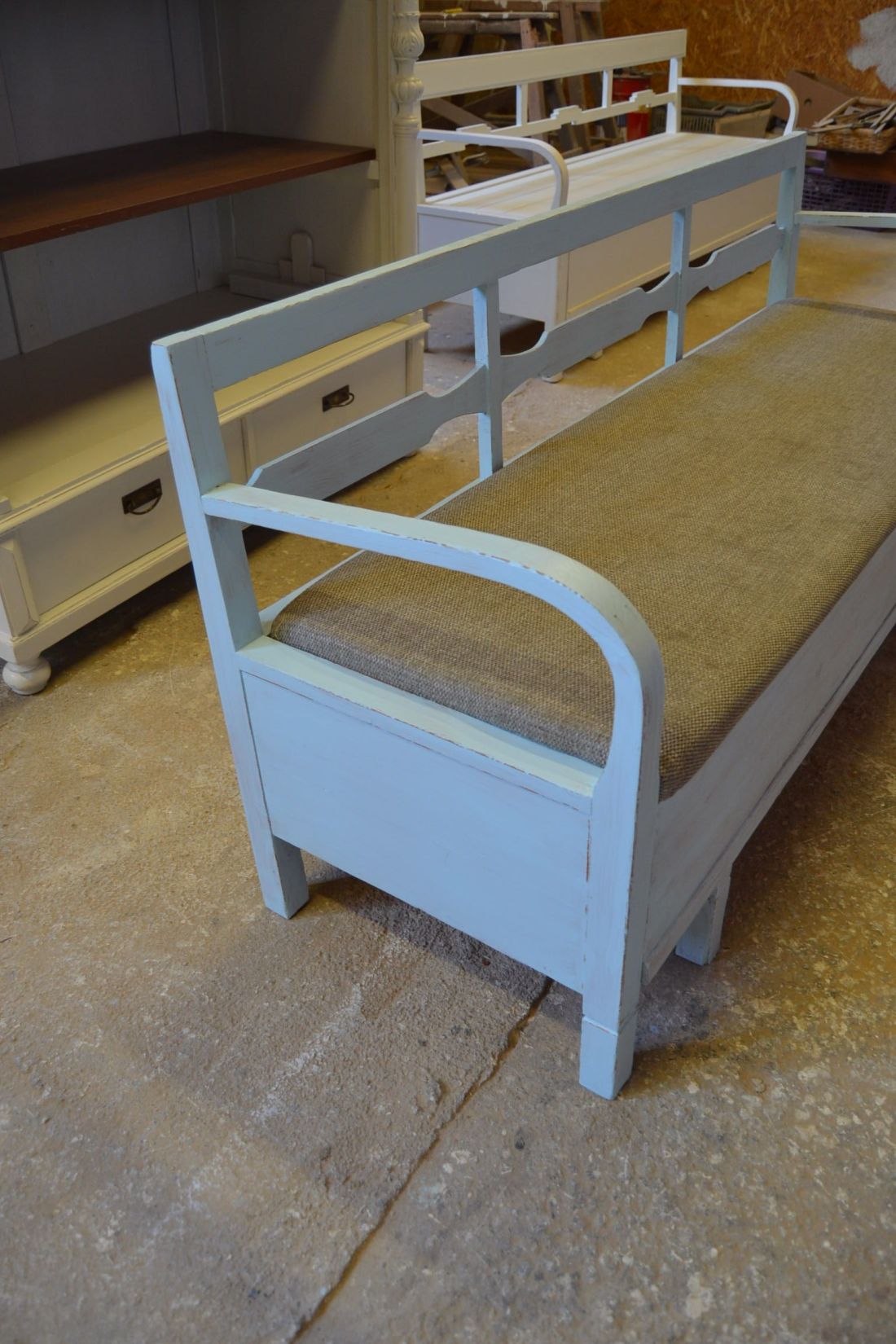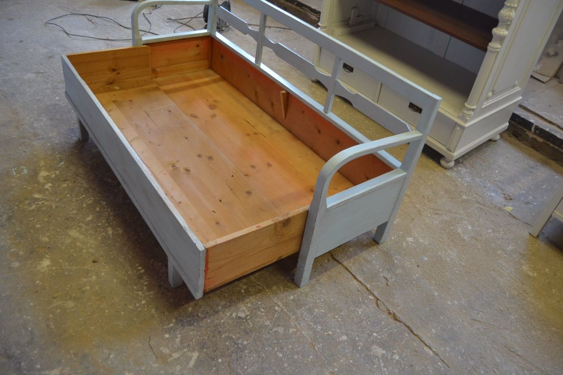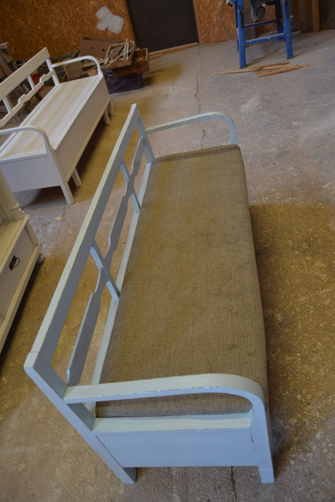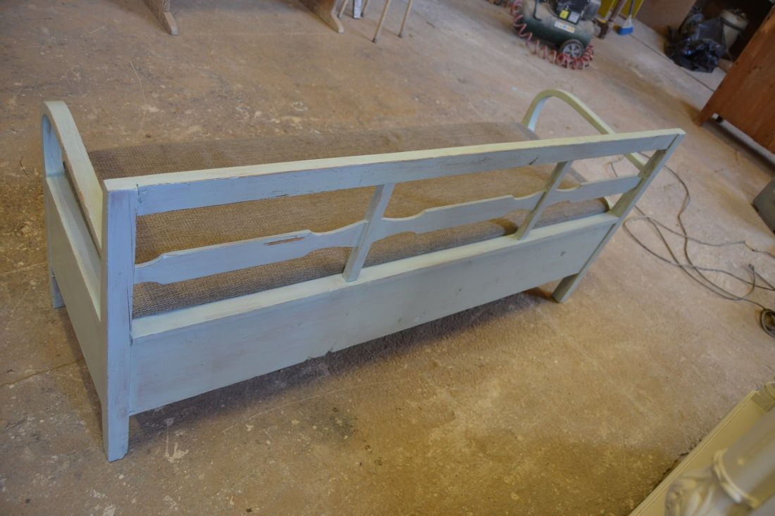 Mõõdud 1665 x540, kõrgus 765, istumisosa maast 460 mm. Vana raske puidust pink. Istumisosa pehmendusega, hallika kangaga, võib vajada puhastust. Istumisosa eemaldatav, selle all panipaik mida saab ka ette poole välja tõmmata. Pink helesinist tooni, värv vanutatud, ebaühtlane, esineb kriime, täkkeid, toonierinevusi, kasutustunnuseid, killuvigu. Transpordiks saab võtta kolmeks osaks.